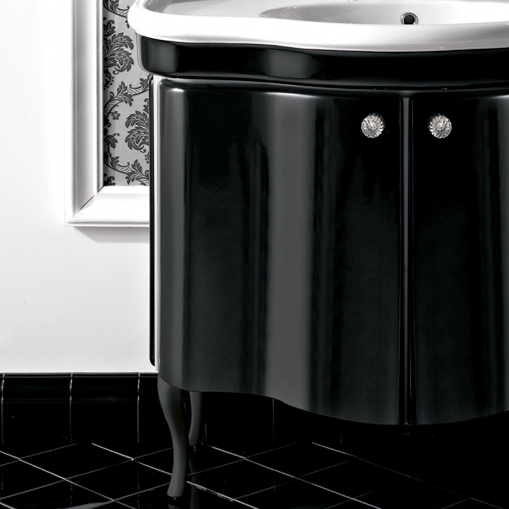 Dulap baie din MDF cu două uși lăcuite lucios bicolor închis și structură perla , cu chiuvetă ceramică albă bicoloră cu margine ceramică închisă. Butoanele și chiuveta din alamă sunt incluse.