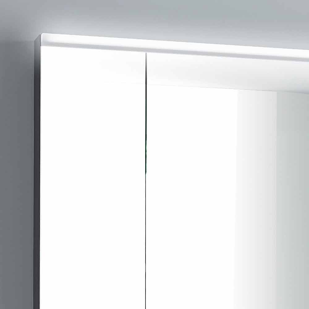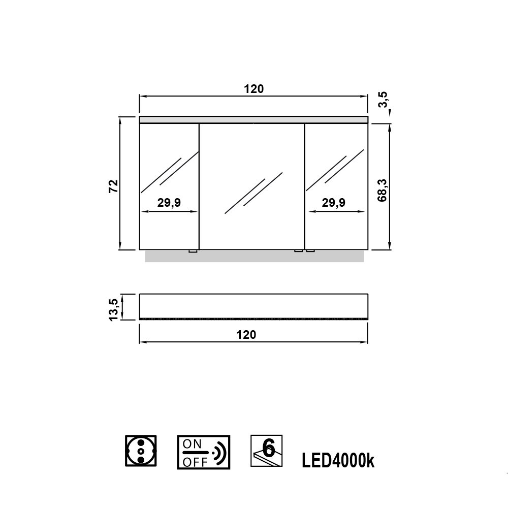 Dulap cu 3 usi oglindă. O linie subțire de lumină caracterizează profilul de cabinet pentru a oferi o iluminare perfectă frontală. Integrat în structura de sus și partea de jos a ambientului plin iluminat puterea luminoasă a acestei oglinzi controlate de un senzor. Convenabil deschiderea ușilor printr-un mâner din oțel cromat. Structura în FENIX, material polimeric cu un tratament nano tehnologic, hidrofug, anti-amprente și moale la atingere. Livrat cu priza si comutator.