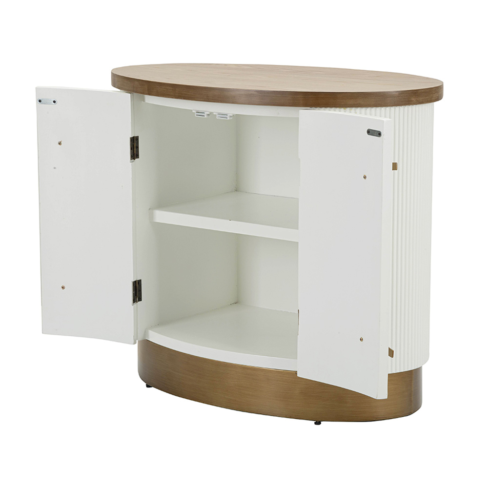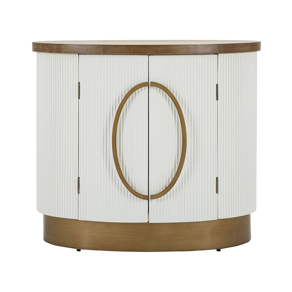 Canelura ingenioasă a ușilor adaugă un joc delicat de lumini și umbre, în timp ce mânerele circulare introduc o notă de rafinament . Această piesă de mobilier oferă nu doar un punct de interes estetic, ci și o capacitate abundentă de depozitare, făcându-l pe cât de practic, pe atât de frumos.