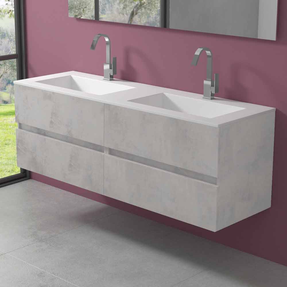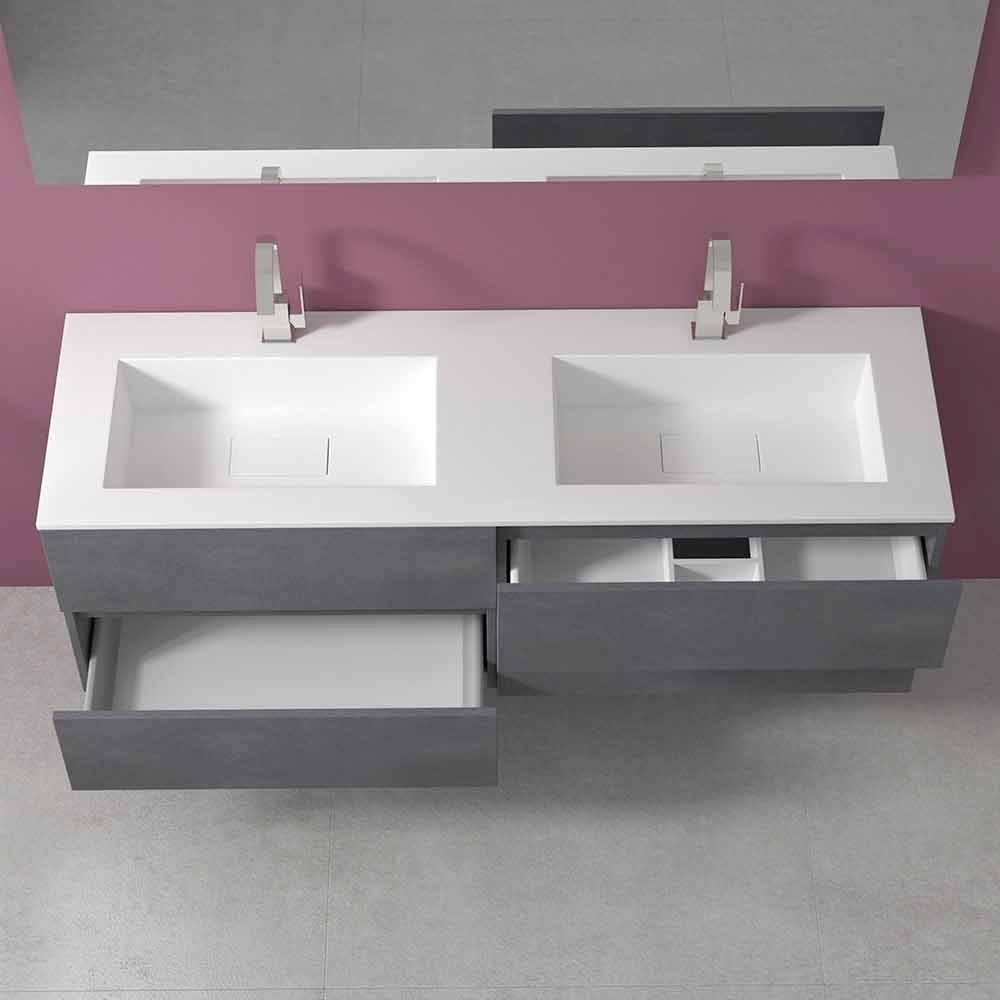 Acest mobilier de baie suspendat cu chiuvetă dublă integrată oferă o atmosferă primitoare și extrem de elegantă.