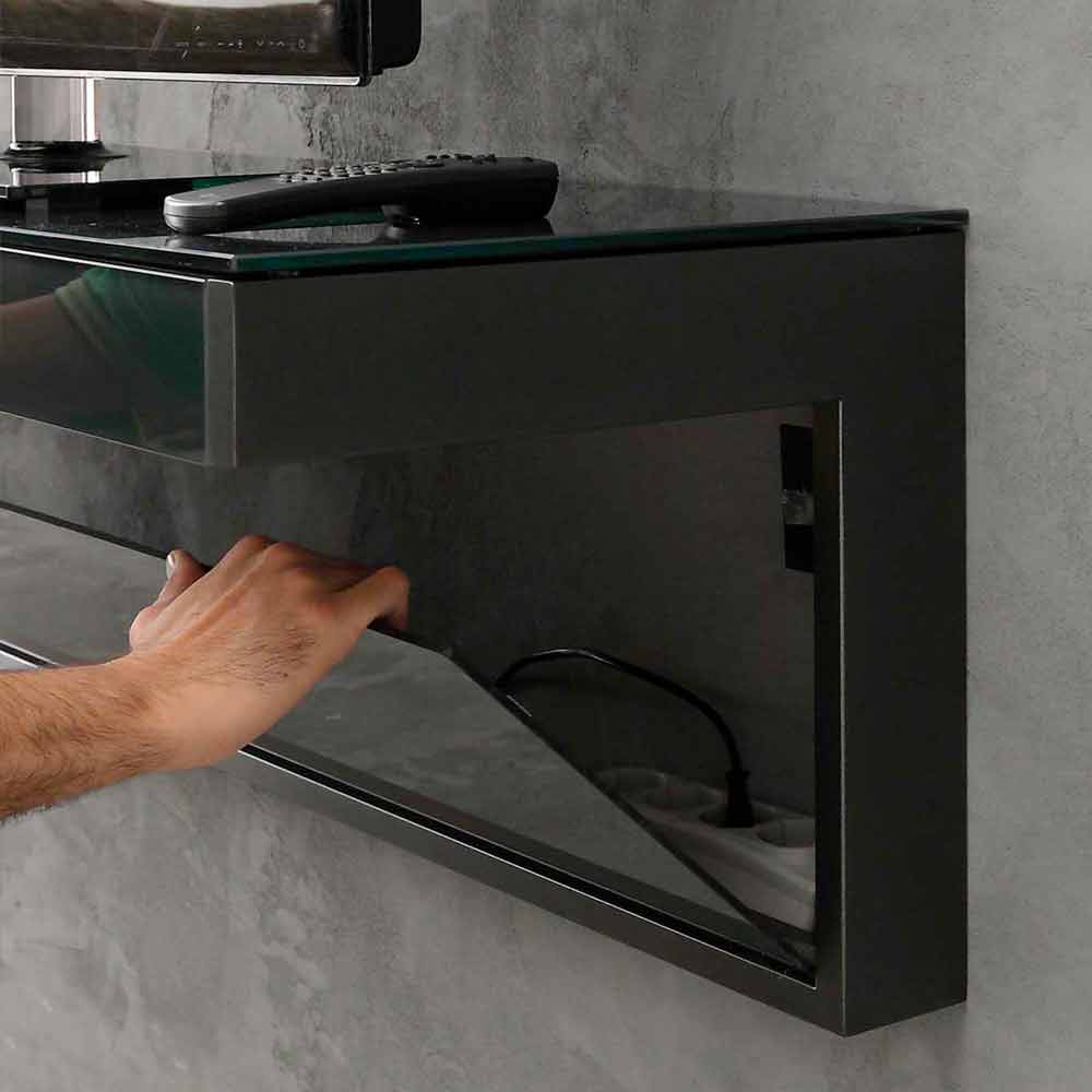 Dulap TV exclusiv suspendat (montare pe perete) fabricat în Italia cu blat din sticlă neagră lucioasă cu orificiu pentru cablu, structură metalică vopsită în negru mat și panou vertical din plexiglas amovibil. De asemenea, este completat cu un sertar frontal detașabil poziționat sub partea superioară.
