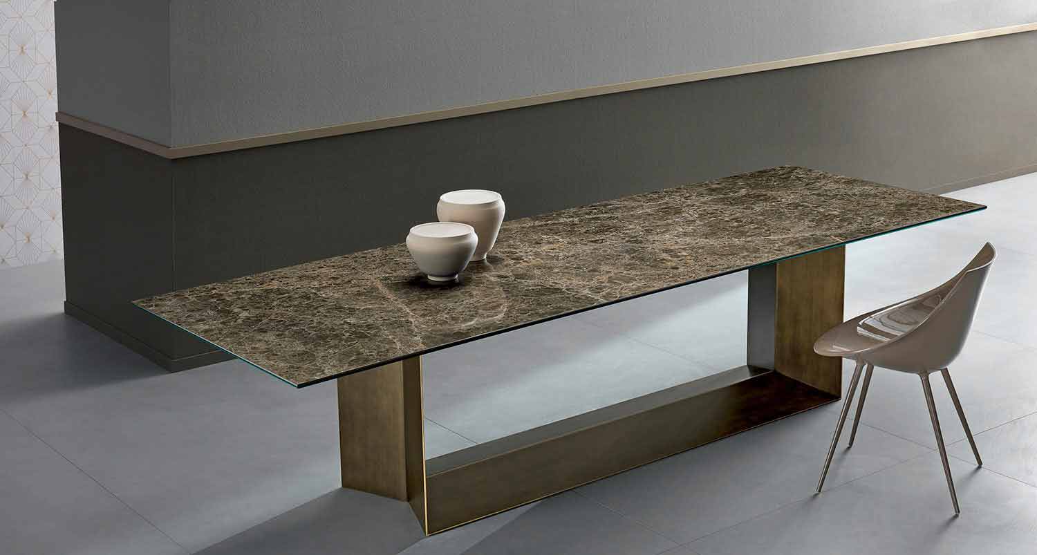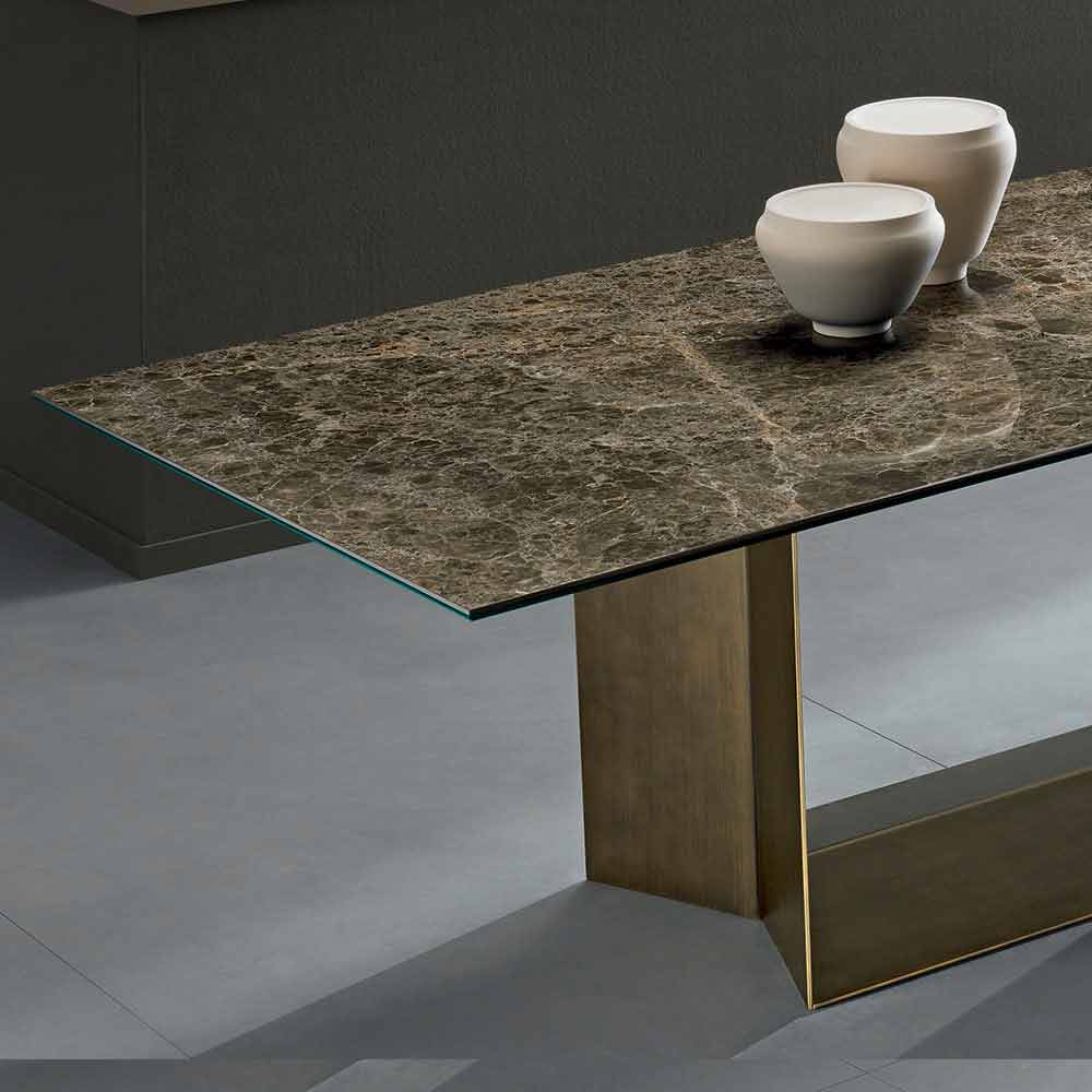 Masă de bucătărie de lux, cu blat din ceramică lustruită Emperador și bază metalică din bronz periat, realizată în Italia.