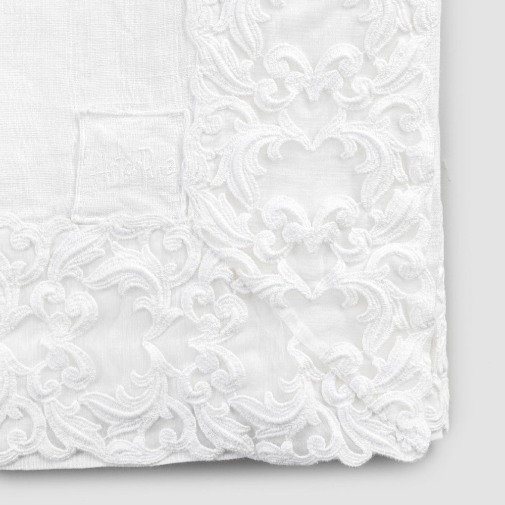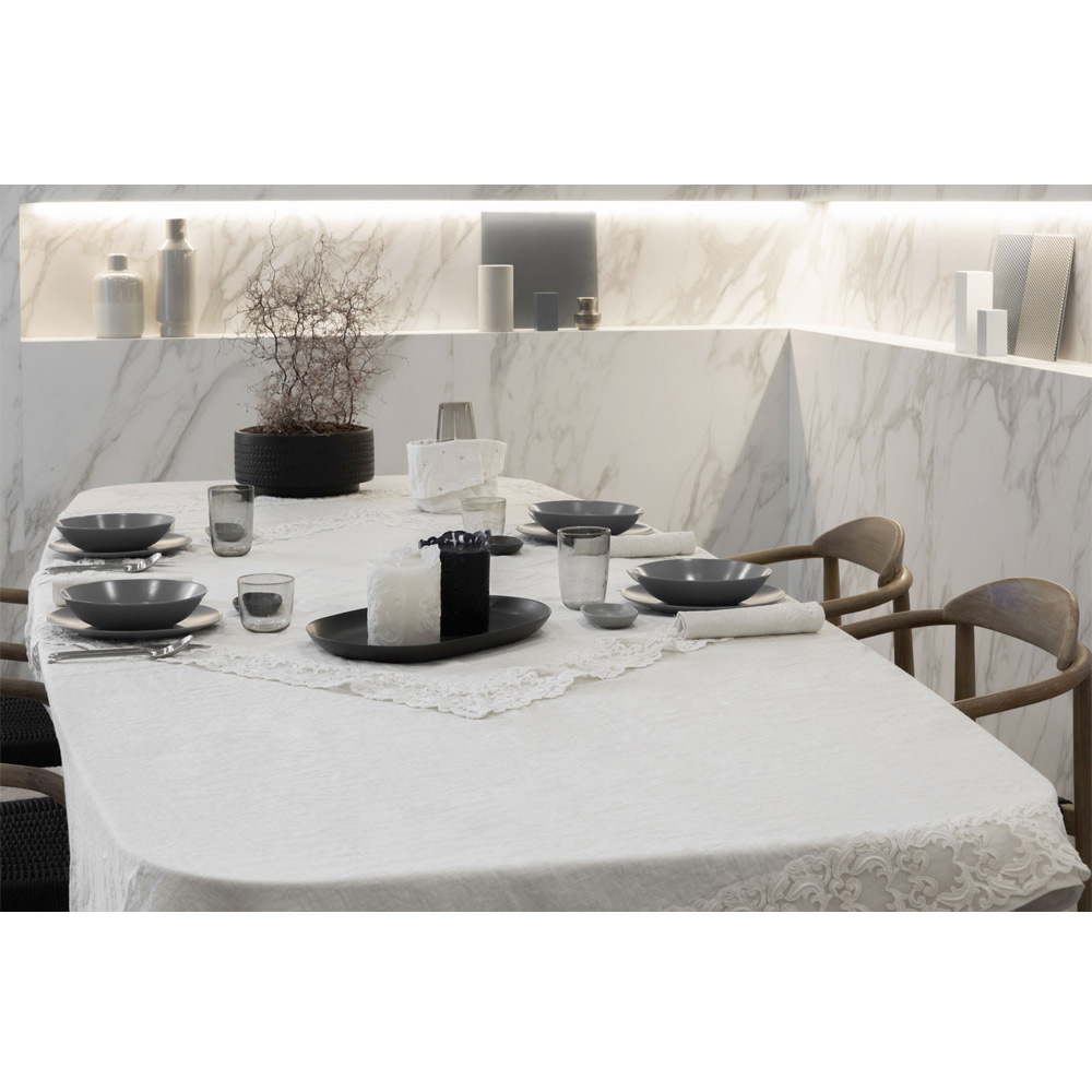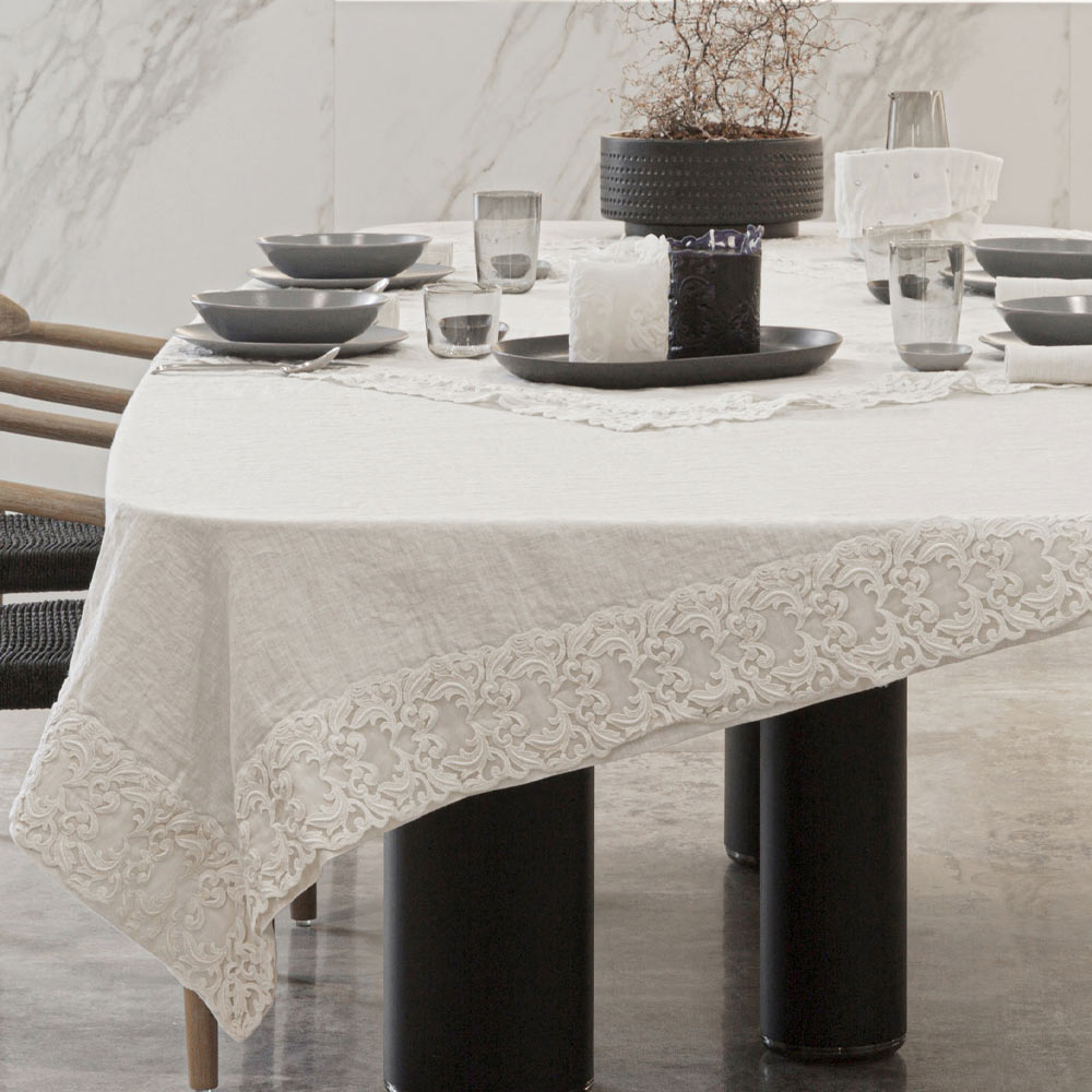 Fata de masa dreptunghiulara din in greu, cu rama si dantela Farnese, fabricata in Italia.