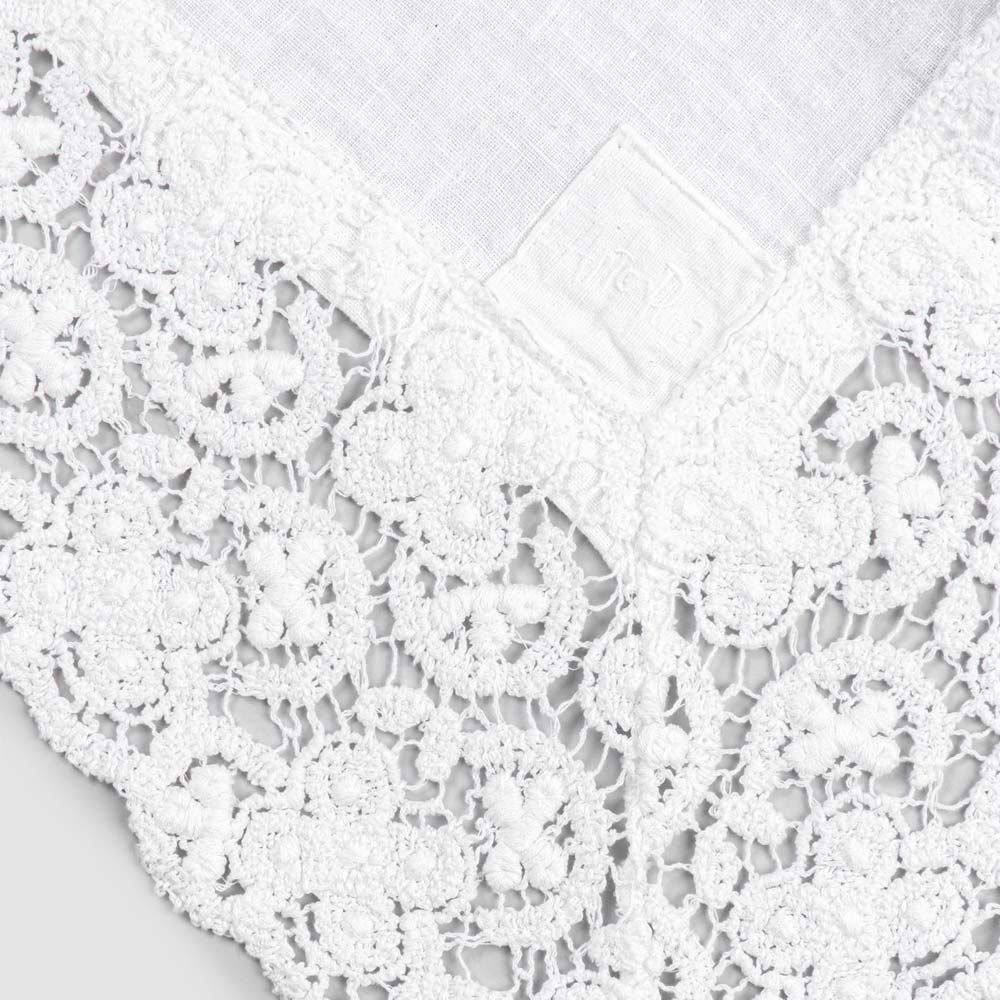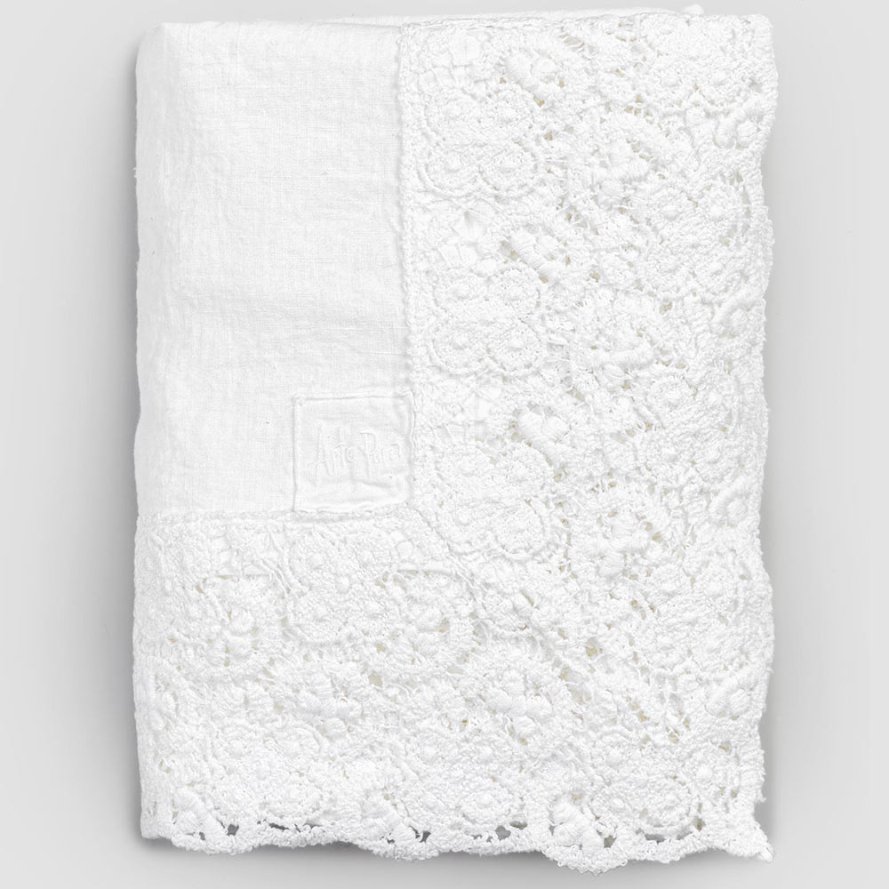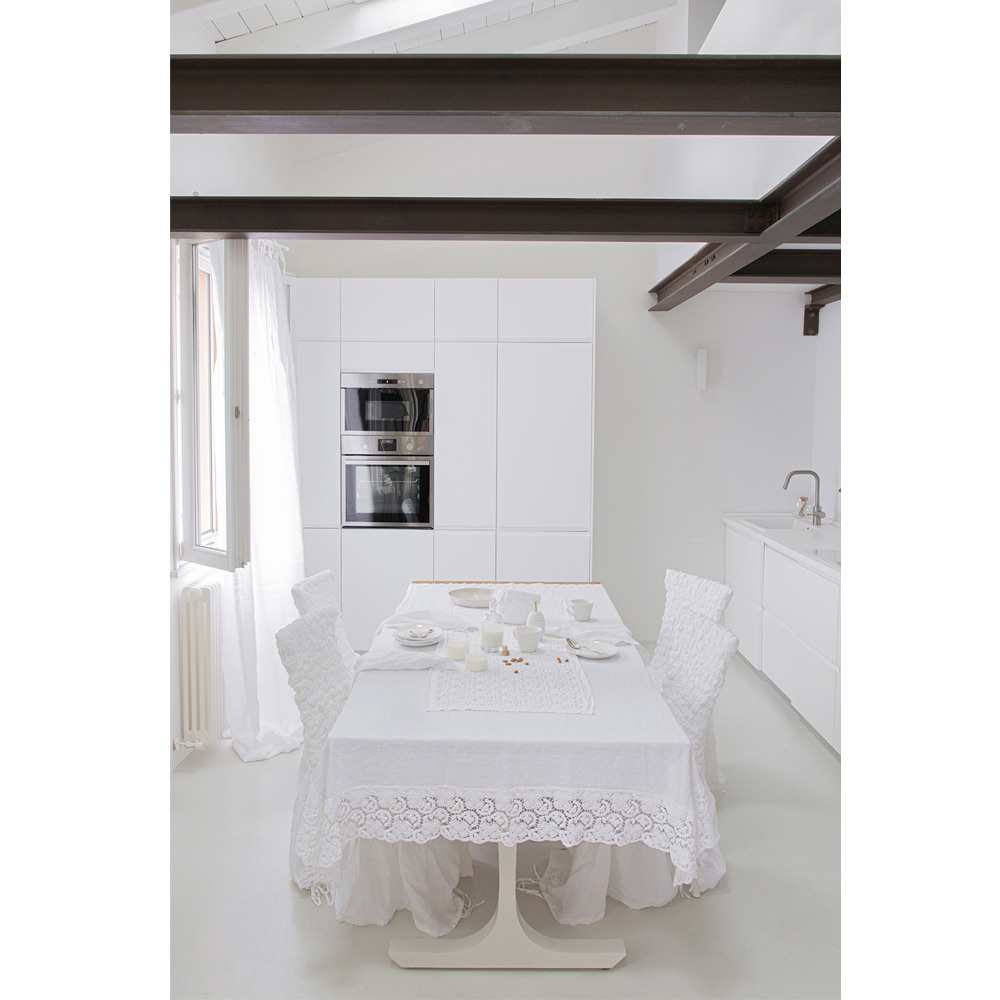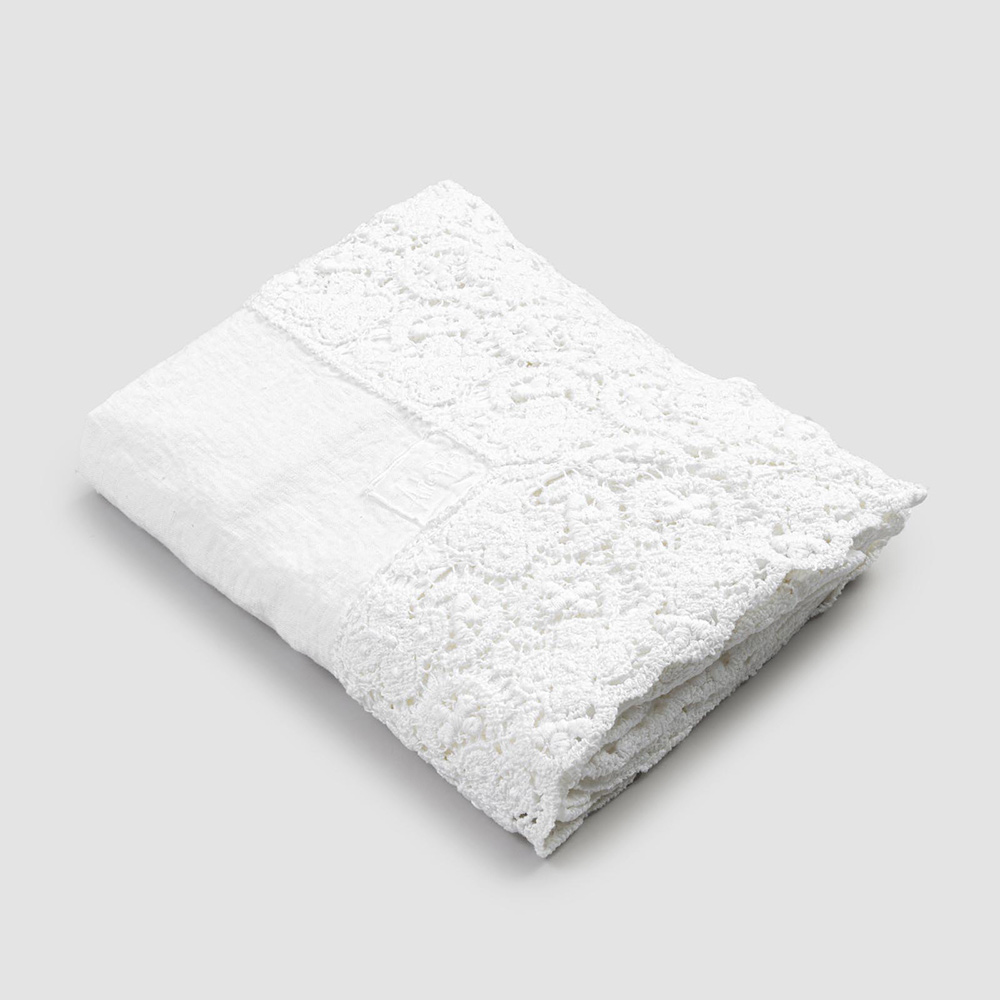 Fata de masa din in alb pur, cu dantela, design de lux de inalta calitate fabricat in Italia.