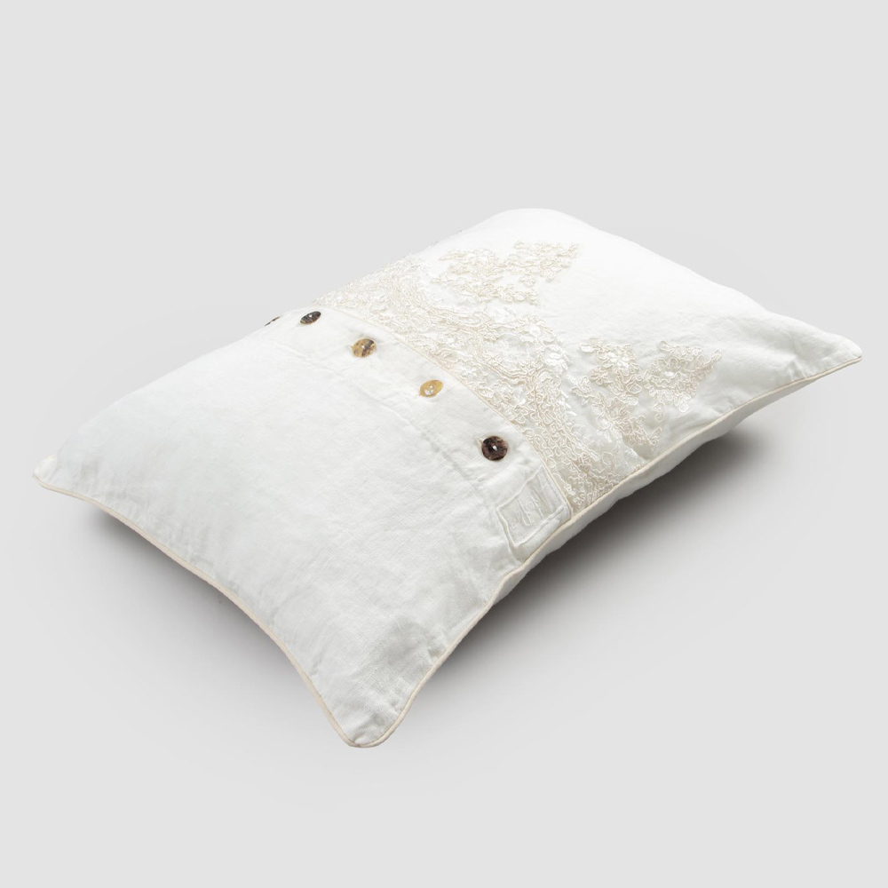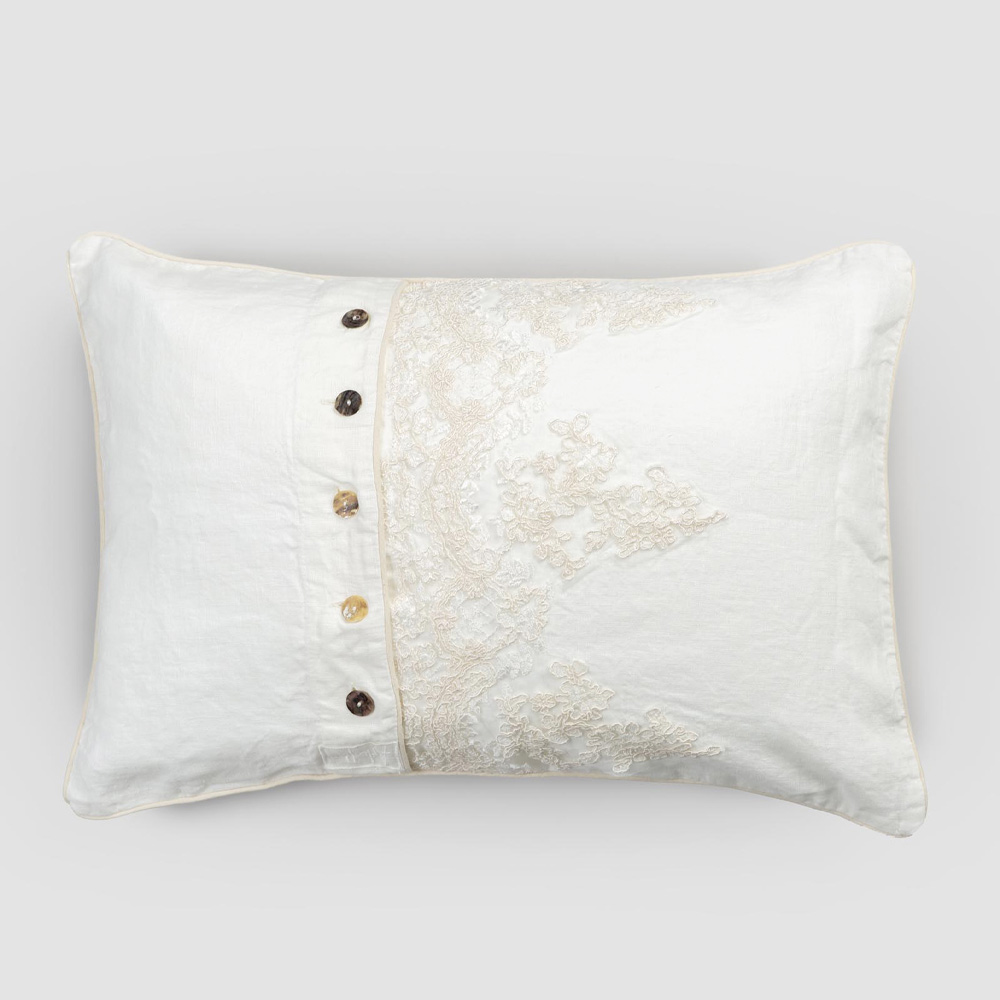 Valoarea tradiției se alătură stilului de viață modern cu această față de pernă naturală din in alb, înfrumusețată cu un rând central de nasturi Agoya în sidef și dantelă elegantă , profil de țevi .