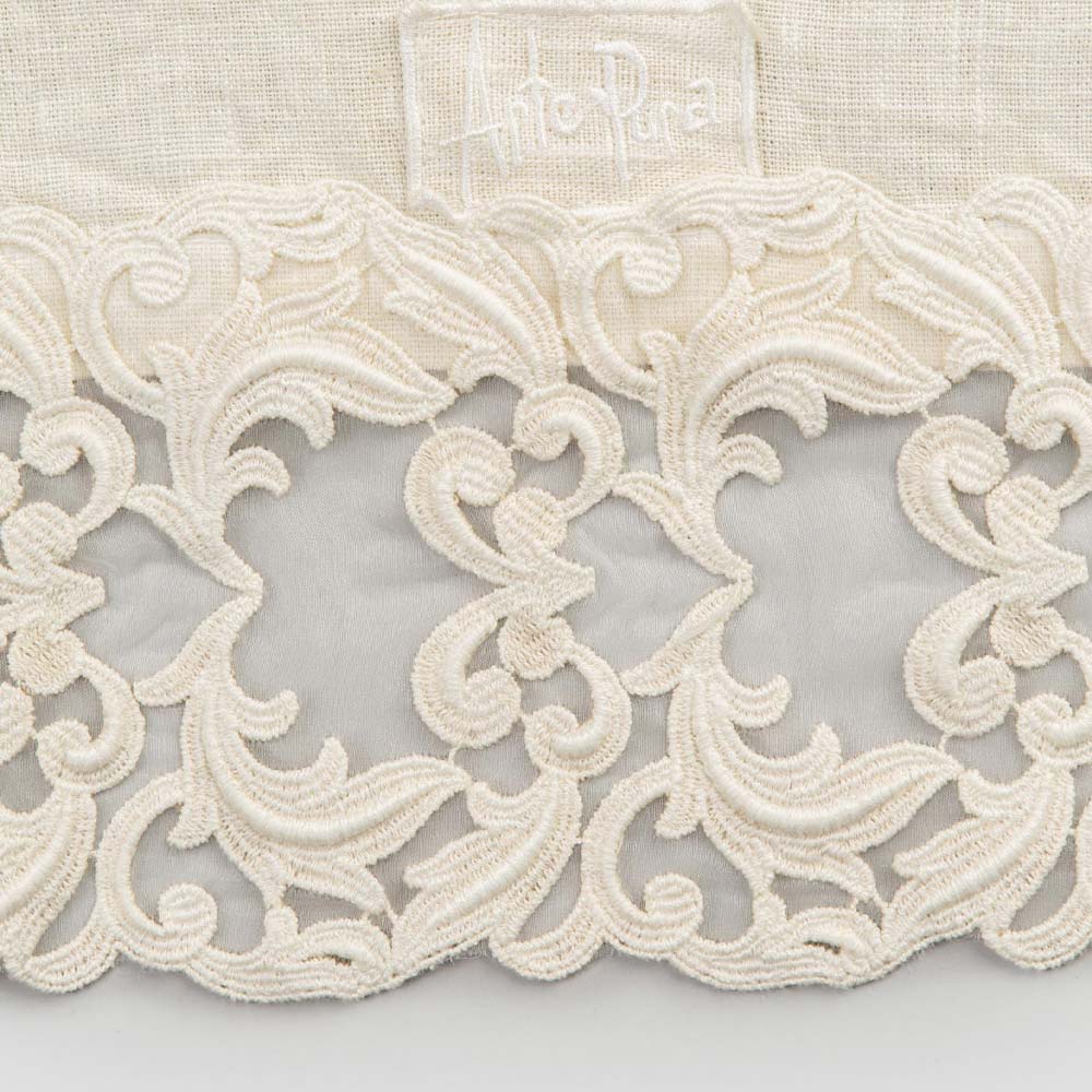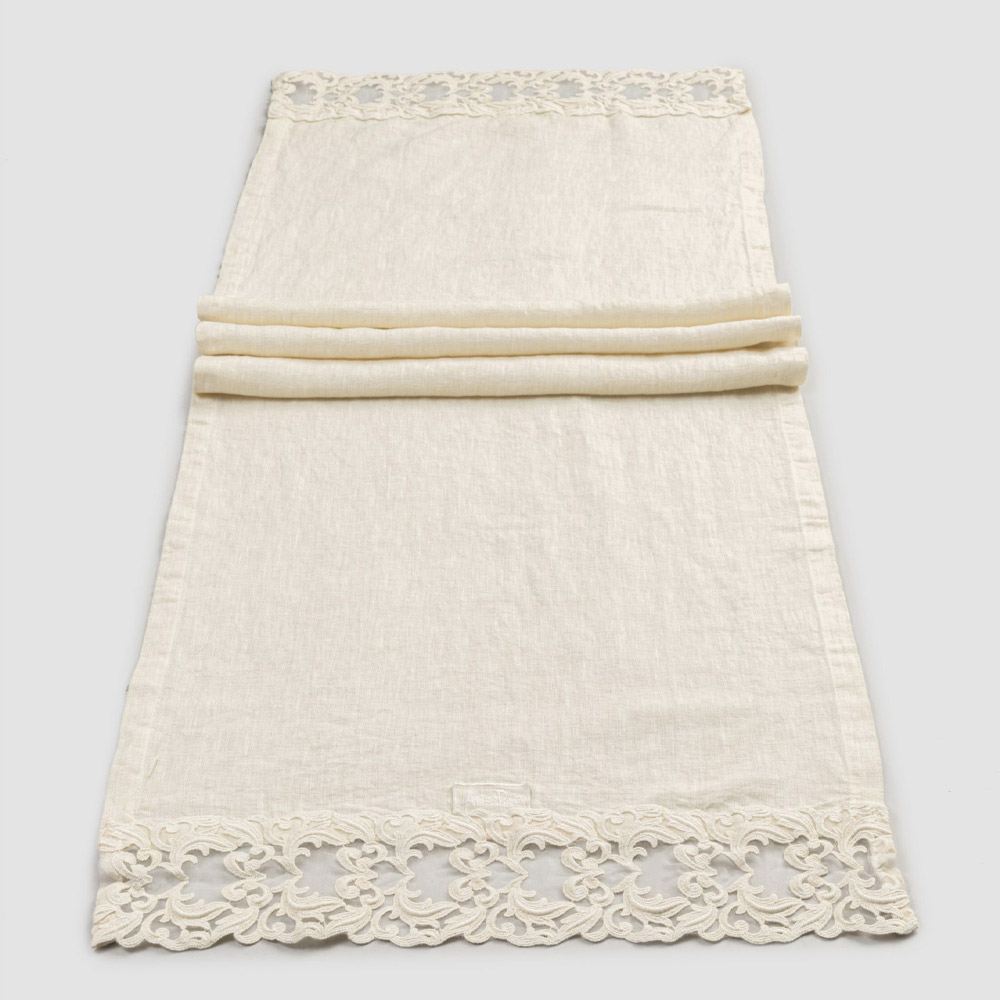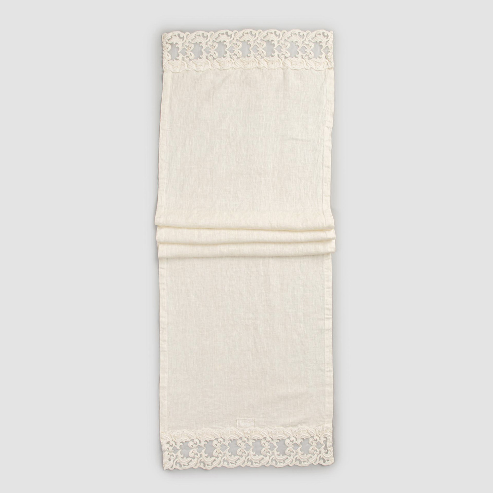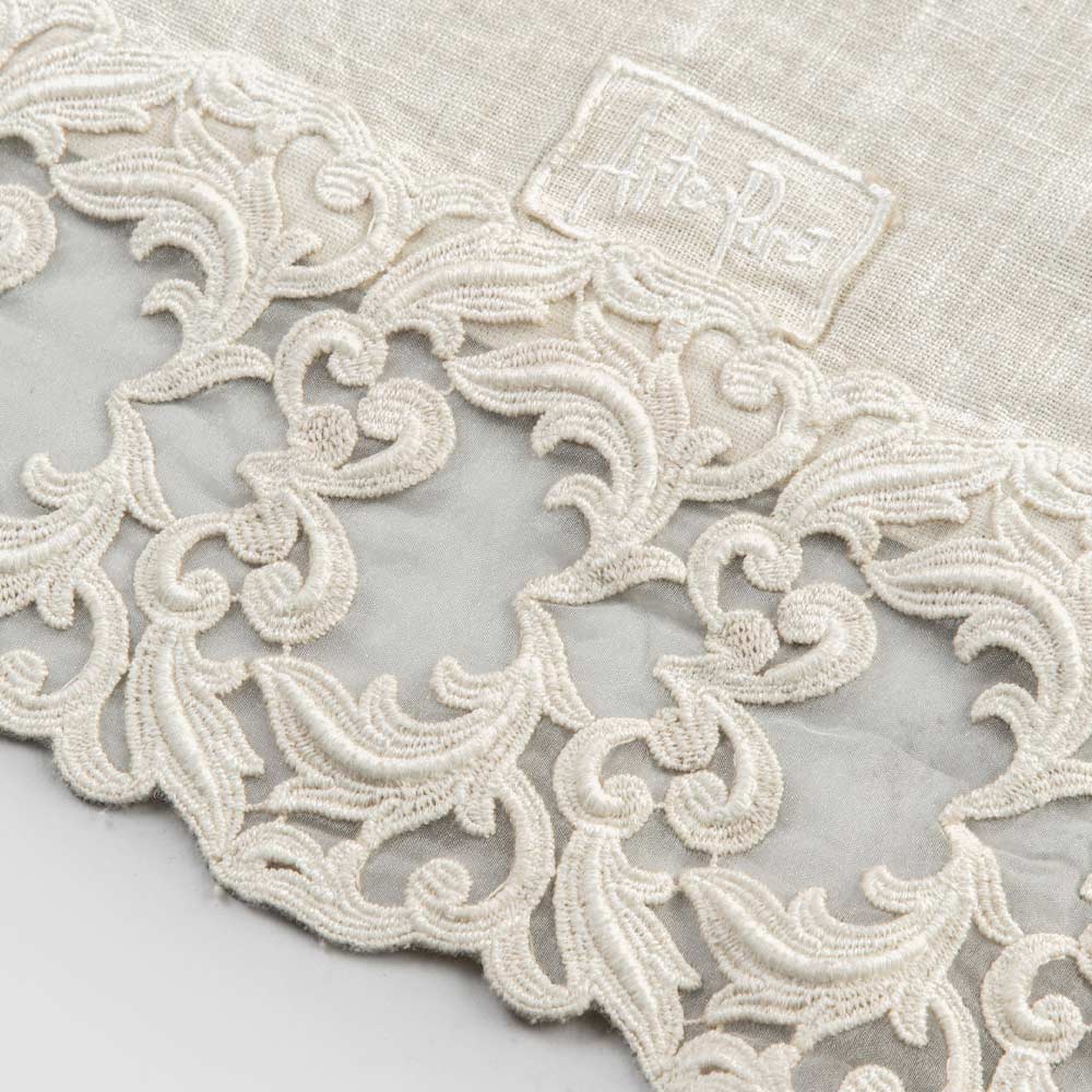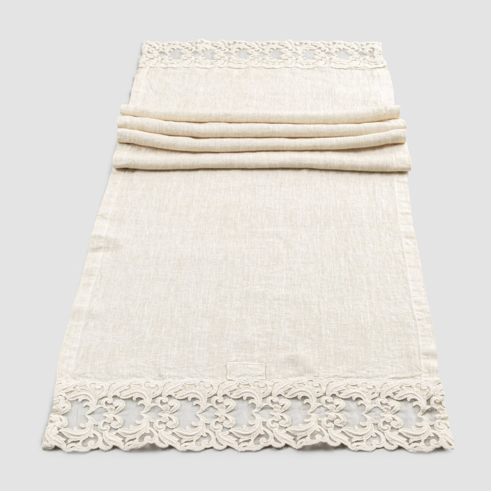 Alergător de masă din in greu, cu dantelă și margine pliată, lux fabricat în Italia.