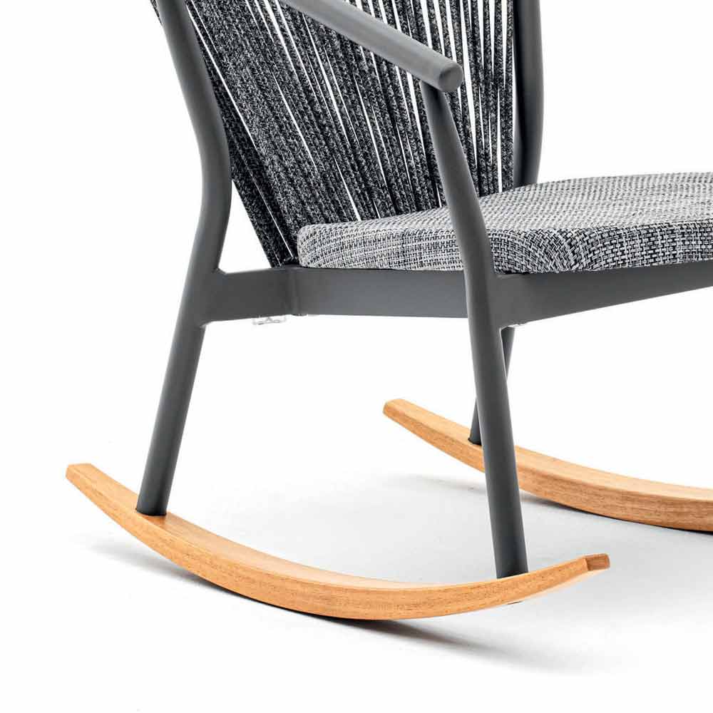 Fotoliu balansar cu design modern pentru exterior cu bază și scaun din lemn masiv din material textil alb sau cenușă.