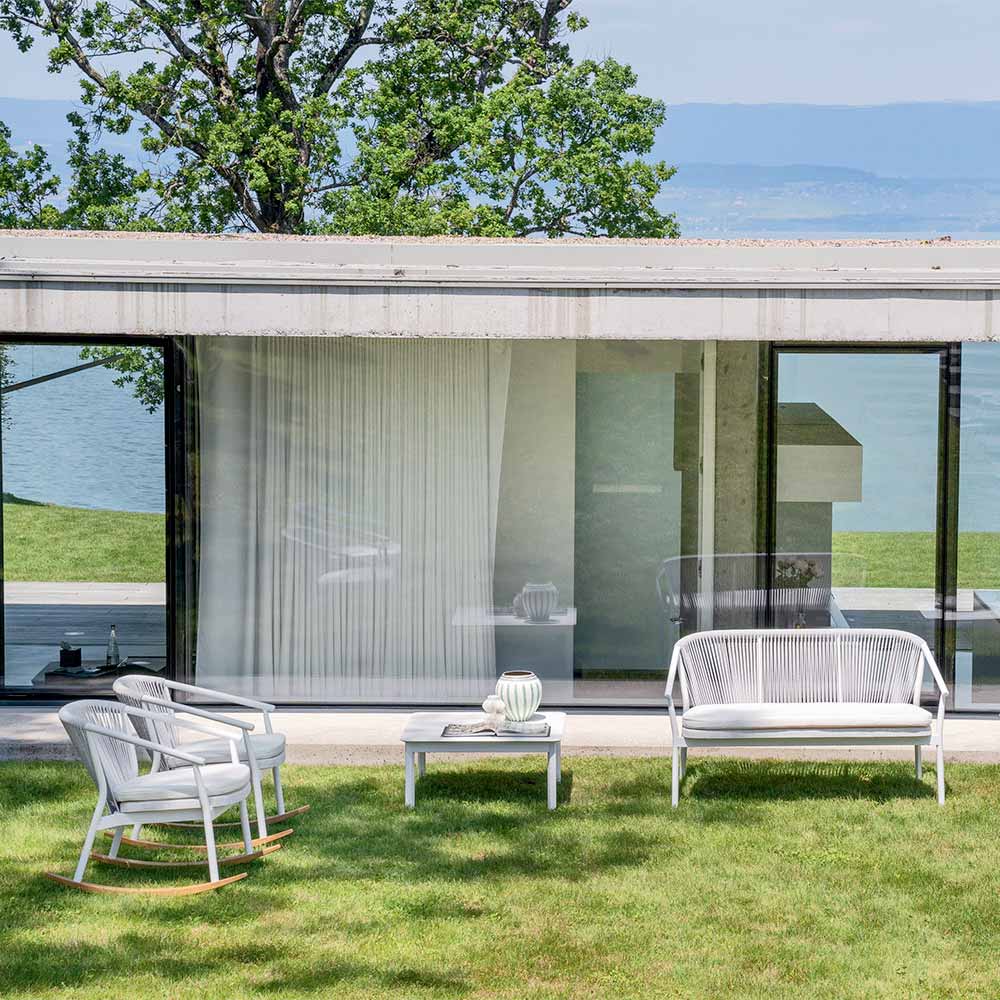 Lemnul natural iroko solid al balansoarului adaugă un accent plăcut esteticului esențial și casual al acestui scaun.