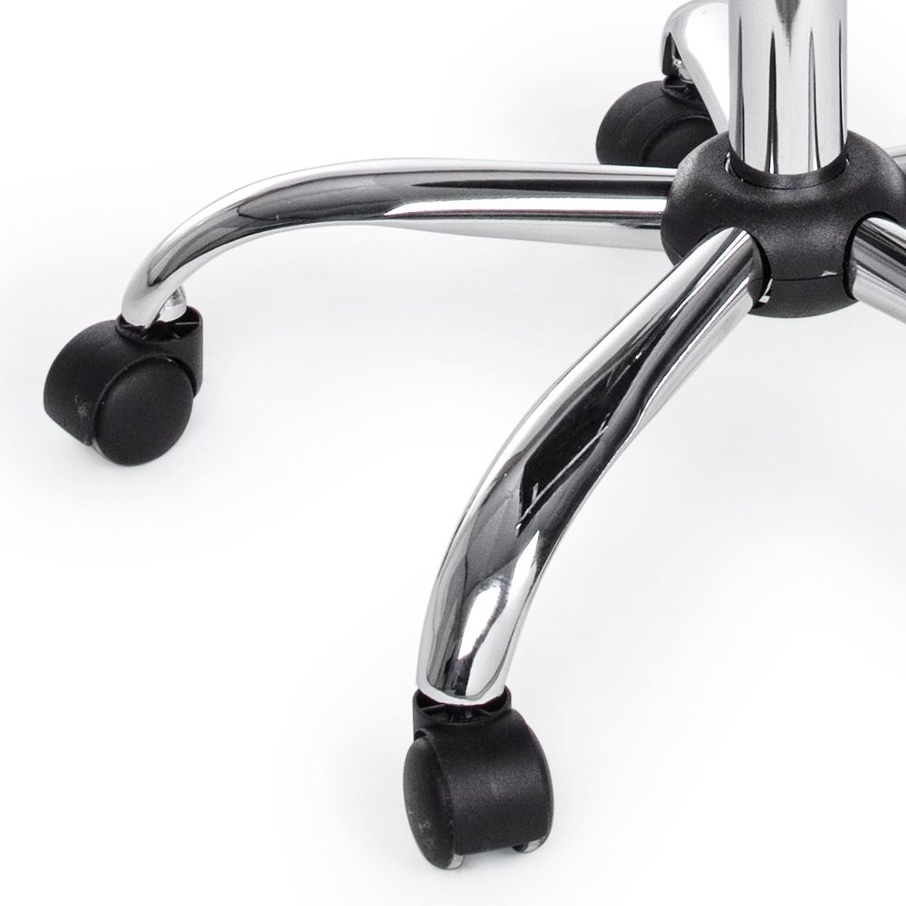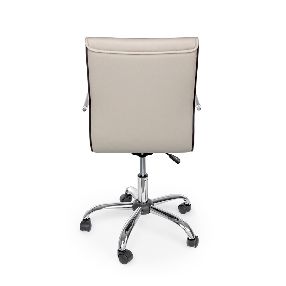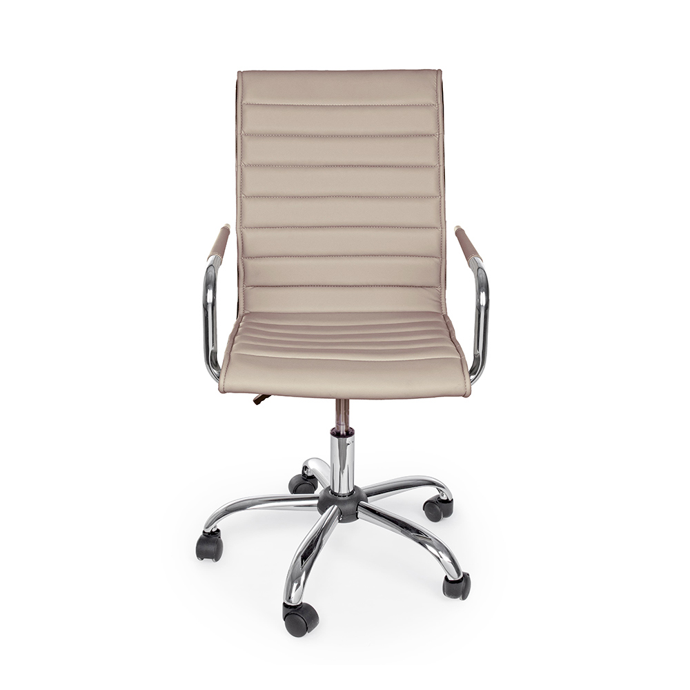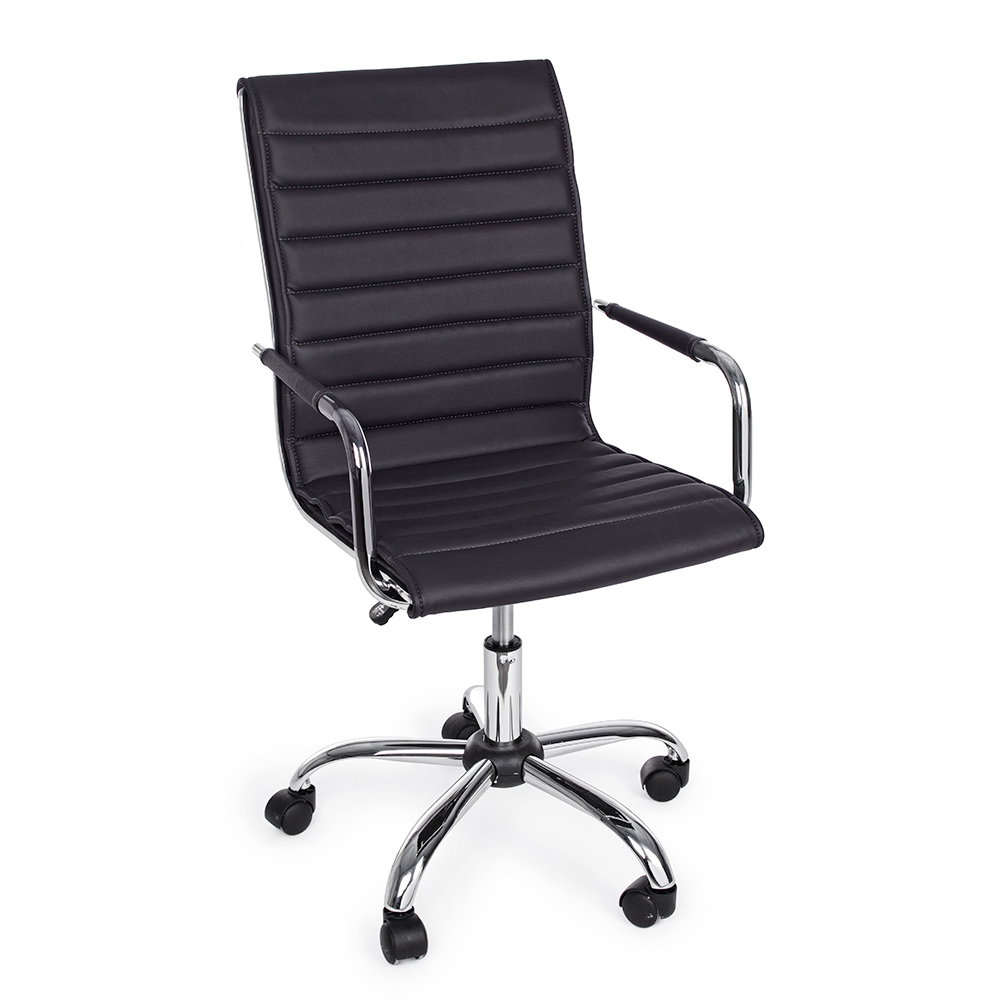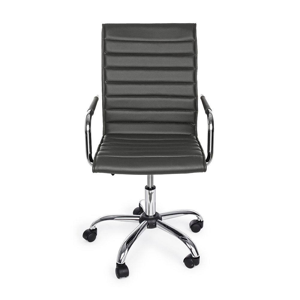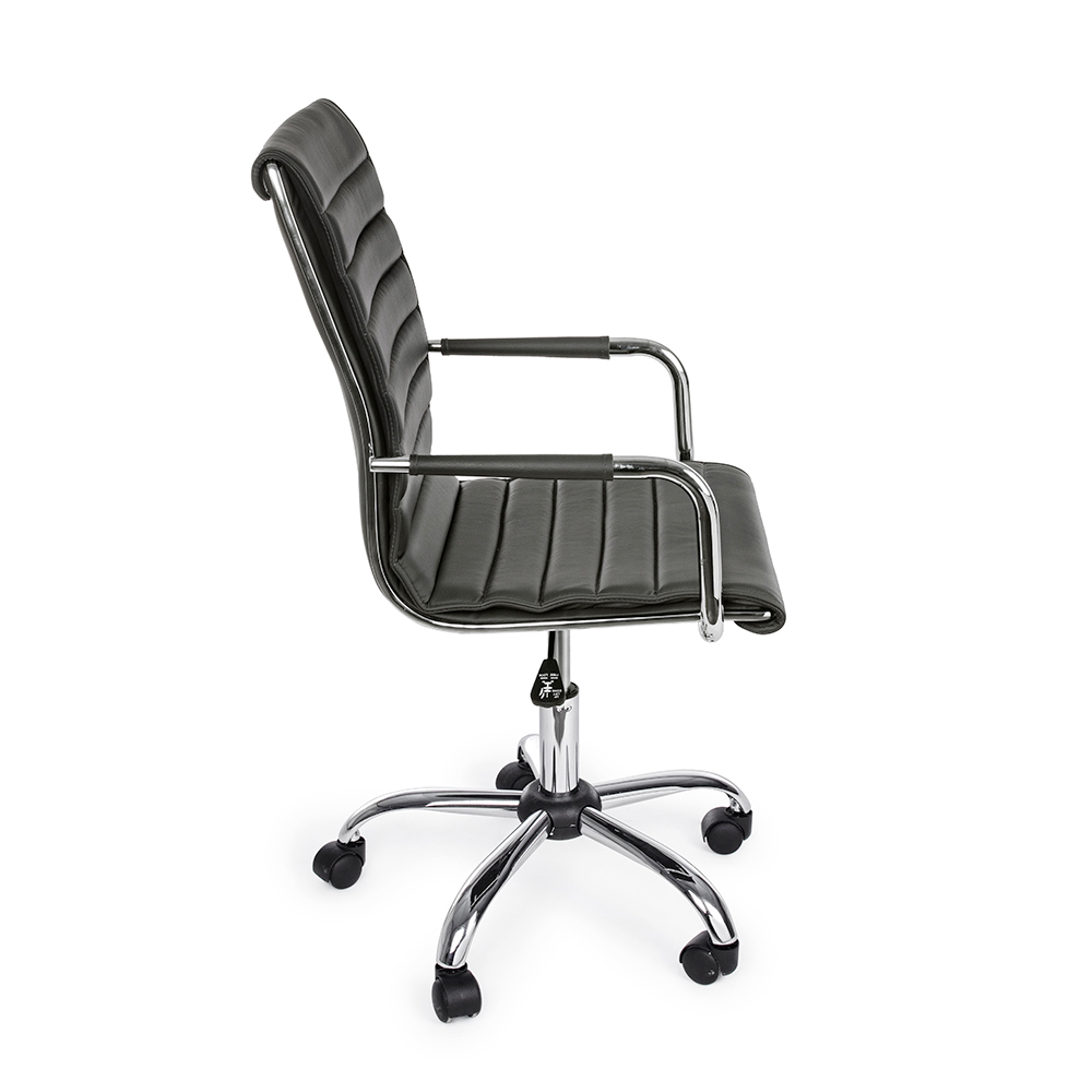 Acest fotoliu de birou este realizat cu o bază solidă din oțel cromat cu diametrul de 56 cm și roți din nailon . Scaunul si spatarul reglabile pe inaltimesunt captusite si imbracate in imitatie de piele . Cotierele din oțel cromat au o tapițerie din piele pentru eleganță supremă. Proiectare pentru asamblare.