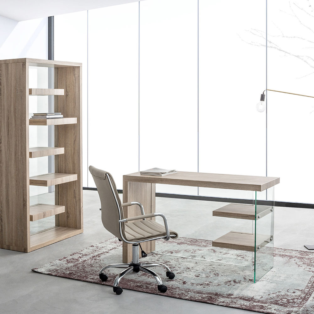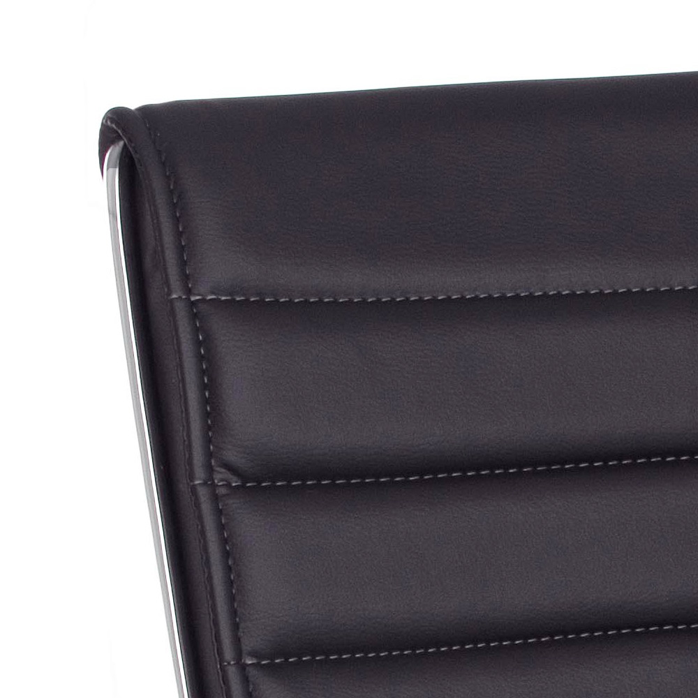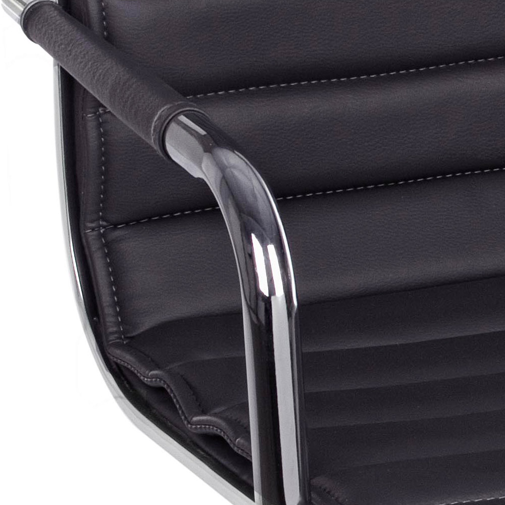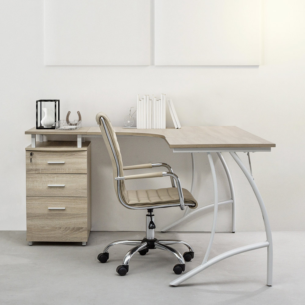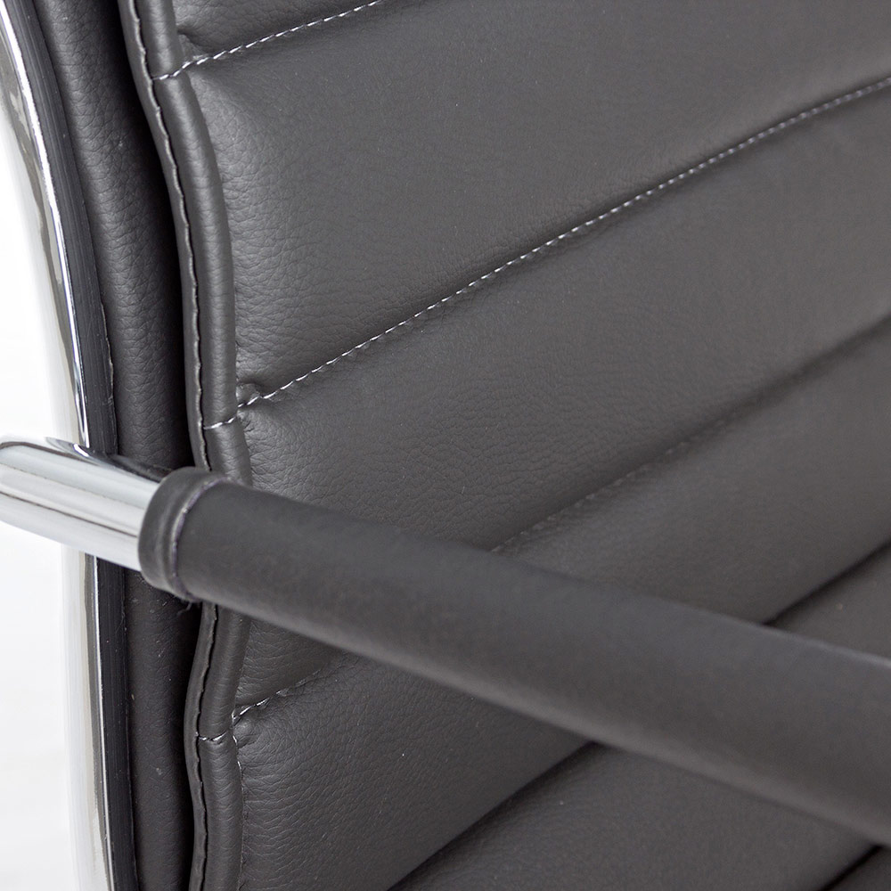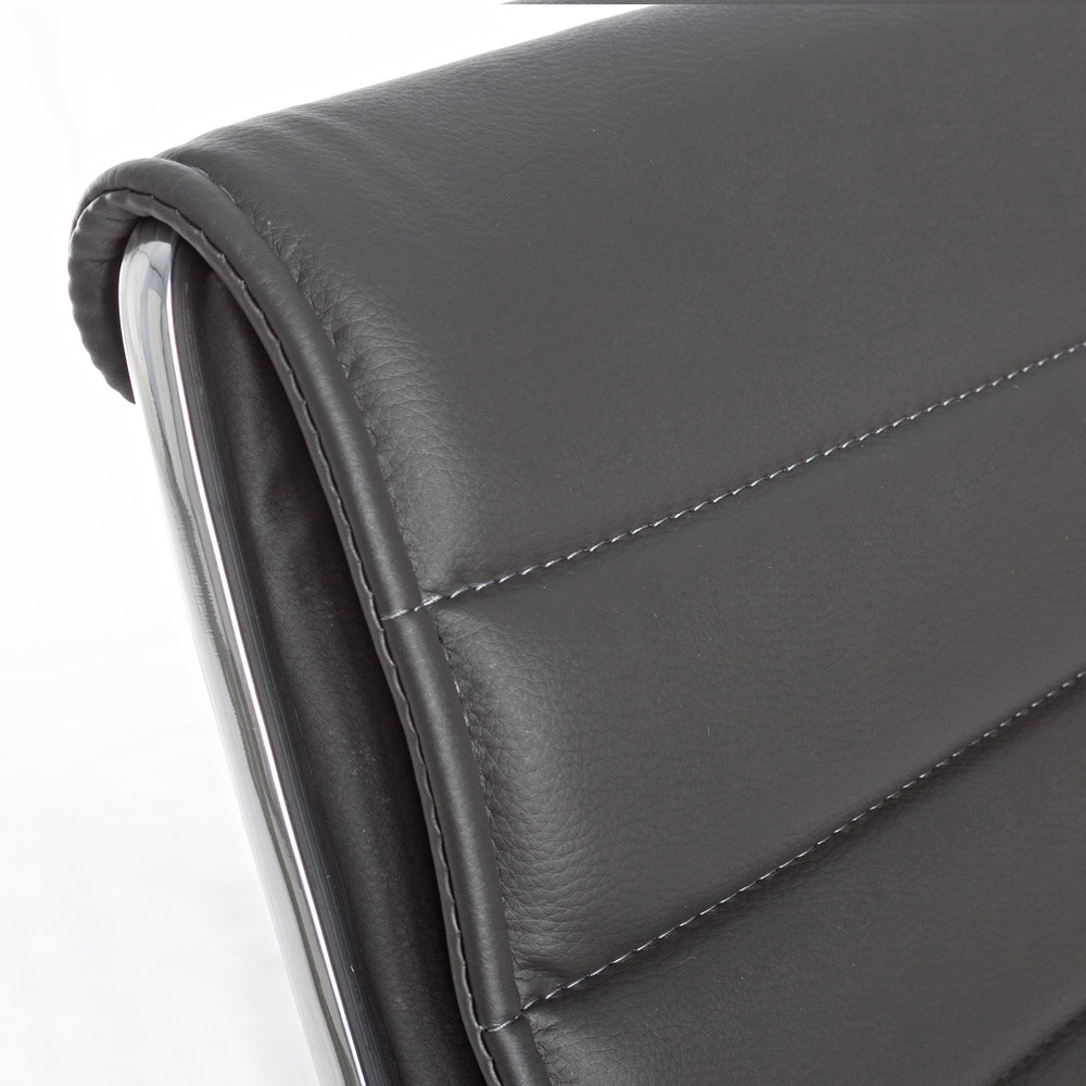 Acest fotoliu de birou este realizat cu o bază solidă din oțel cromat cu diametrul de 56 cm și roți din nailon . Scaunul si spatarul reglabile pe inaltimesunt captusite si imbracate in imitatie de piele . Cotierele din oțel cromat au o tapițerie din piele pentru eleganță supremă. Proiectare pentru asamblare.