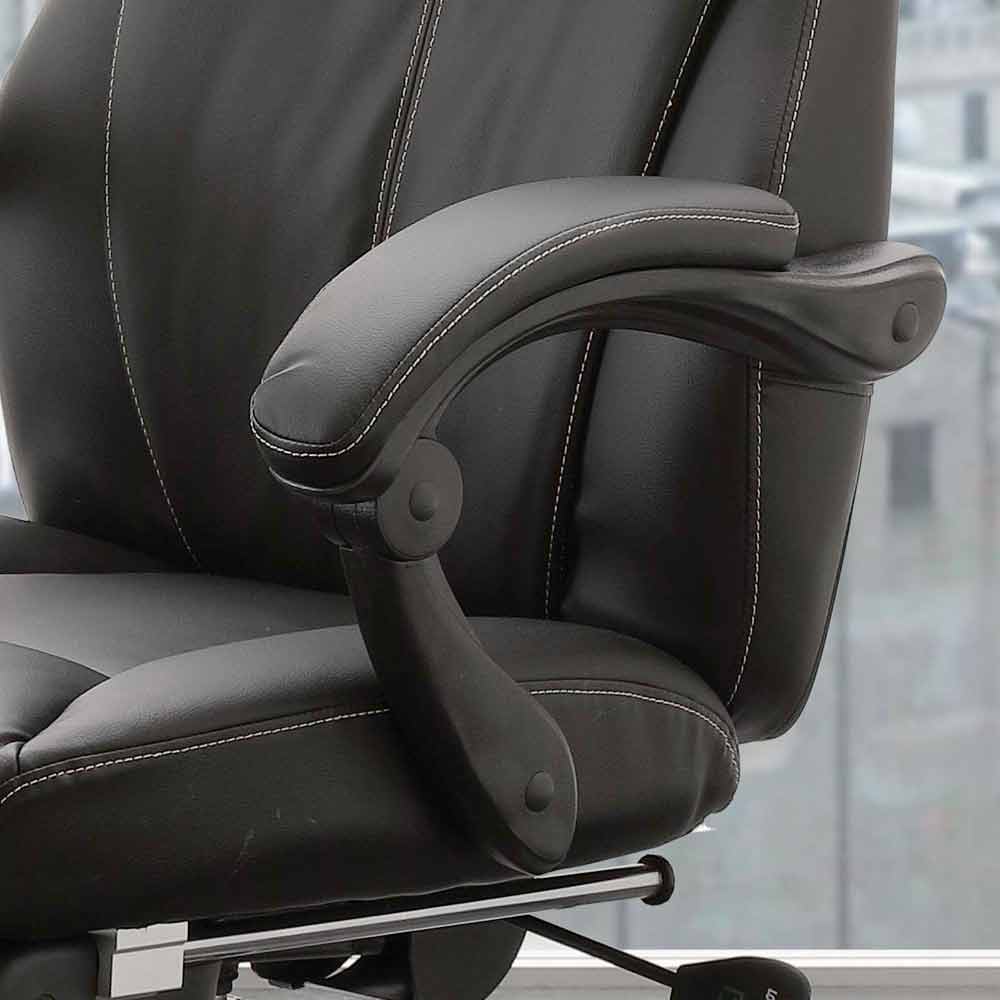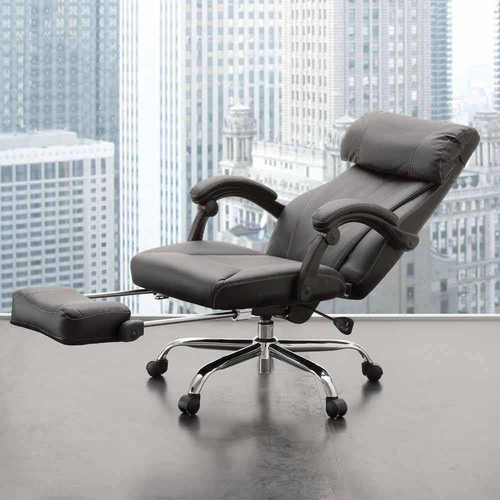 Fotoliul de birou Nazzareno reprezintă cel mai bine toate aceste calități; vine cu un scaun pivotant cu lift pe gaz, spătar cu pernă acoperită din piele ecologică neagră, scaune și suport pentru picioare din piele ecologică neagră; structură metalică cromată cu roți .