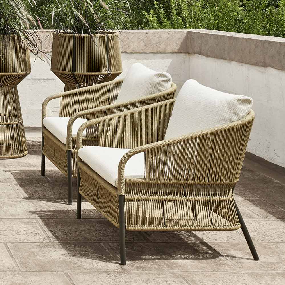Fotoliu de exterior cu structura din aluminiu vopsit cu pulbere cu finisaj gri , scaun țesut manual din frânghie de culoarea cânepei și două perne de culoare fildeș cu căptușeală dryfeel incluse. O soluție de amenajare inovatoare și proaspătă, îmbogățită de minunatele finisaje propuse care transformă cu rafinament mediul exterior.