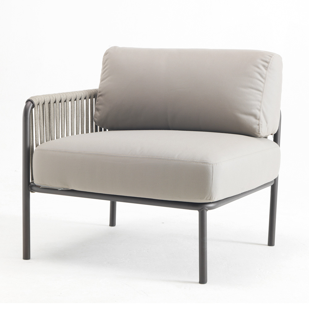 NB : Fotoliul, frânghia și pernele sunt disponibile într-o gamă largă de culori. Cotiera detașabilă poate fi plasată pe dreapta sau pe stânga.