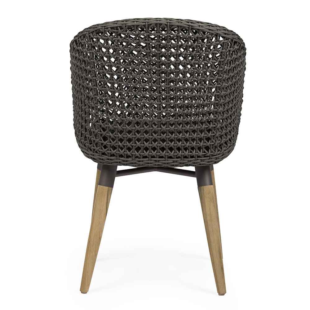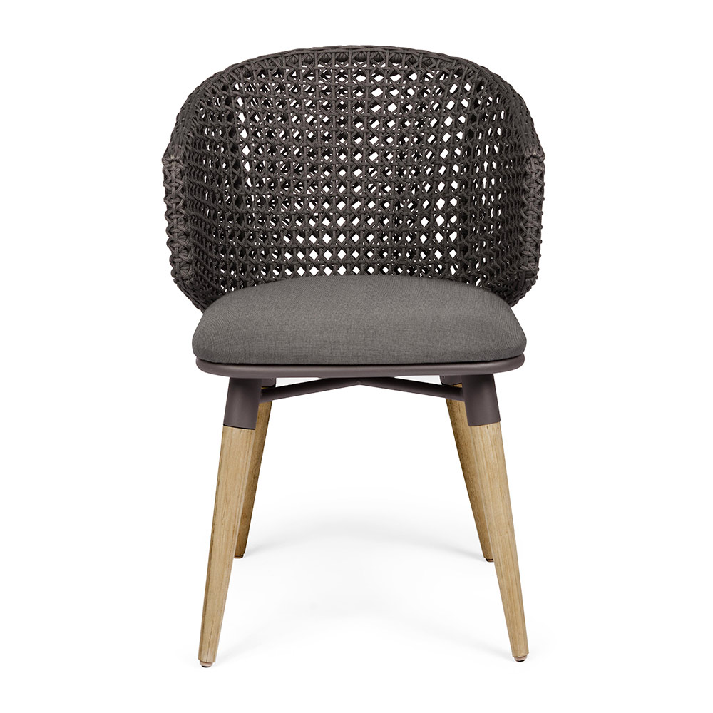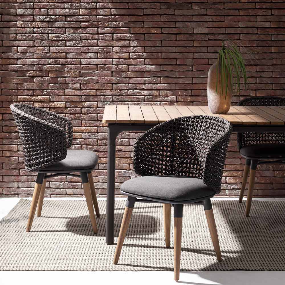 Fotoliu de exterior de înaltă calitate în frânghie și țesătură cu picioare din lemn de tec.