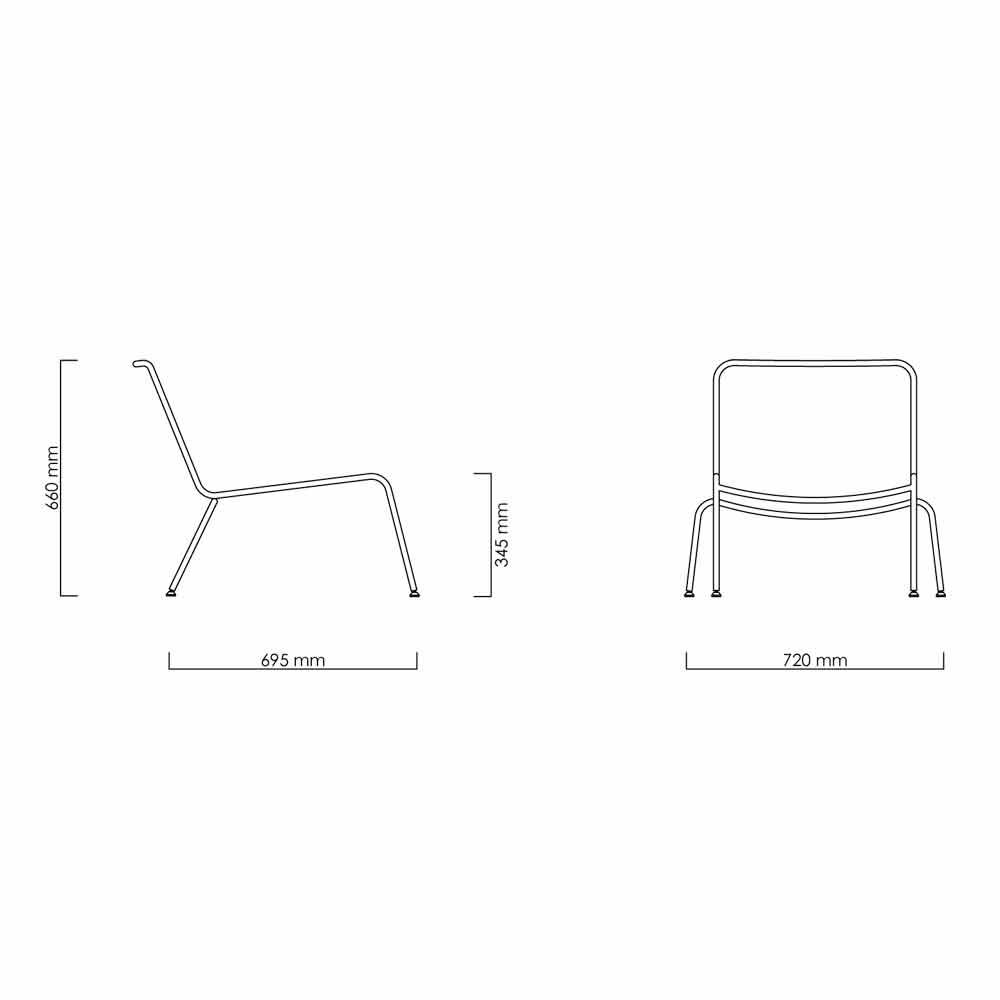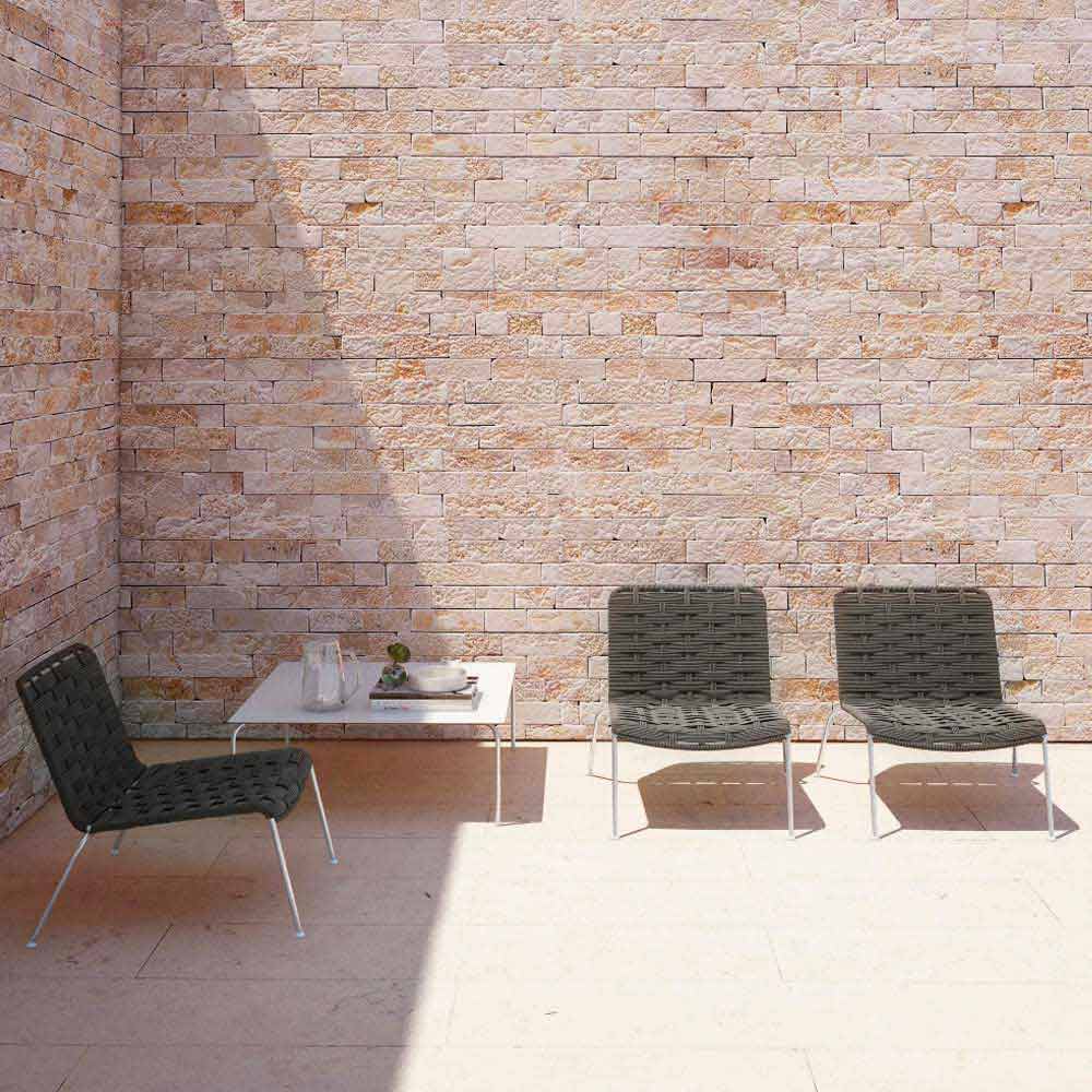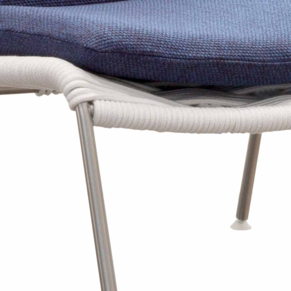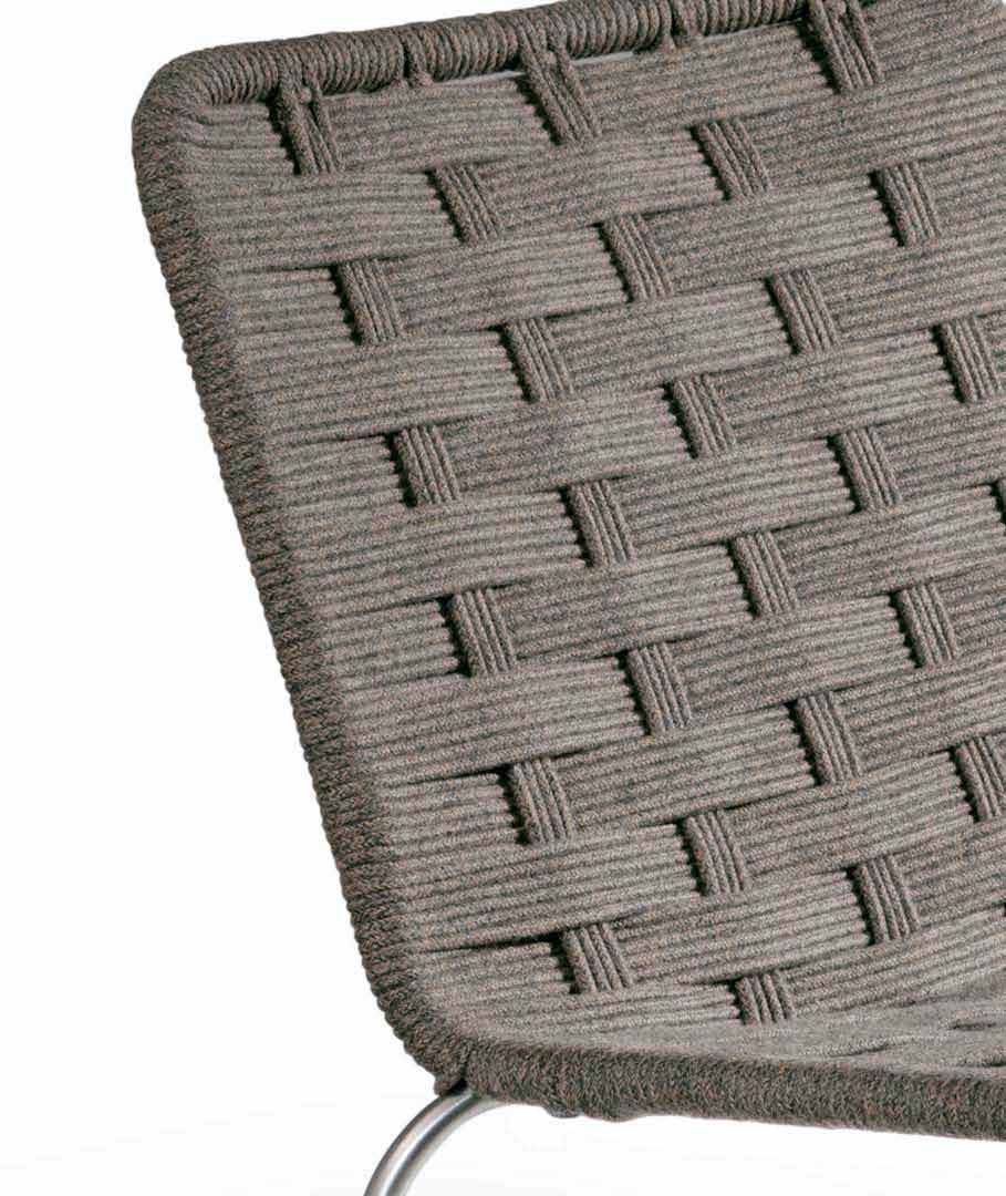 Este un fotoliu mic cu structură din oțel inoxidabil satinat. Scaun și spătar țesute în cordon acrilic cu posibilitatea de a alege între culori: