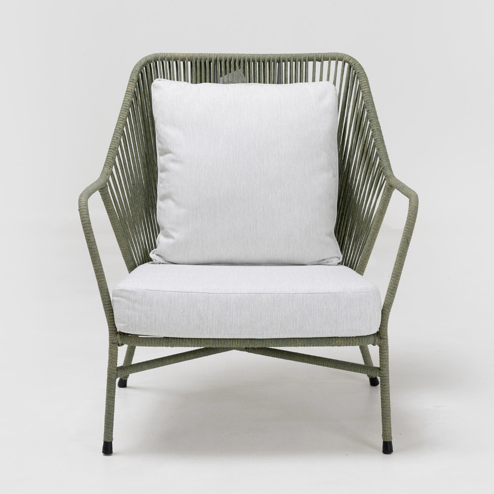 Culoarea desert mix a cadrului se îmbină armonios cu mediul natural, în timp ce perna albă oferă un contrast moale și primitor. Fotoliul are un scaun și un spătar cu perne căptușite pentru confort maxim, permițându-vă să vă relaxați pe deplin în timp ce vă cufundați în liniștea spațiului dvs. în aer liber.