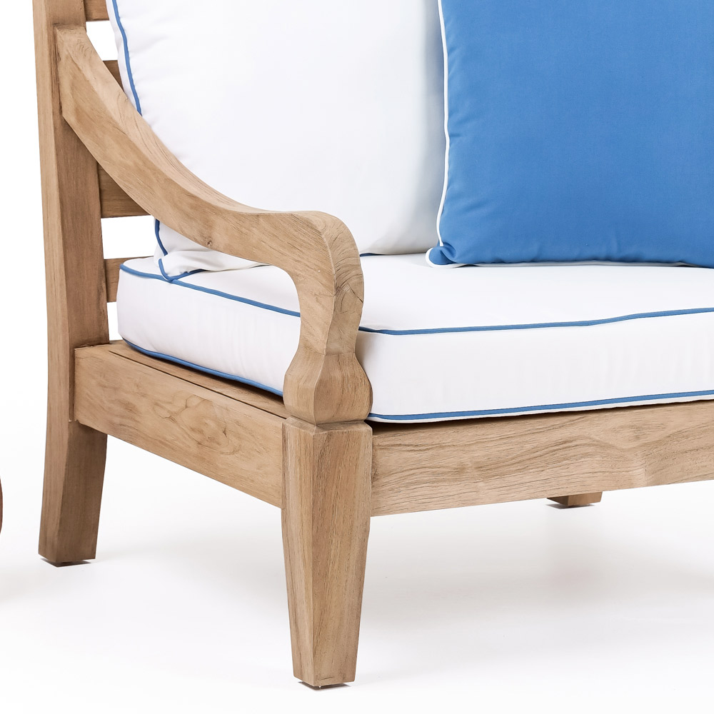 țesătură de exterior "albă" cu bordură contrastantă "albastru ocean" și perne ornamentale albastre cu bordură albă incluse.