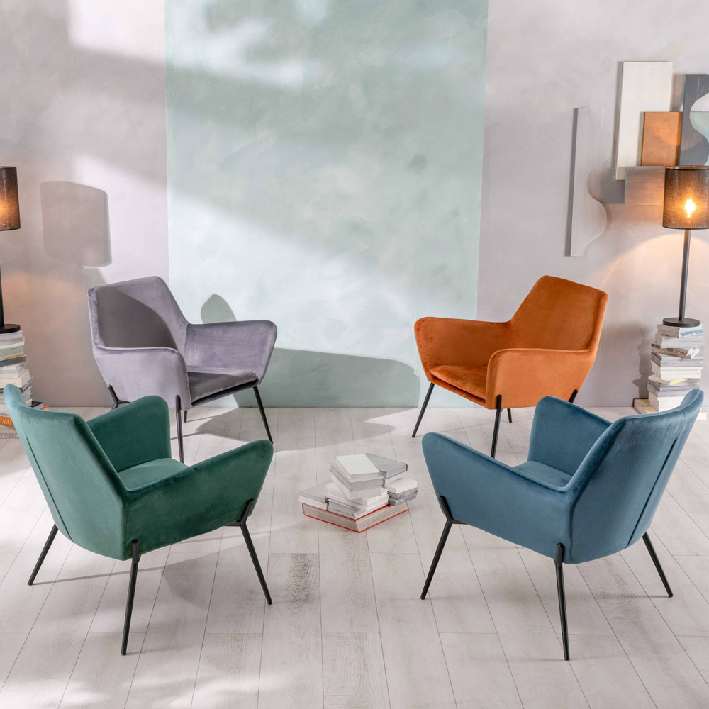 O expresie a eleganței și rafinamentului, acest fotoliu este conceput pentru a oferi o notă grațioasă zonei de zi, dar se pretează oricărei soluții de amenajare. Catifea moale invaluie sezutul, facandu-l extrem de placut la atingere. Structura se incheie cu picioare cu un design zvelt din metal elegant. Este un accesoriu de mobilier capabil să ofere unicitate spațiilor, devenind punctul focal al oricărui living modern și contemporan.