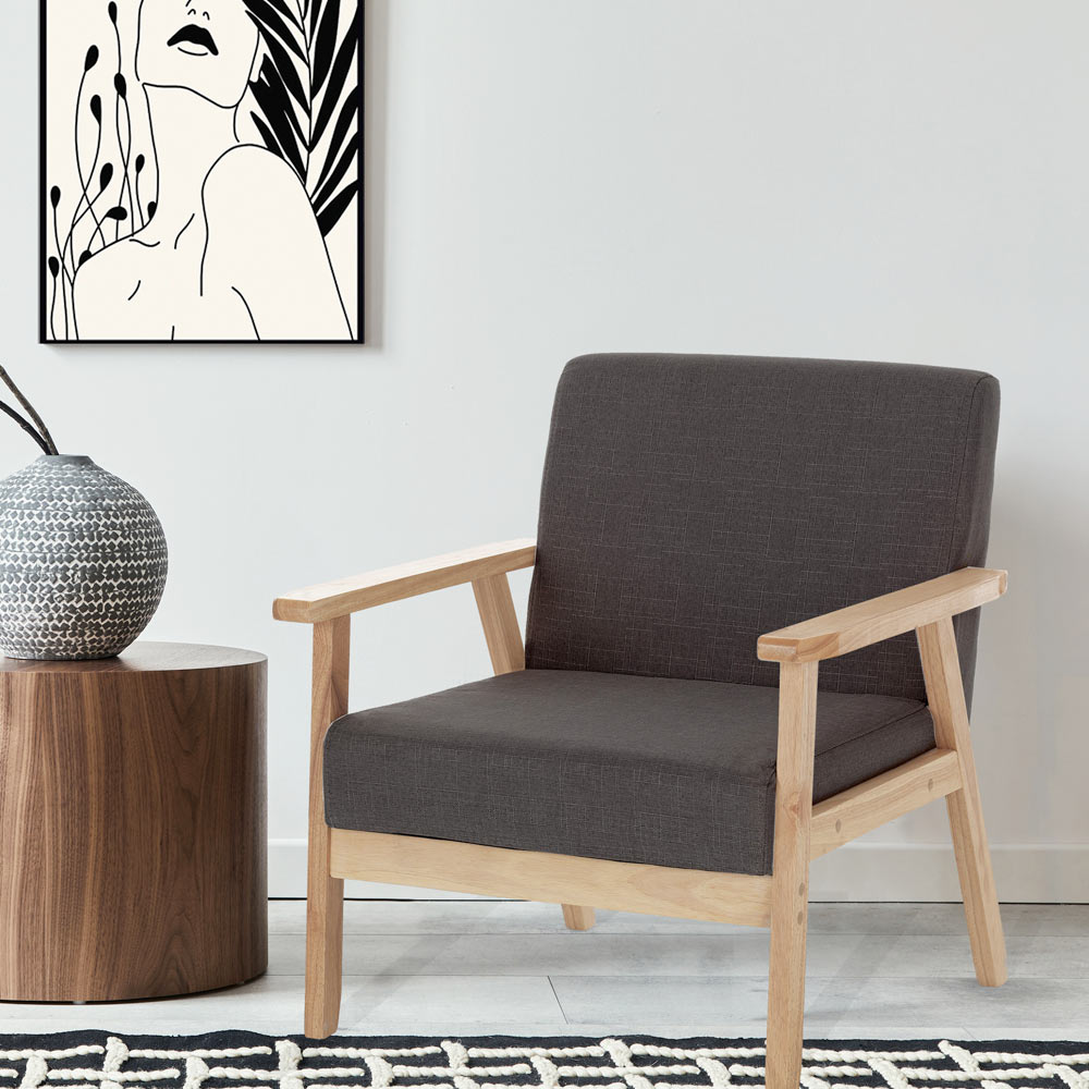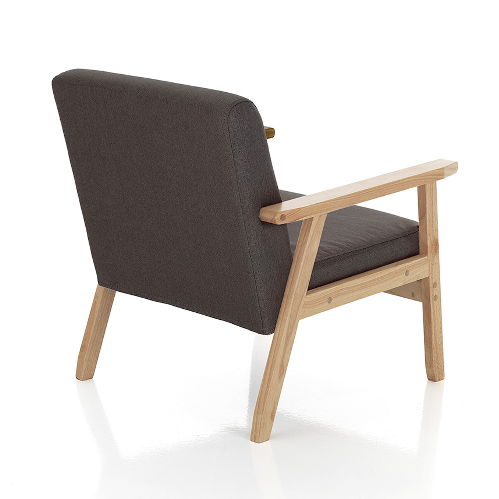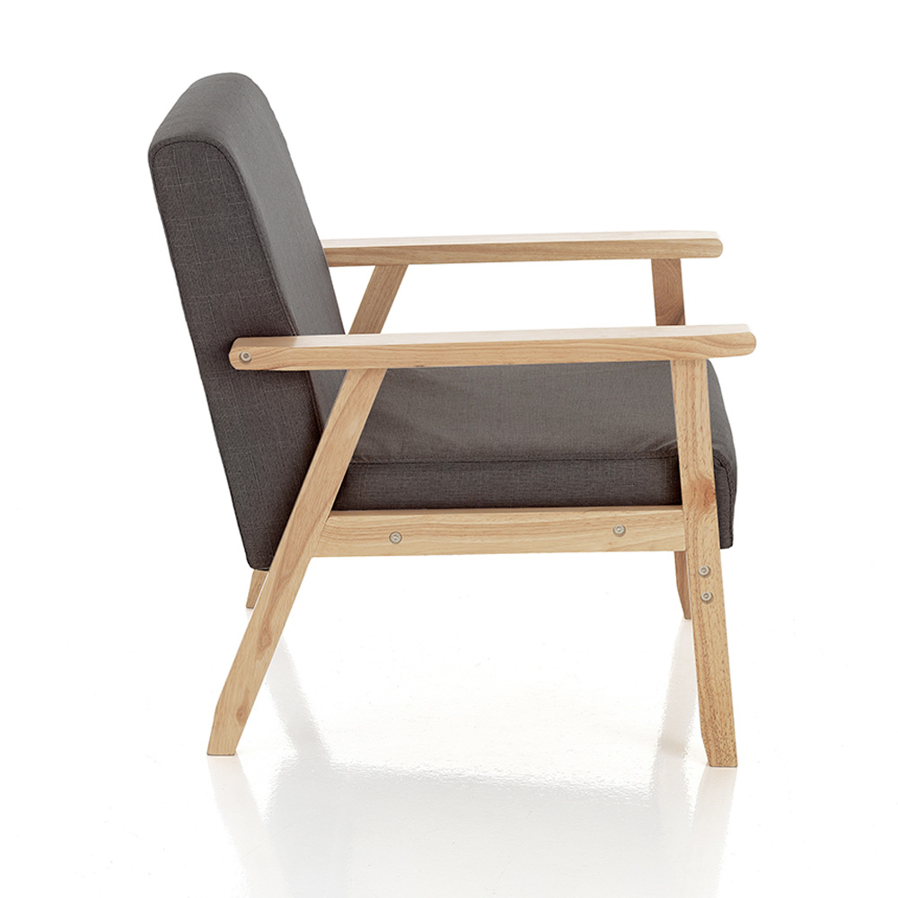 Acest fotoliu combină eleganța și confortul cu un design curat și contemporan. Realizat cu o structură din lemn masiv , oferă o rezistență excepțională și un aspect cald care invită la relaxare. Contrastul cu tapițeria din material gri închis adaugă o notă de rafinament modern oricărui spațiu.