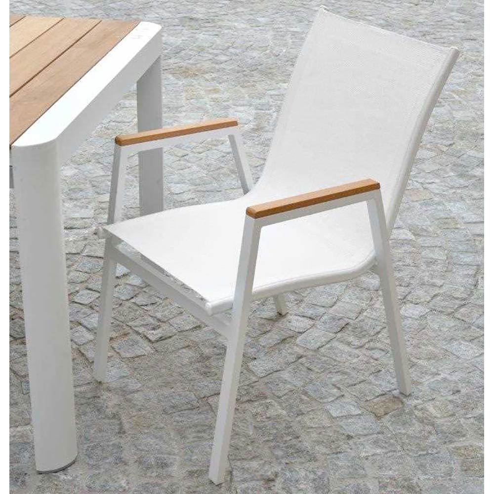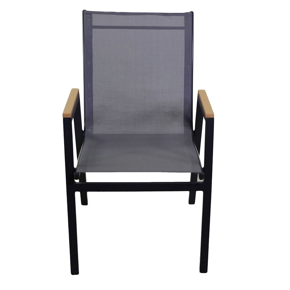 Acest bratisier cu cadru din aluminiu acoperit cu pulbere combină stilul și funcționalitatea, fiind perfect pentru a completa orice spațiu exterior modern. Țesătura textilenă asigură rezistență la intemperii și confort de lungă durată, în timp ce inserțiile din lemn de pe brațe adaugă o notă de căldură și eleganță.