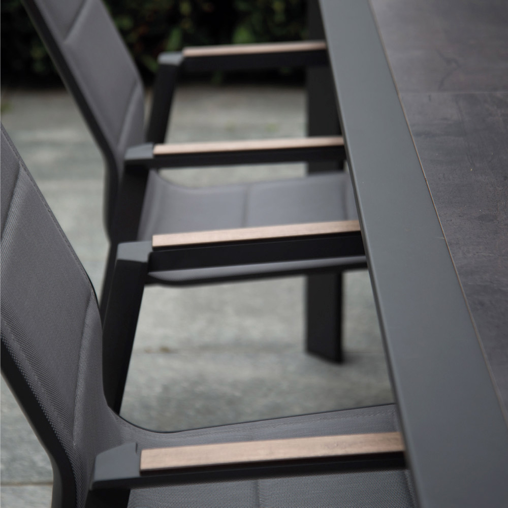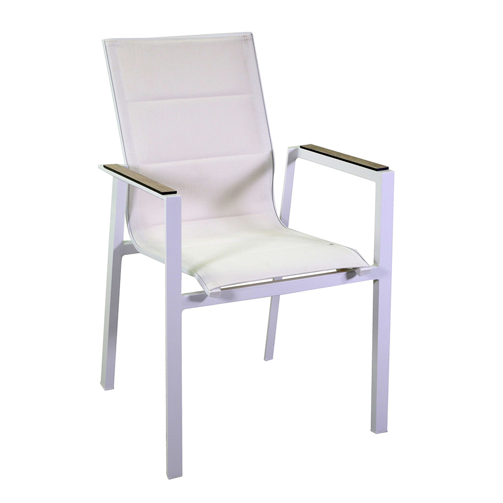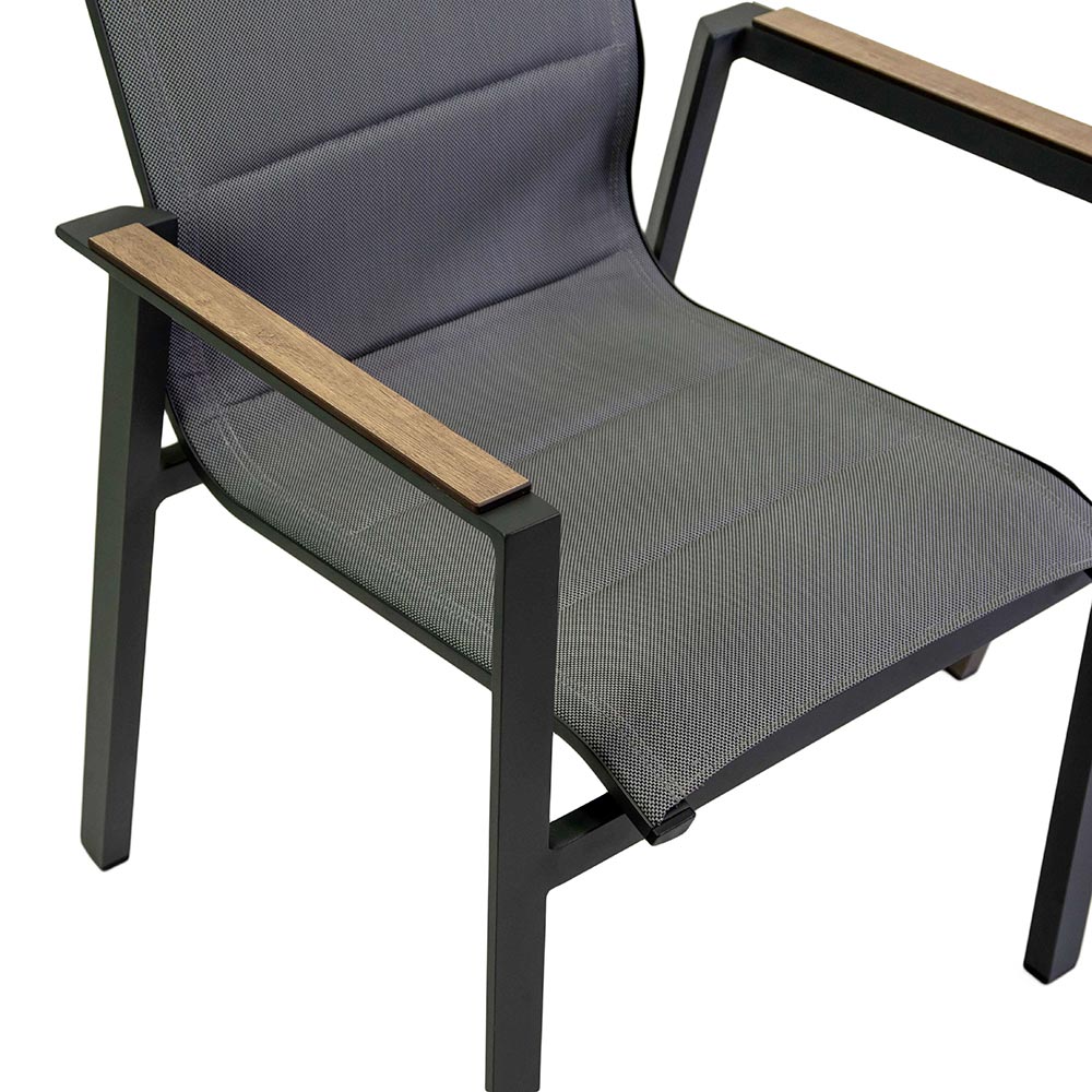 Acest fotoliu din aluminiu cu tapițerie textilenă este ideal pentru cei care caută confort și stil în spațiul lor exterior. Structura din aluminiu vopsit oferă un design curat și modern care se potrivește perfect cu orice decor. Cotierele , îmbogățite cu inserții HPL, adaugă o notă de eleganță și sunt extrem de practice pentru susținere. Textilene, cunoscut pentru rezistența și ușurința sa de întreținere, asigură un scaun confortabil și durabil, ideal pentru a vă bucura de ore de relaxare în aer liber.