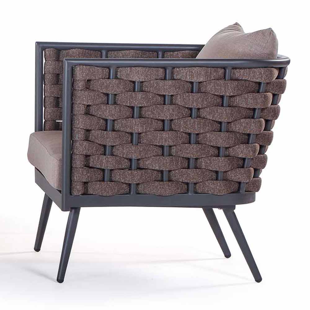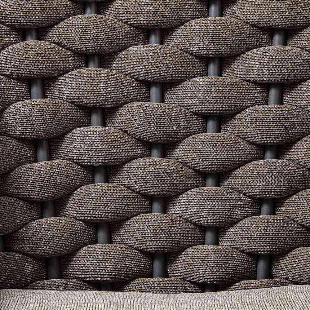 Fotoliu de exterior realizat cu structură din aluminiu vopsit finisat cu grafit și țesut cu frânghie din poliester, completat cu perne pentru scaune și spate acoperite cu țesătură acrilică maro . Un scaun pentru medii în aer liber care combină funcționalitatea și un aspect estetic plăcut, reușind astfel să ofere o soluție perfectă de mobilare pentru cei care caută un produs la fel de confortabil și primitor pe cât de elegant și capabil să creeze o armonie minunată cu celelalte elemente ale mobilierul din jur.