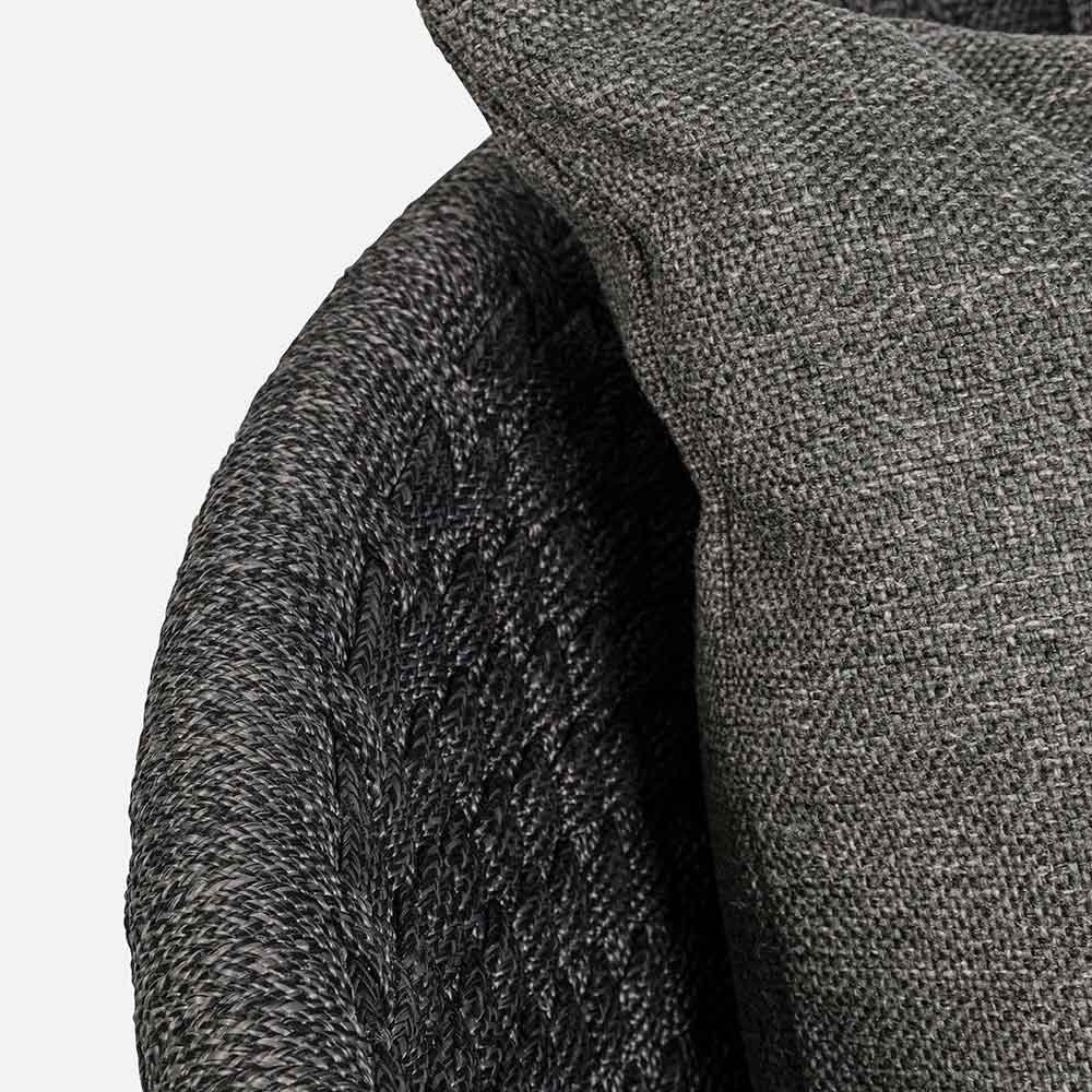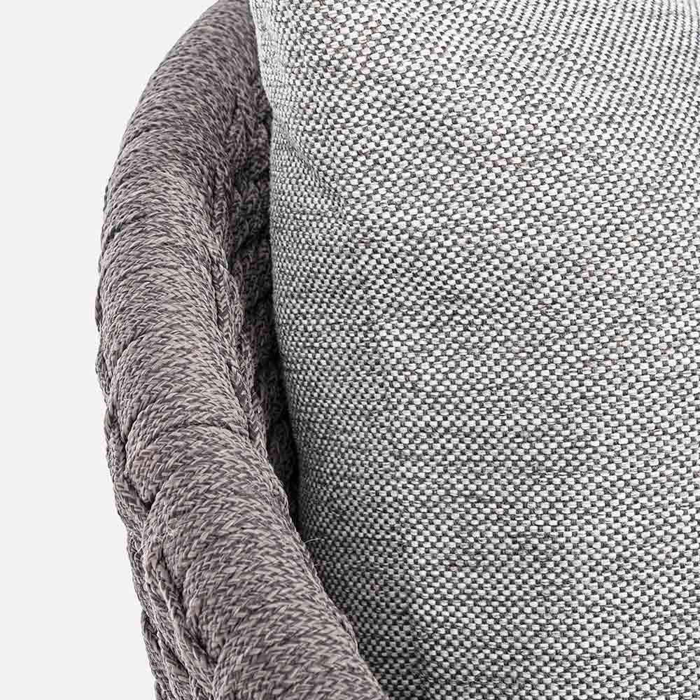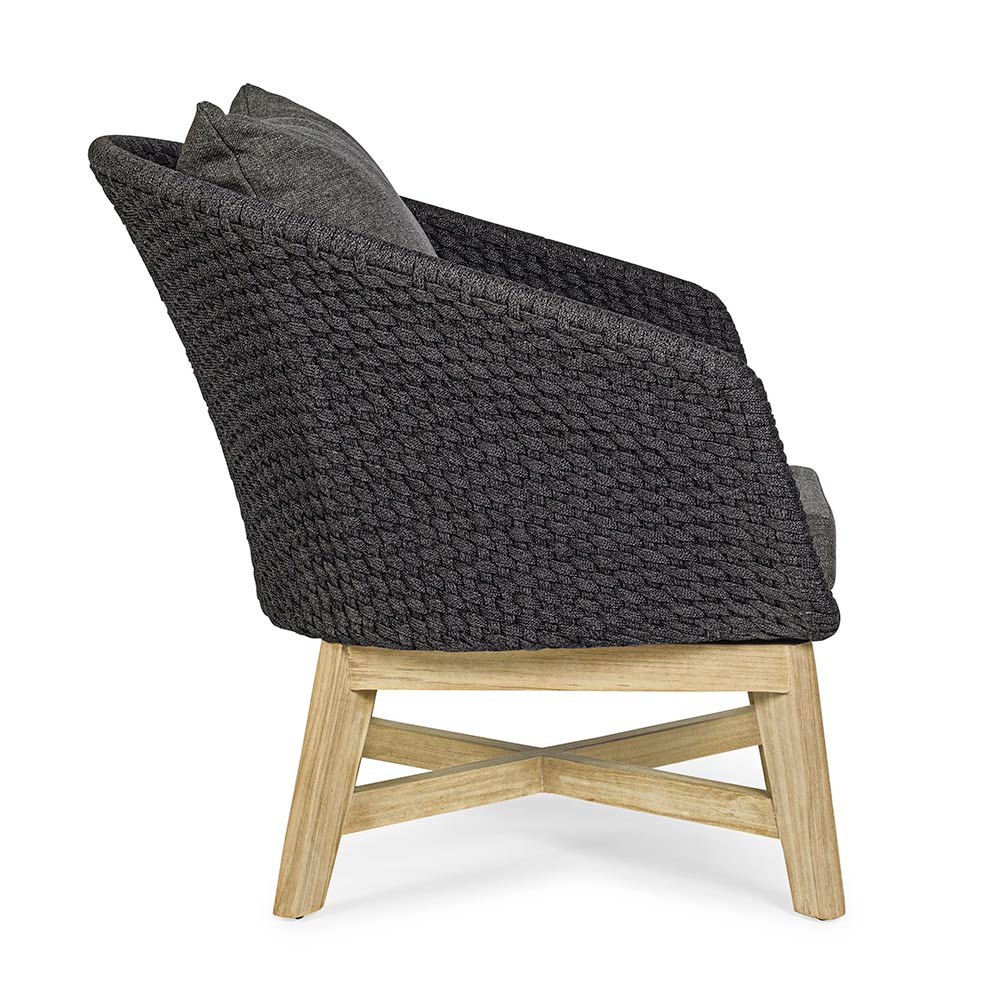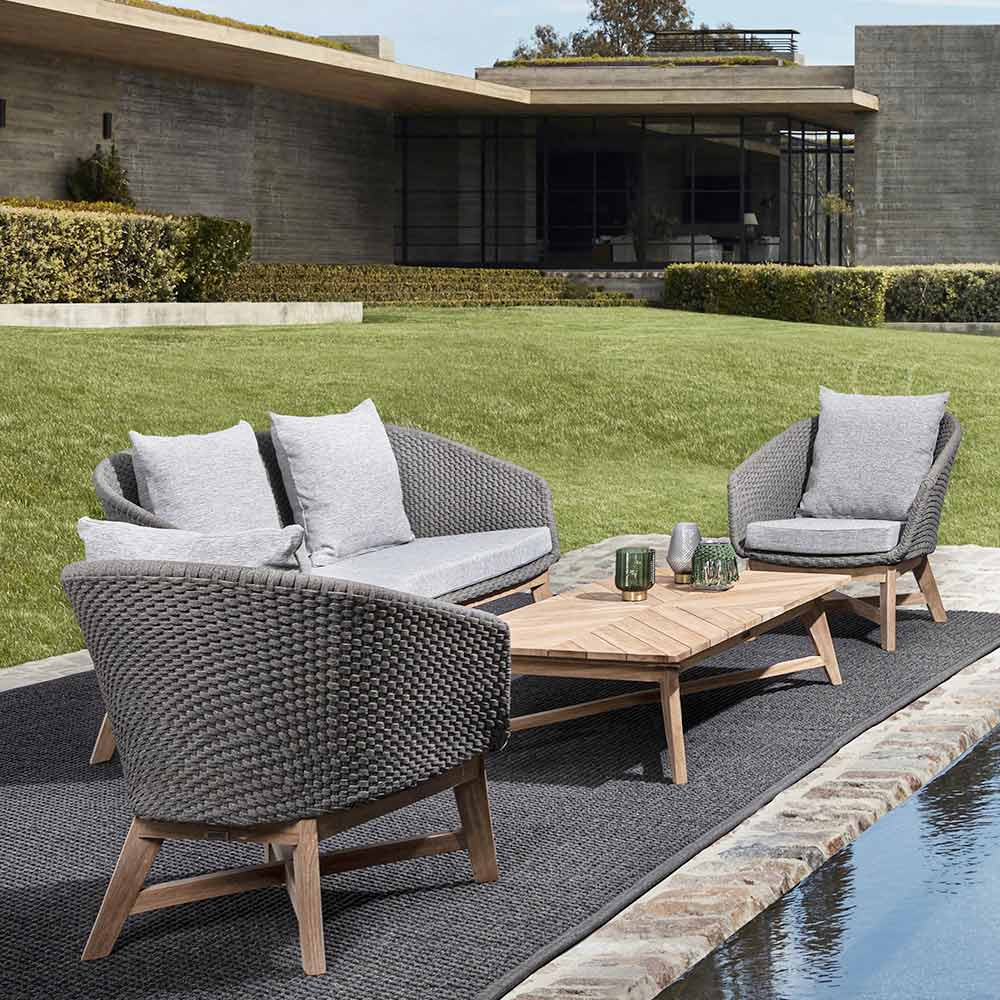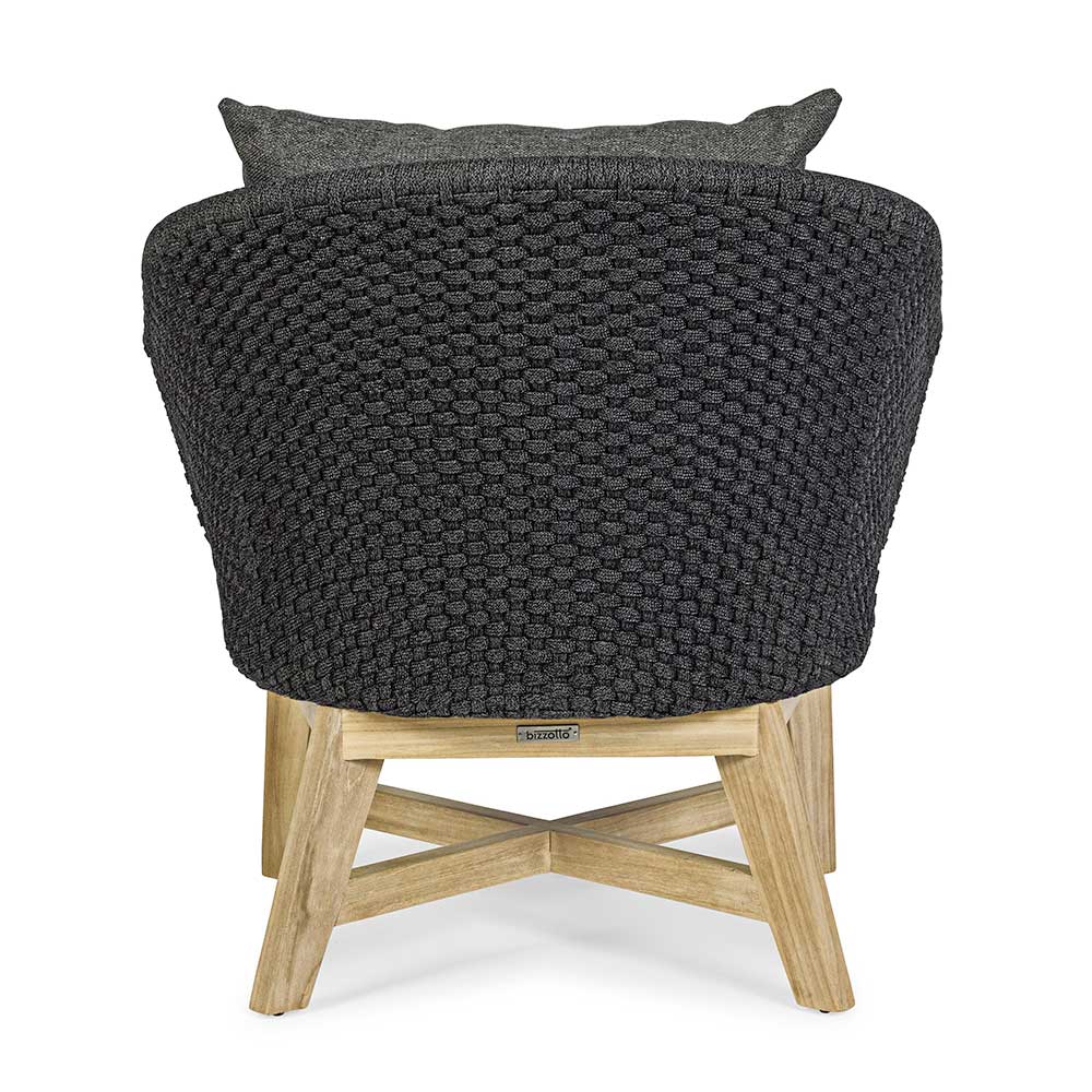 Fotoliu de lux de exterior în frânghie țesută cu perne detașabile din țesătură.