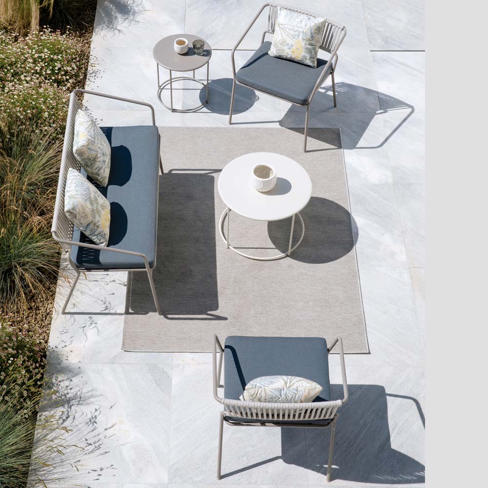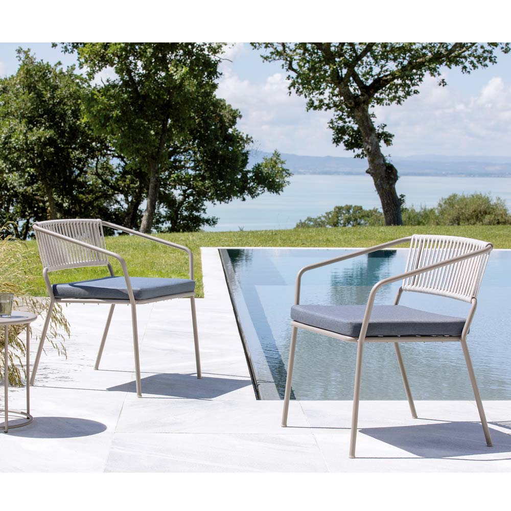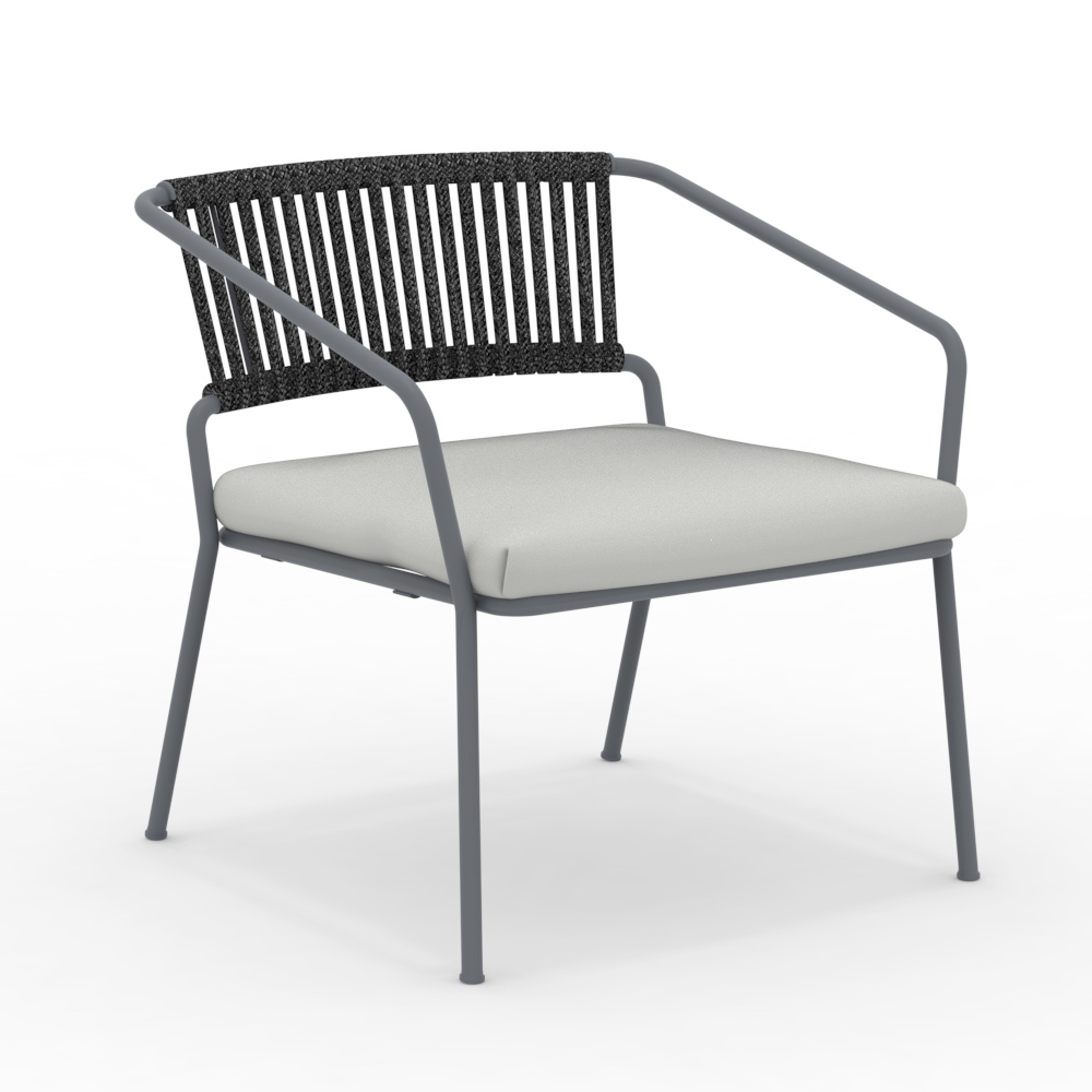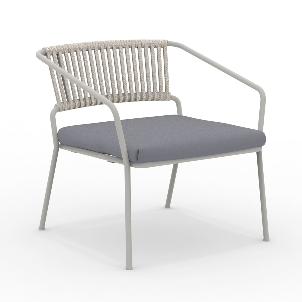 Fotoliu de grădină jos cu cadru din fier galvanizat vopsit în câmp electrostatic și șezut din frânghie și material textil, fabricat în Italia
