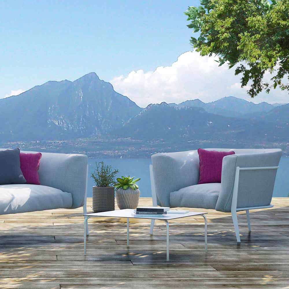 Fotoliu modern de exterior, structură din aluminiu și țesătură detașabilă, fabricat în design italian.
