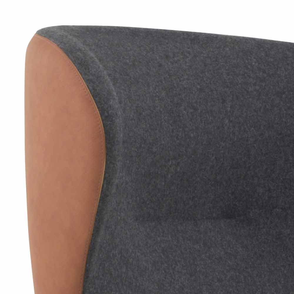 Fotoliu tapițat din piele și țesătură cu bază pivotantă din lemn fabricată în Italia.
