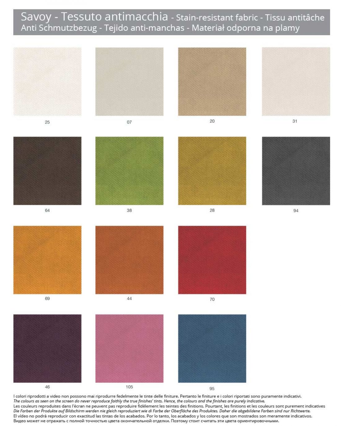 - țesătură Savoy rezistentă la pete ; Savoy este o țesătură de design modern, plăcută la atingere și foarte rezistentă la uzură și abraziune. Principala caracteristică a acestei țesături este impermeabilitatea sa totală la apă: este de fapt gatantito ca "hidrofug". 89% poliester, 8% poliamidă, 2% bumbac, 1% viscoză.