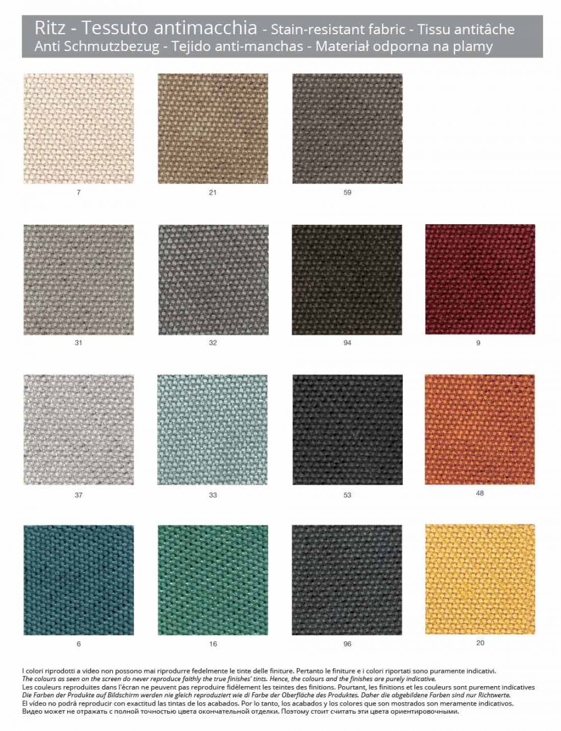 - țesătură anti-pete Ritz ; Ritz este o țesătură plăcută la atingere, selectată ca acoperire pentru aceste scaune datorită rezistenței sale caracteristice la uzură. Este o țesătură antipete compusă din 86% poliester, 14% poliamidă. Greutate / grosime 490 gr / mtl.