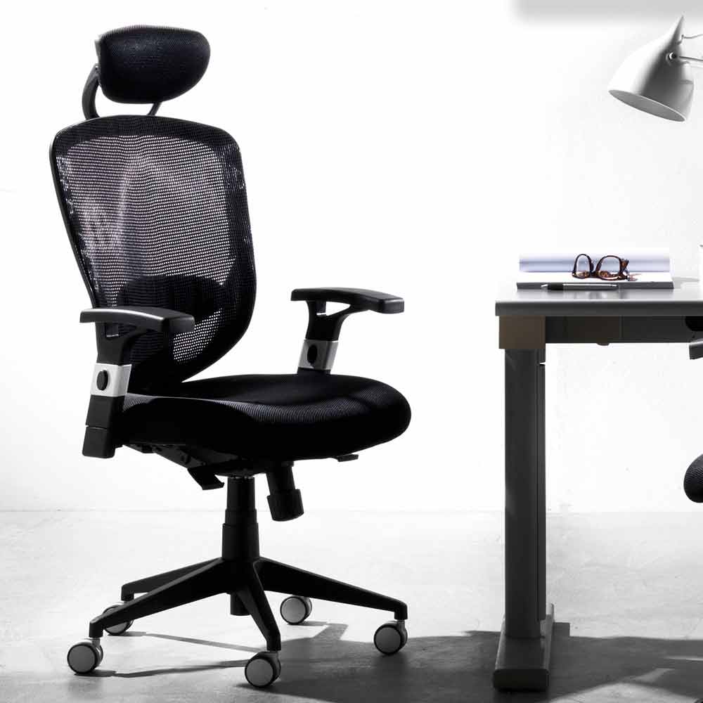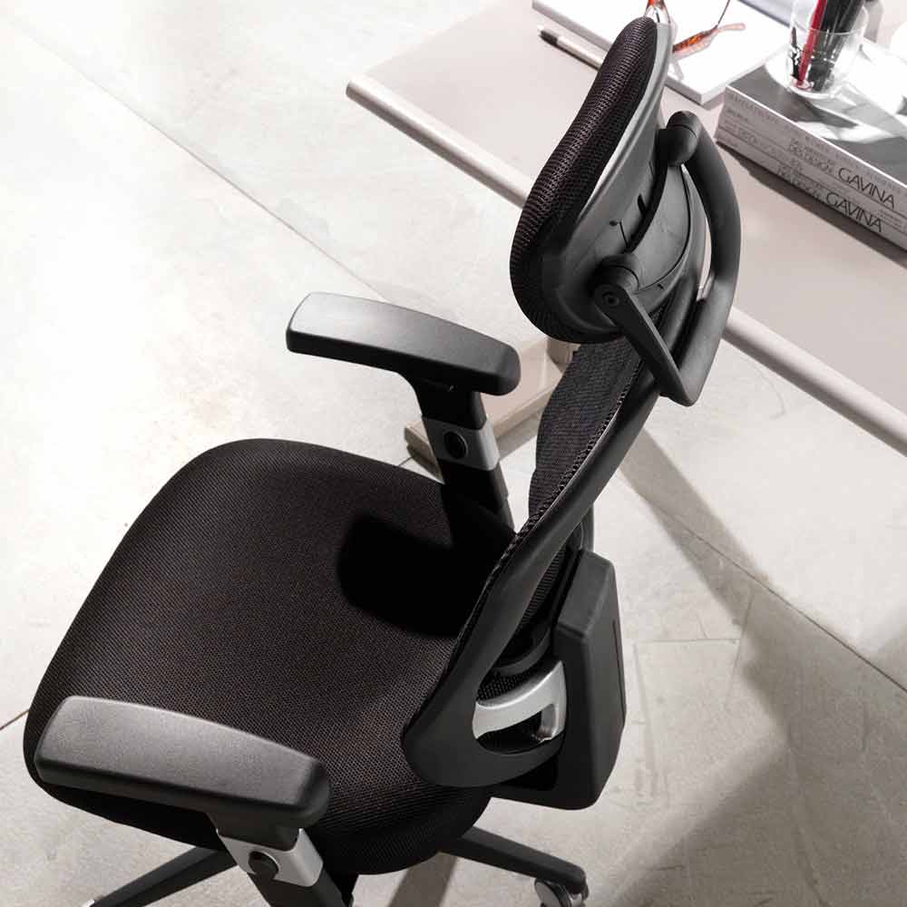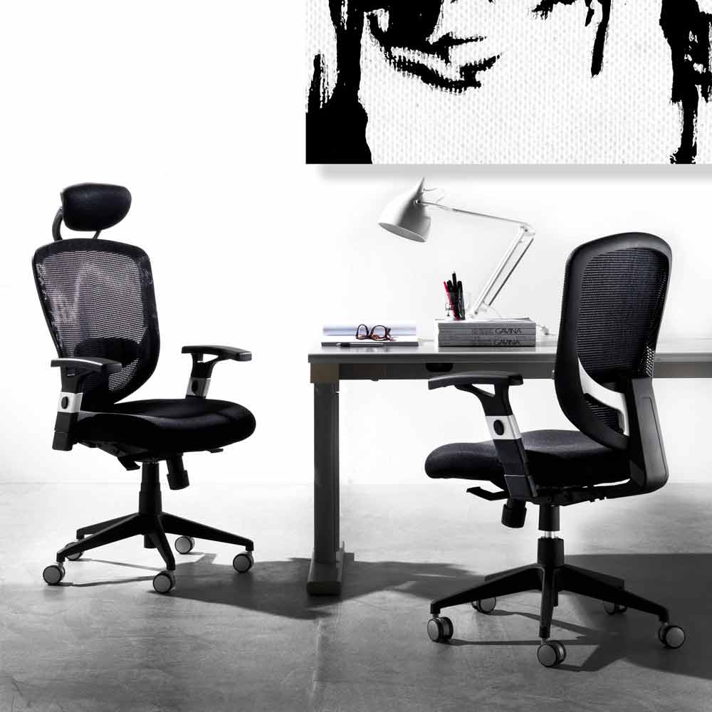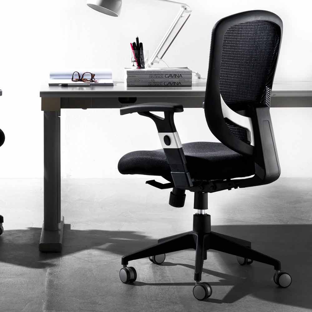 Fotoliu modern pivotant semi-executiv și operațional din plasă micro-perforată neagră și structură din nailon negru.