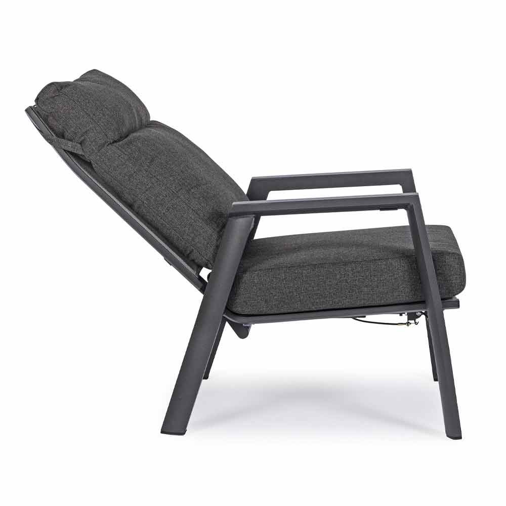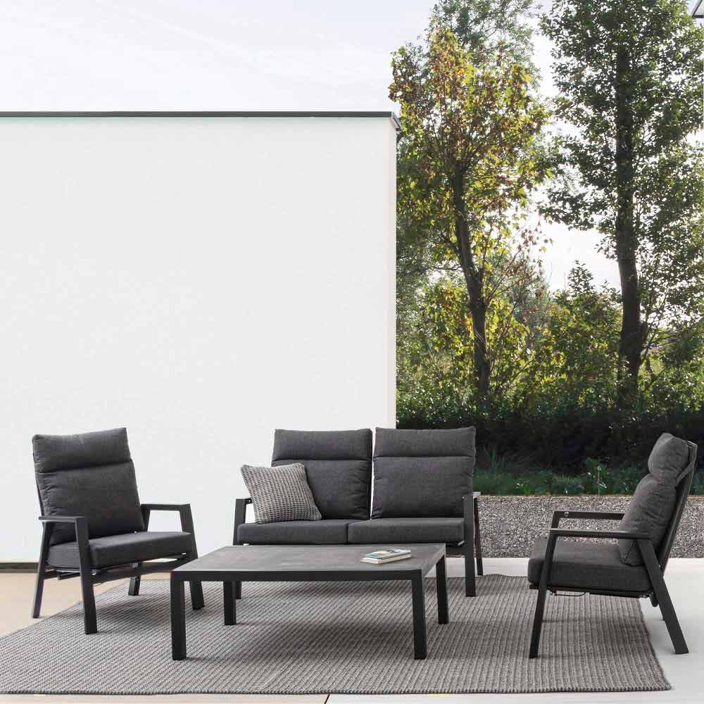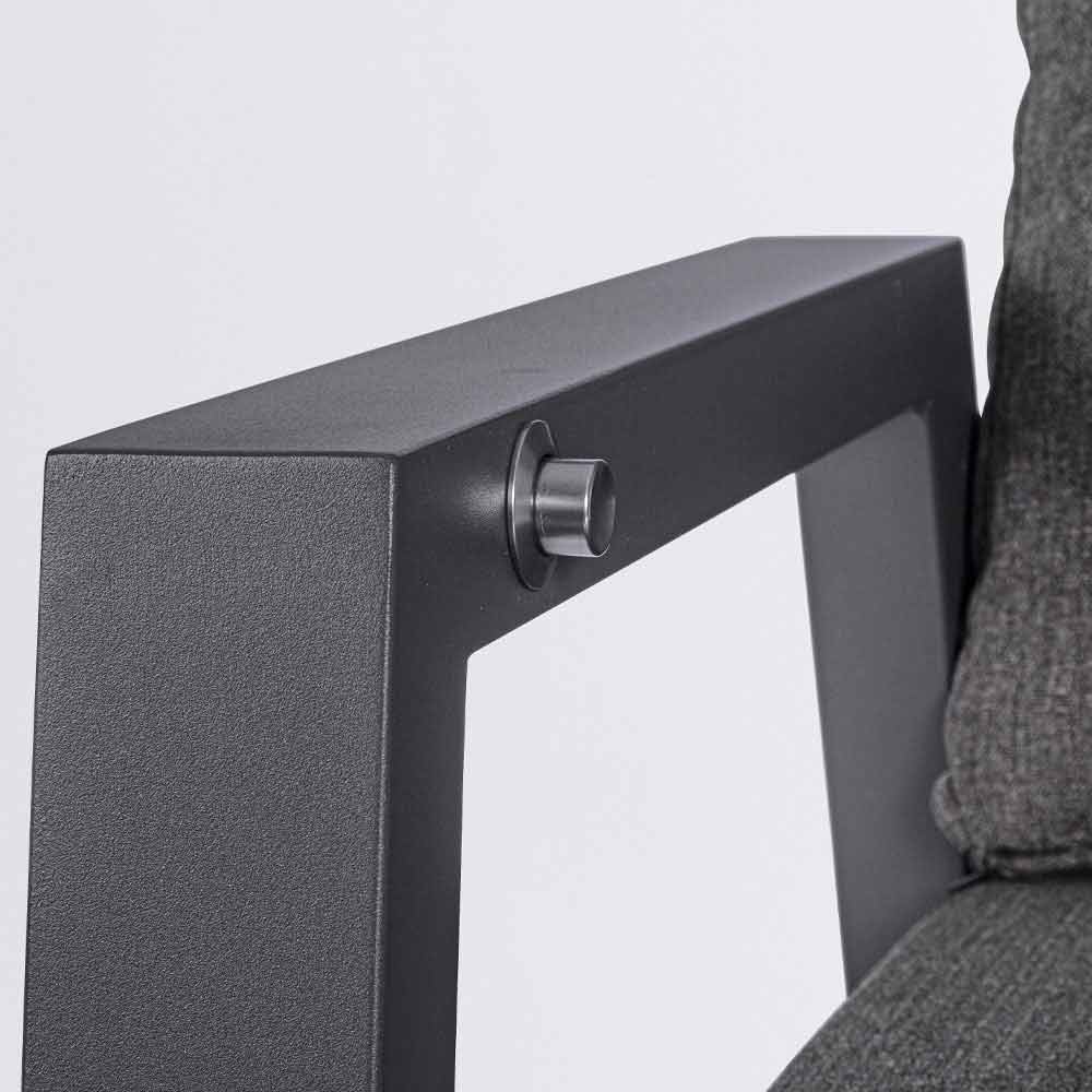 Structură din aluminiu acoperit cu pulbere (poliester). Spătar înclinat în poziție liberă și scaun în textilen 1x1. Perne detașabile cu țesătură olefinică (100% polipropilenă).