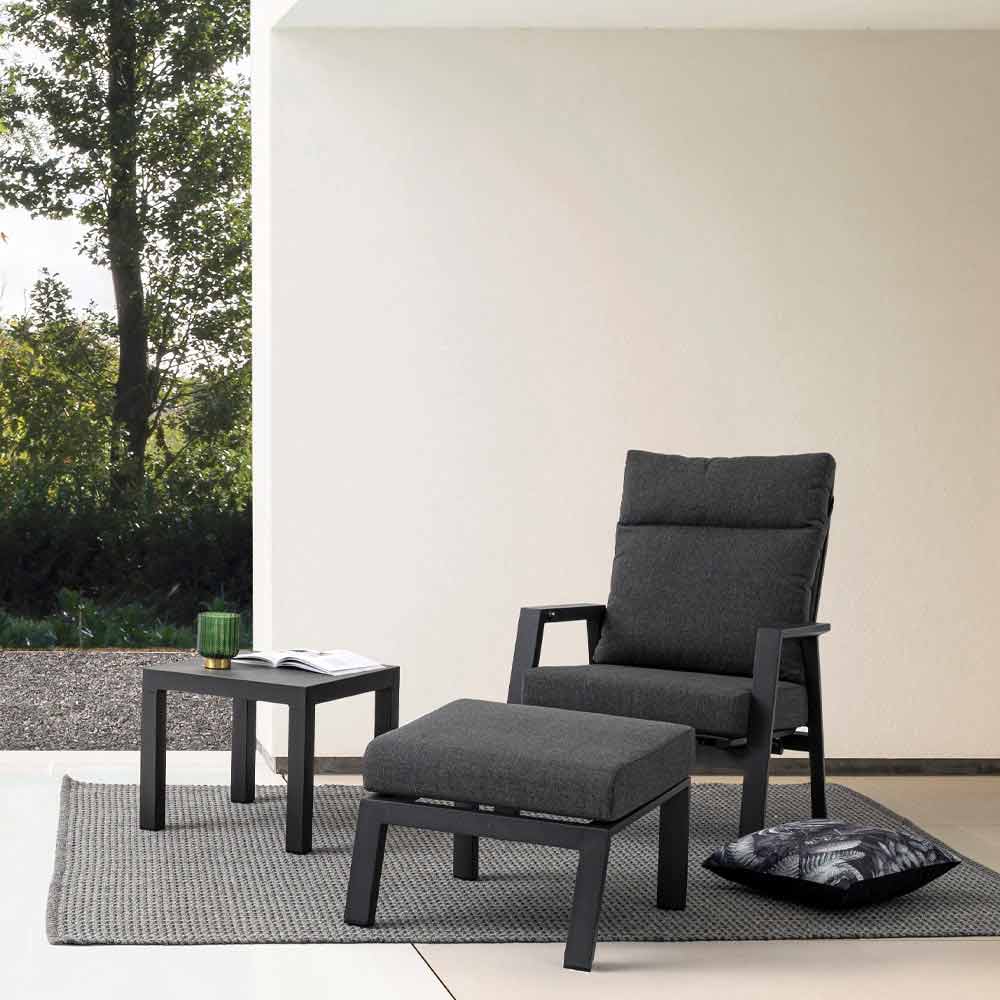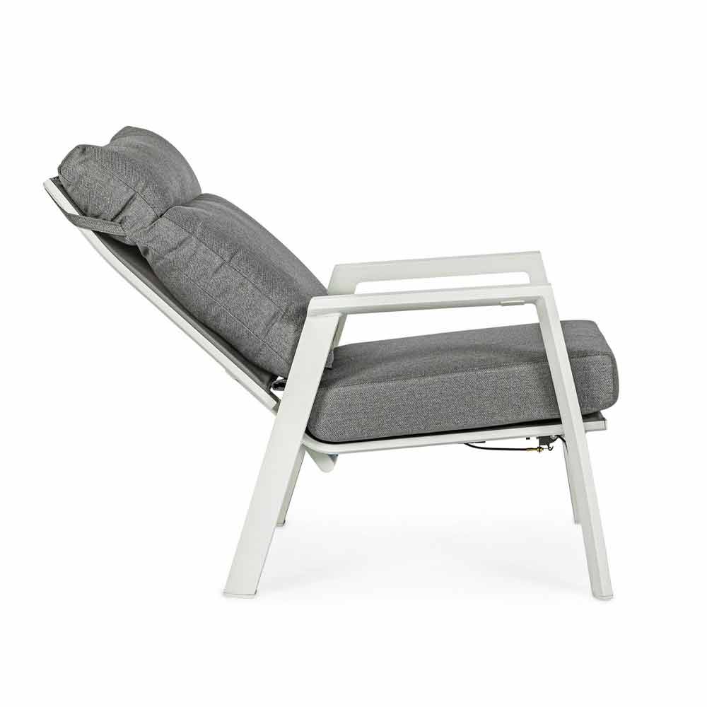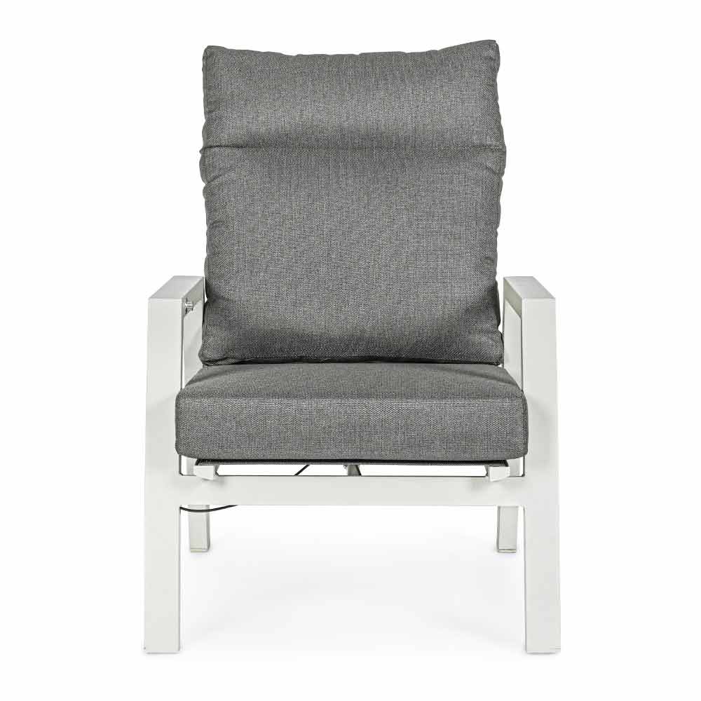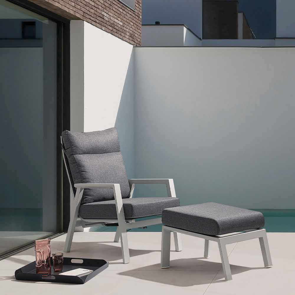 Structură din aluminiu acoperit cu pulbere (poliester). Spătar înclinat în poziție liberă și scaun în textilen 1x1. Perne detașabile cu țesătură olefinică (100% polipropilenă).