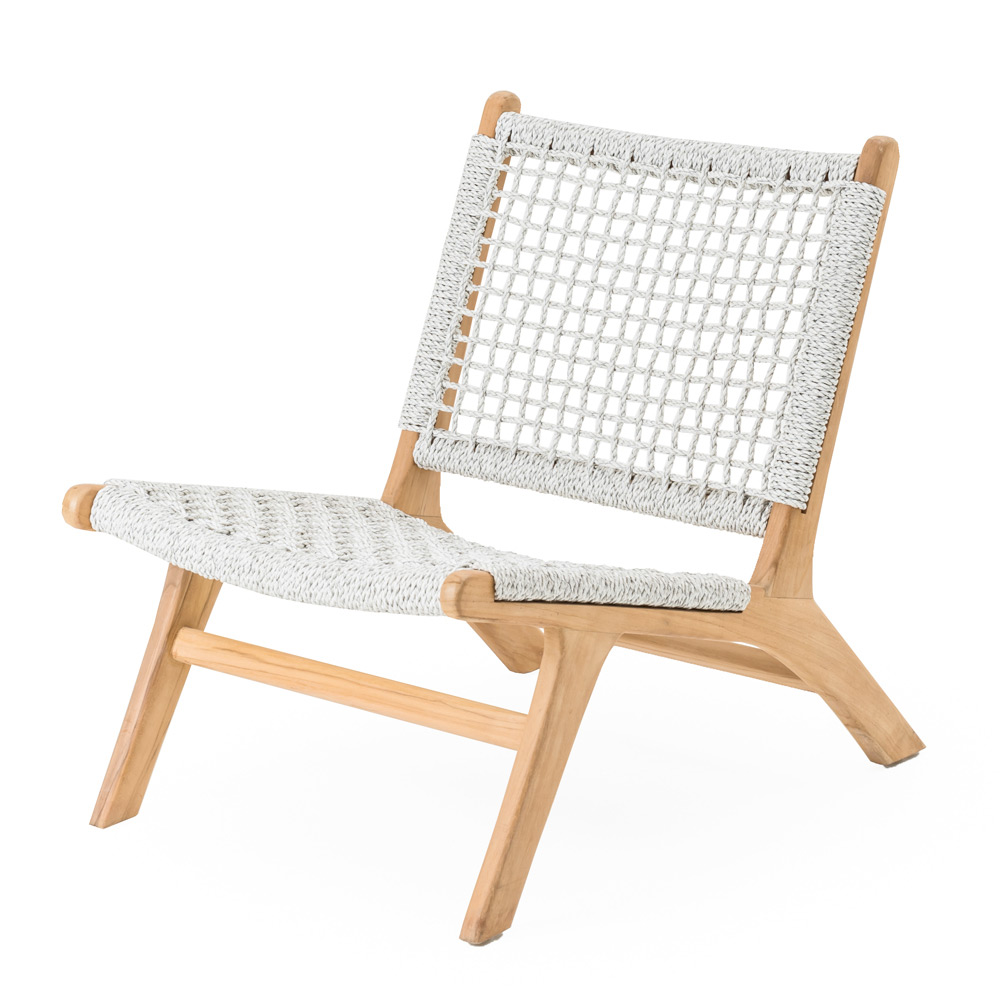 Acest fotoliu combină frumusețea lemnului de tec cu înțelepciunea artizanală a țesutului.