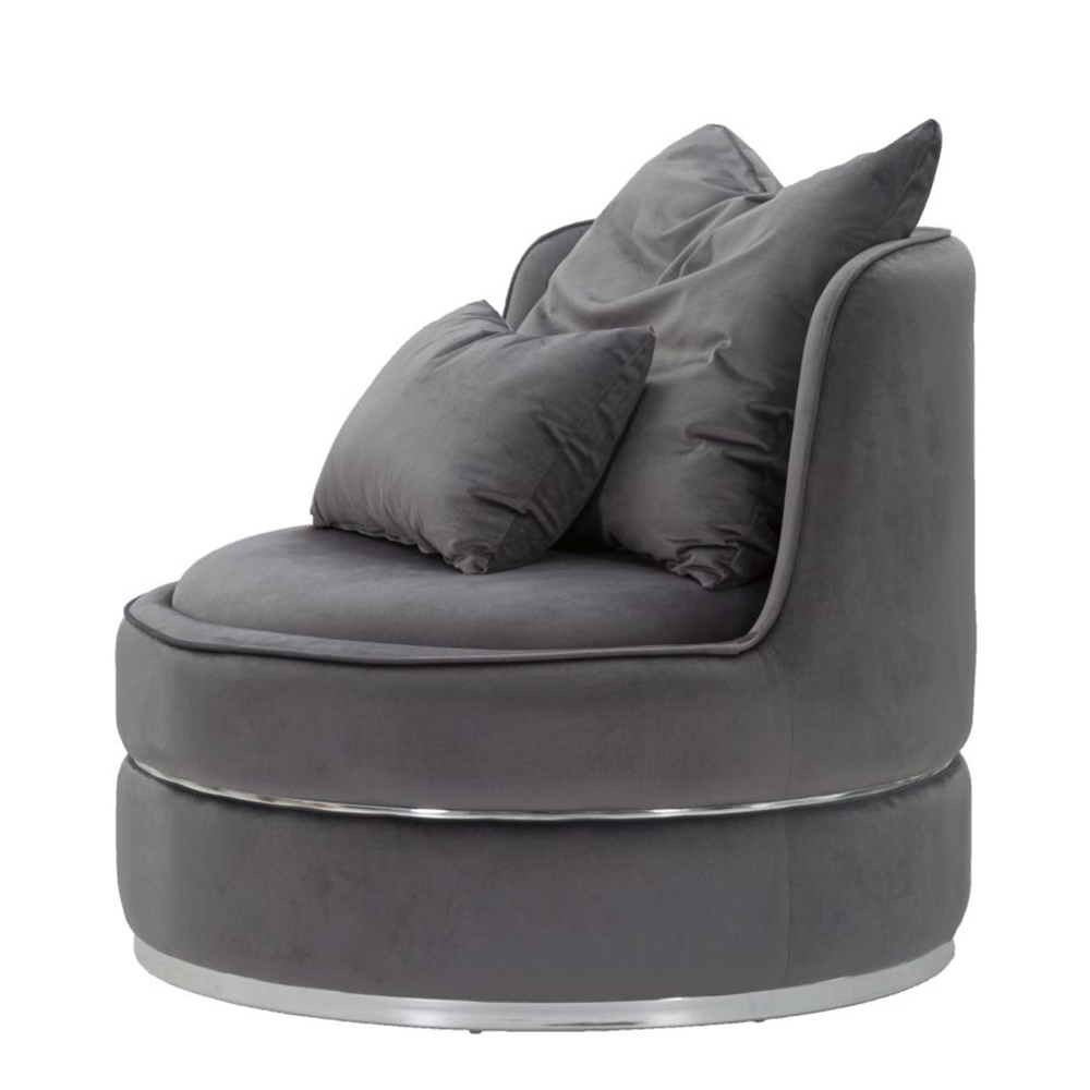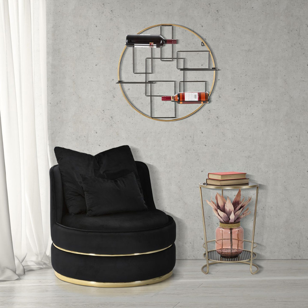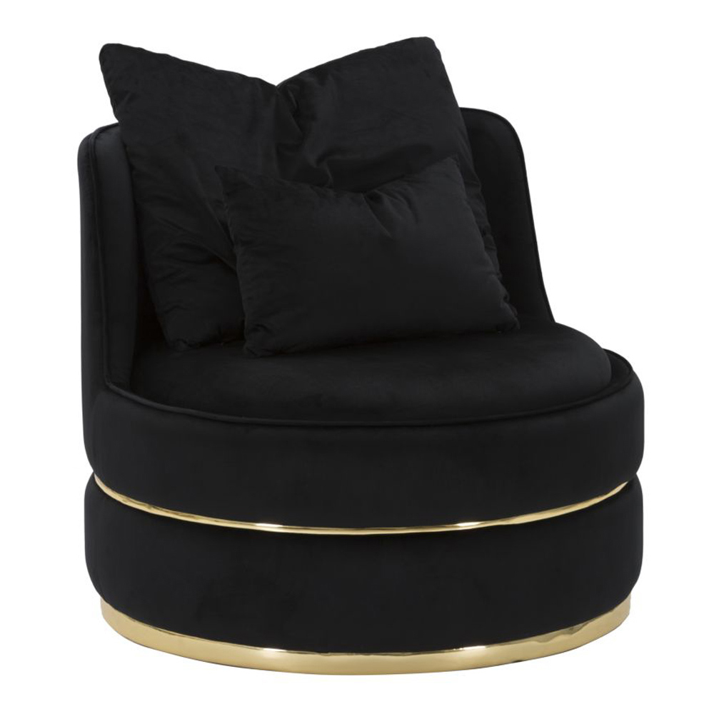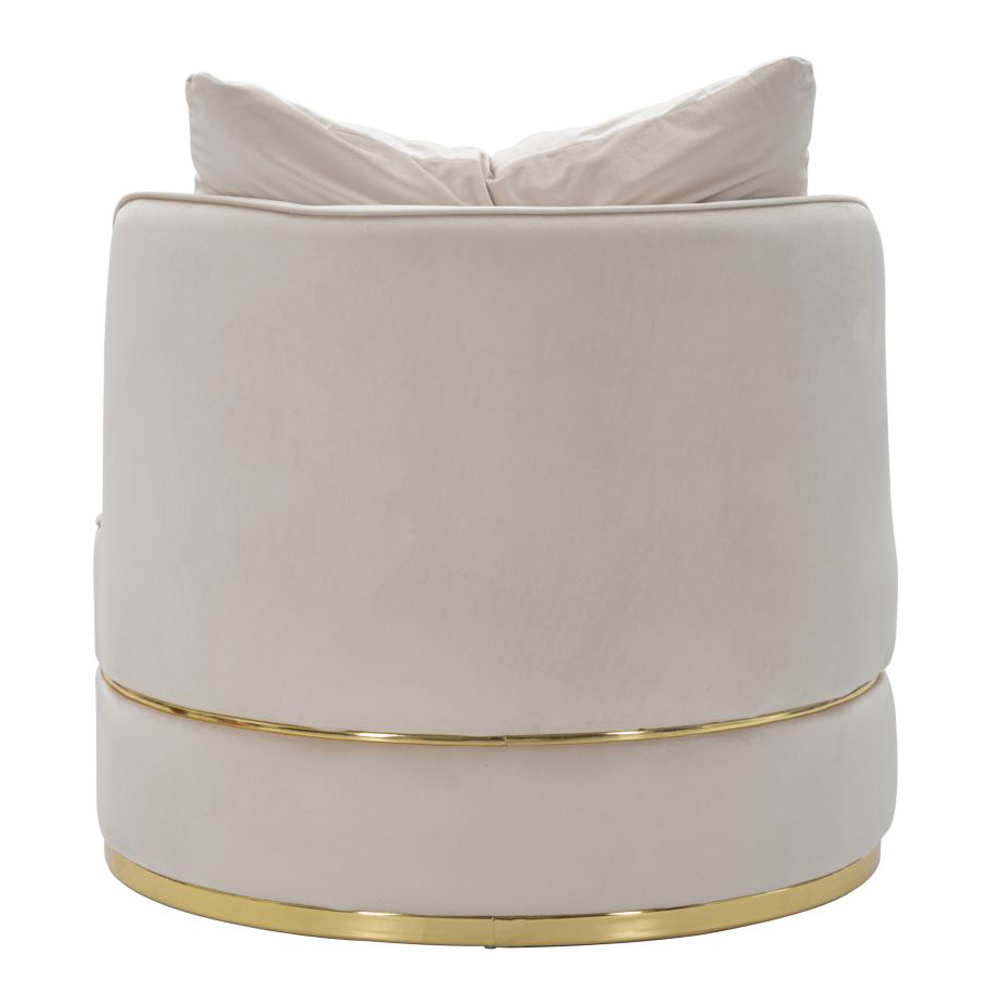 Fotoliu modern de living complet acoperit în țesătură cu detalii aurii sau argintii.