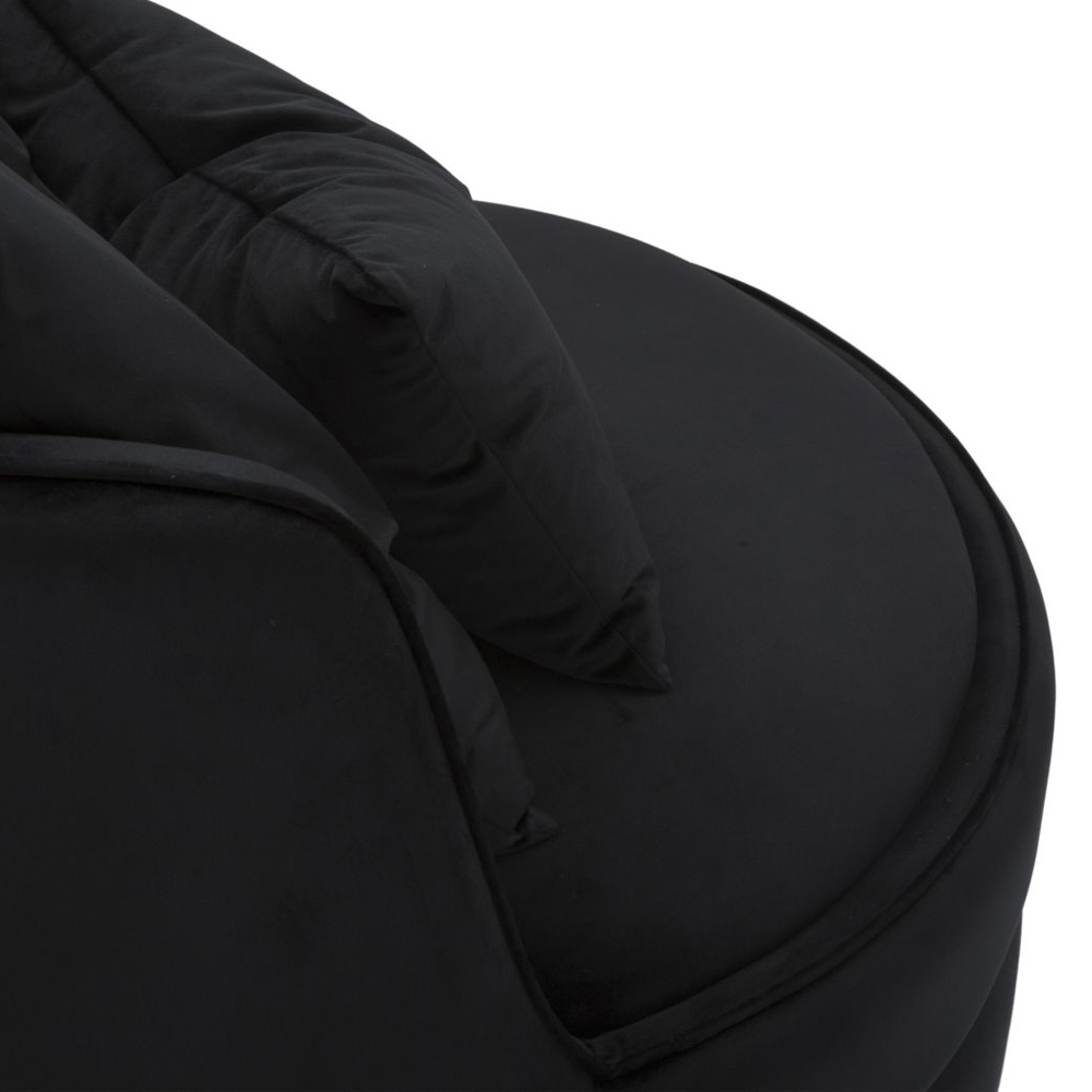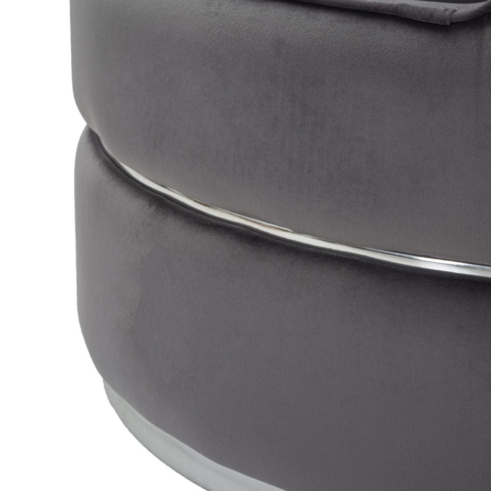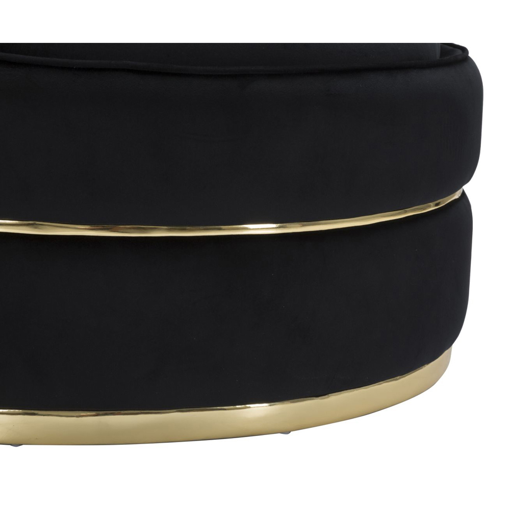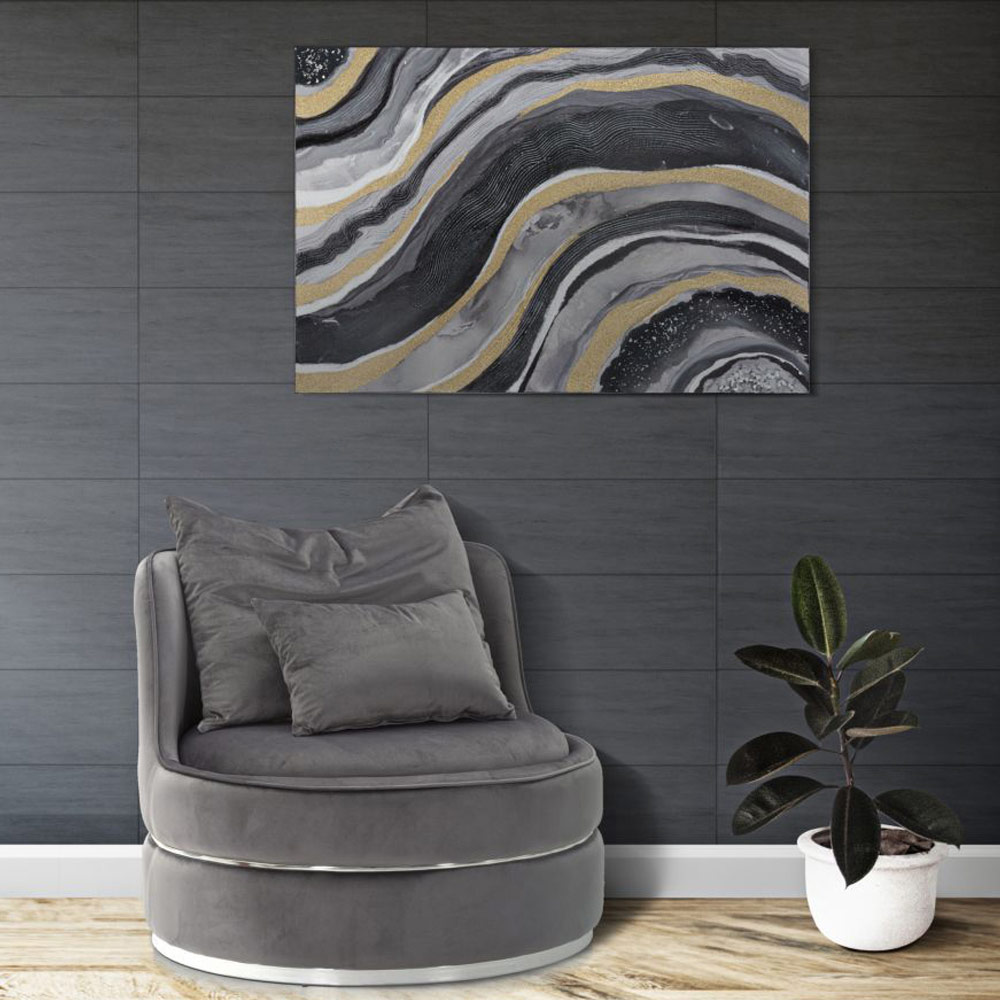 Fotoliu modern de living complet acoperit în țesătură cu detalii aurii sau argintii.