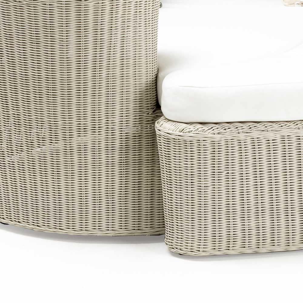 Structura acestui șezlong de exterior este realizată cu un cadru din aluminiu acoperit cu pulbere , pe care este țesută manual fibra Polyrattan de 3 mm grosime marca Rehau . Pernele de șezut și de spătar incluse în culoarea albă standard.