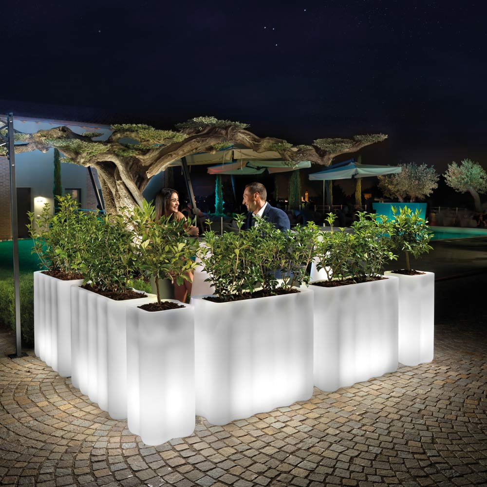 Vaza luminoasa de exterior din polietilena sidefata fabricata in Italia . Lumina LED integrată transformă această vază de exterior într-un accesoriu de mobilier cu linii moi și sinuoase pentru a reflecta o idee de stil clasic, dar incredibil de elegant. Structura include si un kit de scurgere a apei pentru a exploata maximul practic si functionalitatea acestui produs fara a neglija rezultatul final, o atmosfera de lumina eleganta si sugestiva.