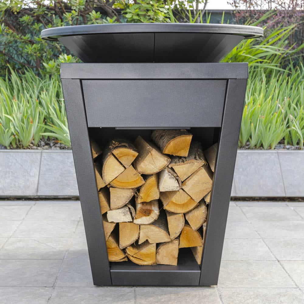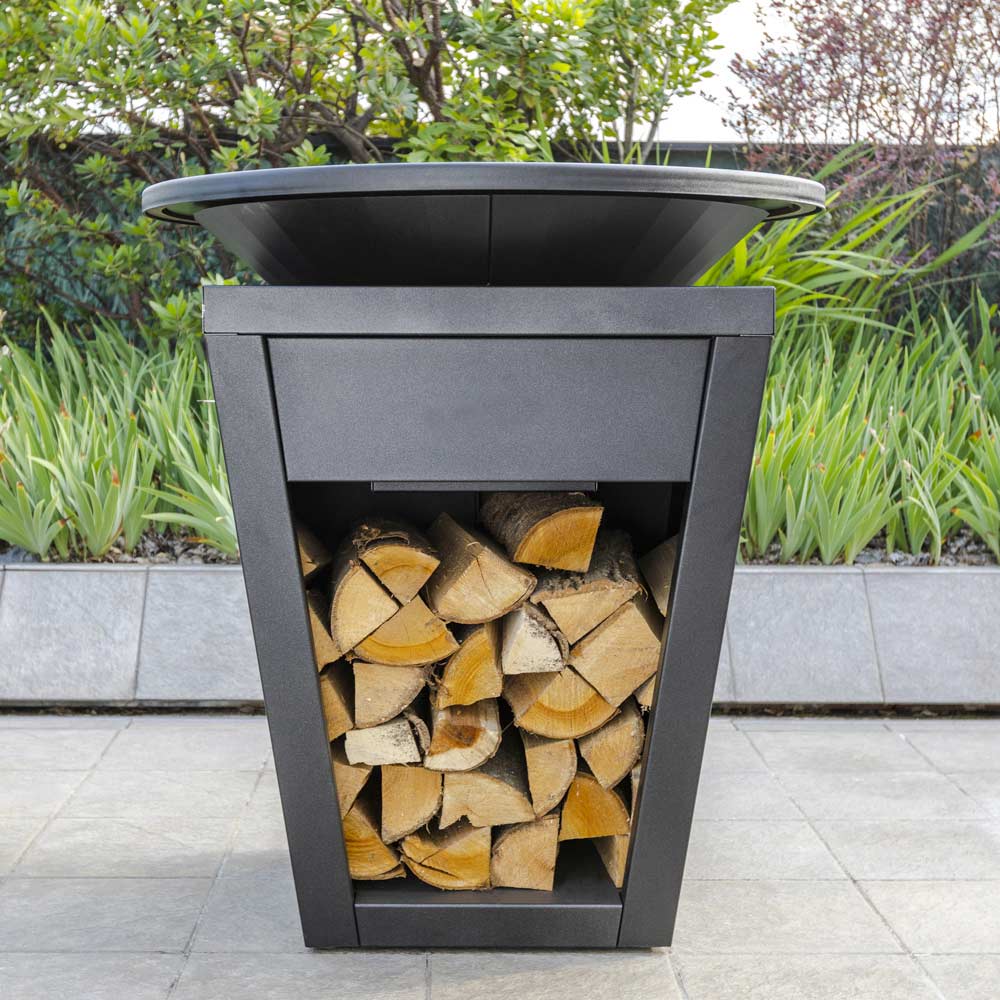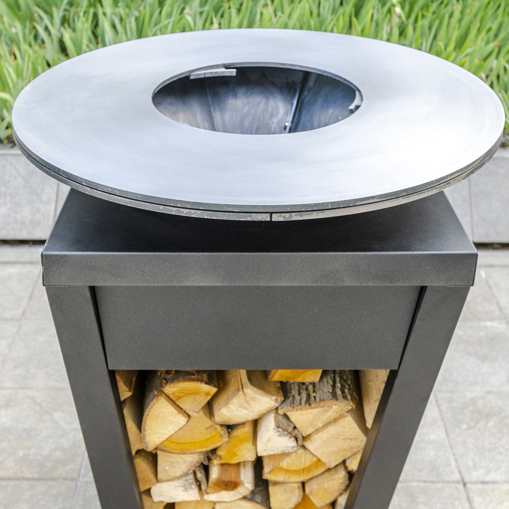 Grătar de ardere în aer liber de design multi-echipat: compartiment din lemn, farfurie de gătit, compartiment de cenușă și aerisire.