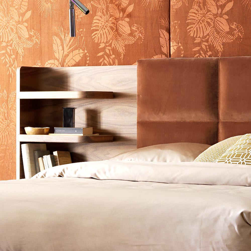 York prezintă o structură de placaj curbat furată în nuc canaletto, rama de pat și rafturile sunt în nuca solidă canaletto.