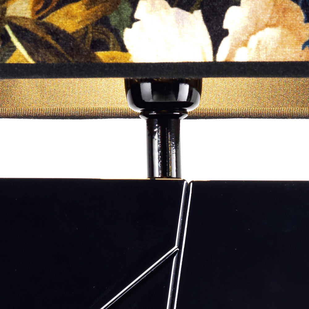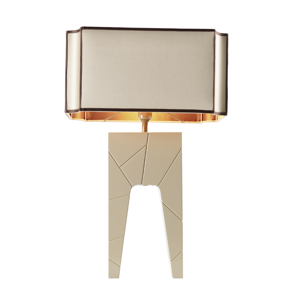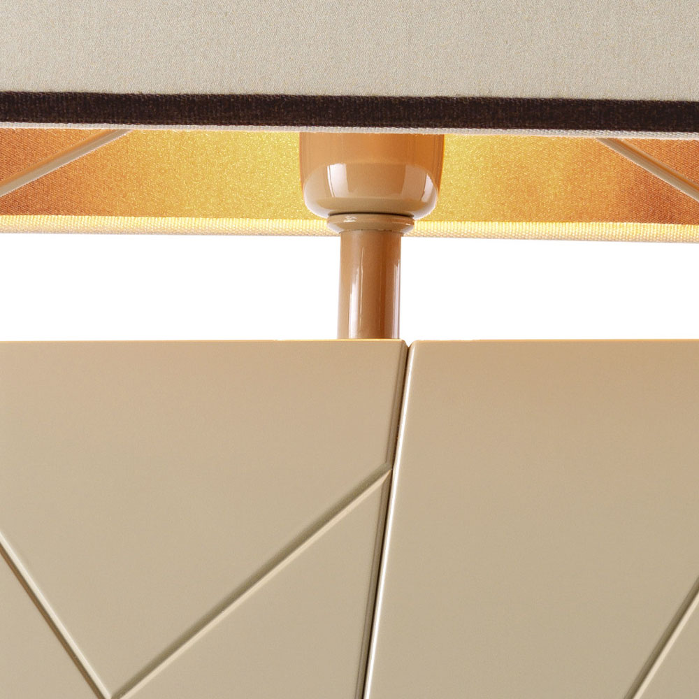 Lampa Zarafa are o structură solidă din lemn masiv lacuit, aleasă între două culori bej și negru cu o pălărie de material.
