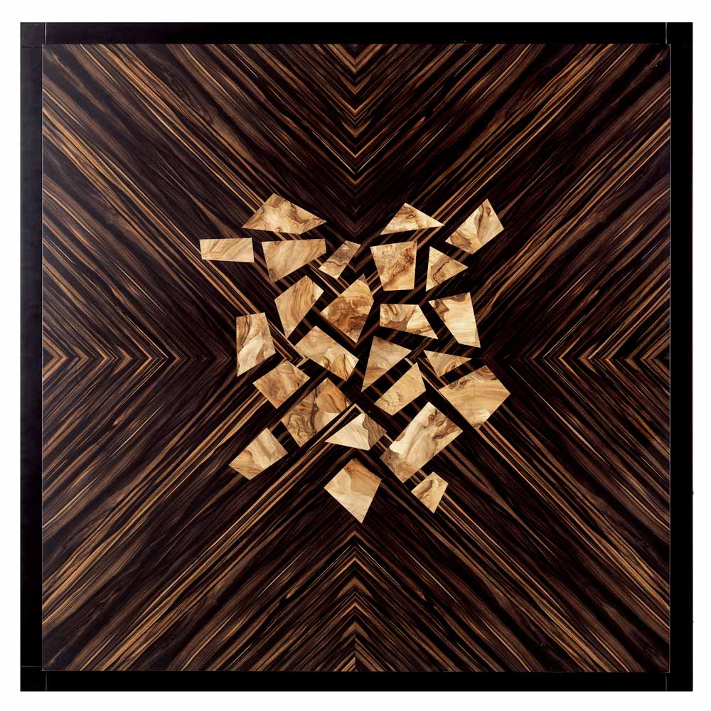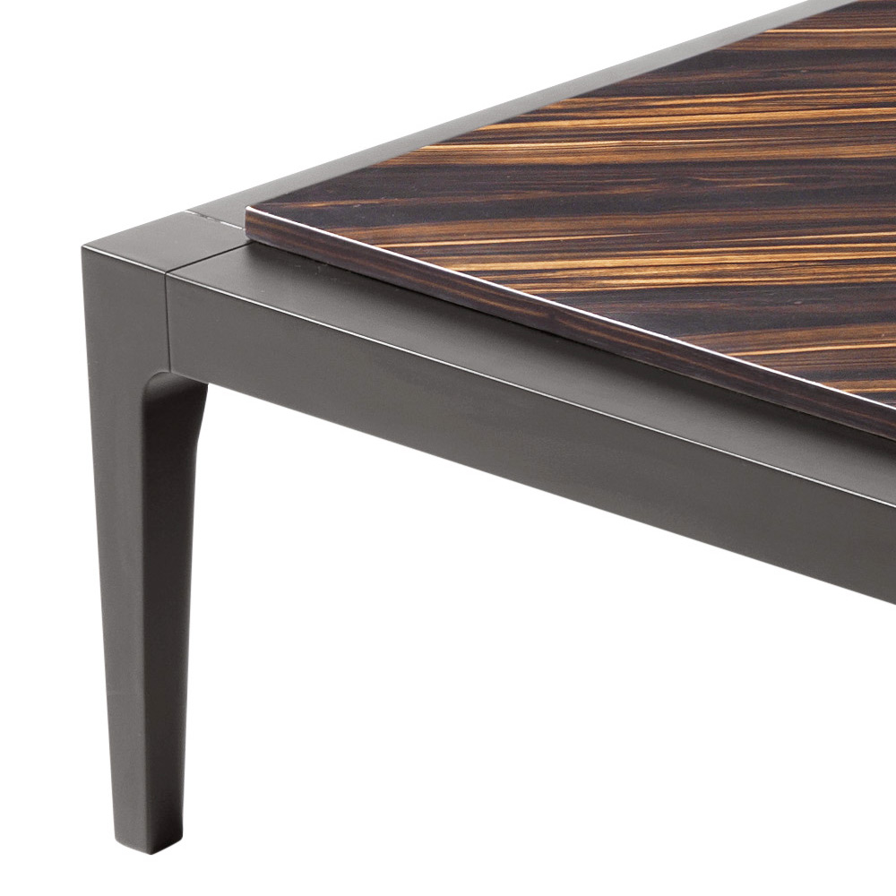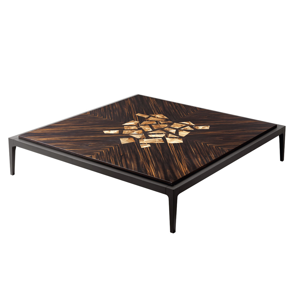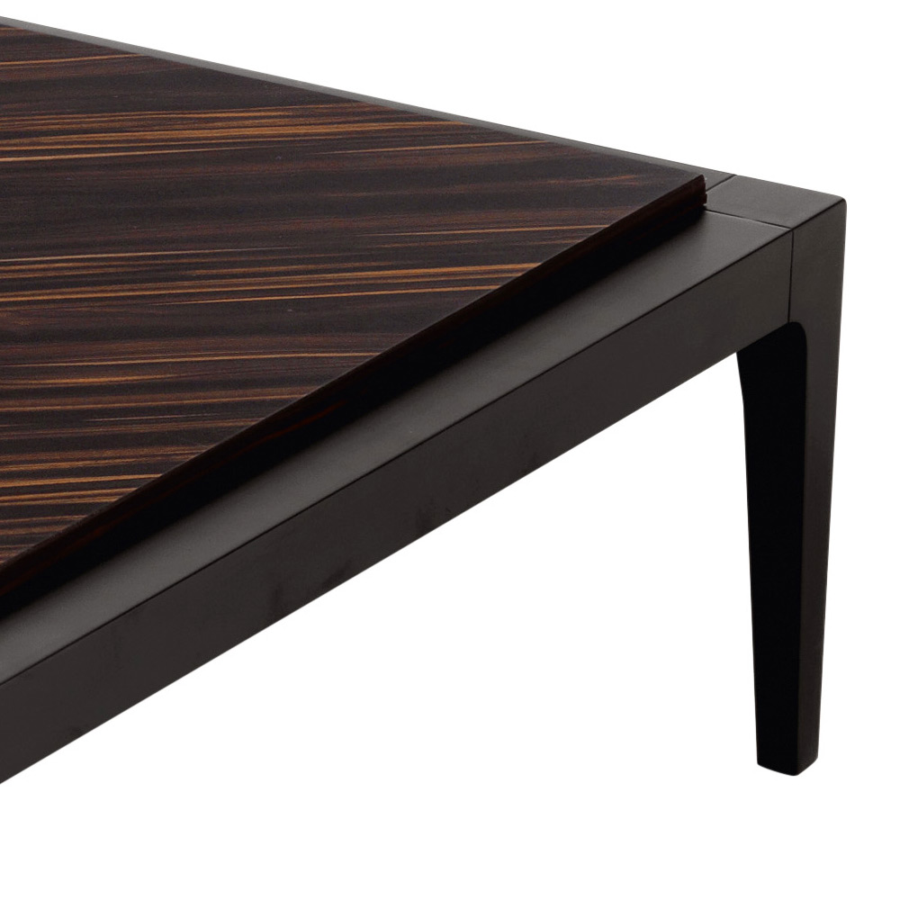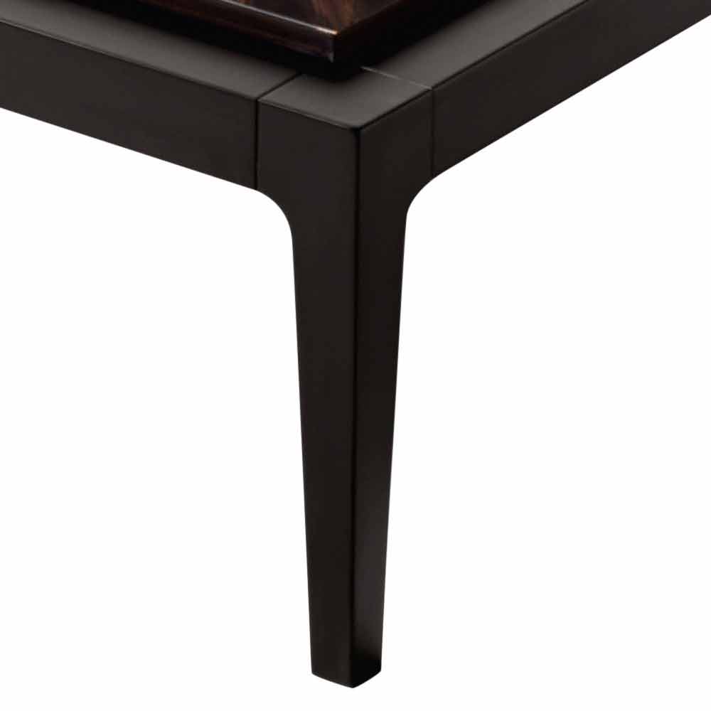 Masa de cafea pătrată Zarafa are o structură solidă din lemn de tei, acoperită cu furnir de abanos și inserții de coriandru din lemn de nuc de brad.