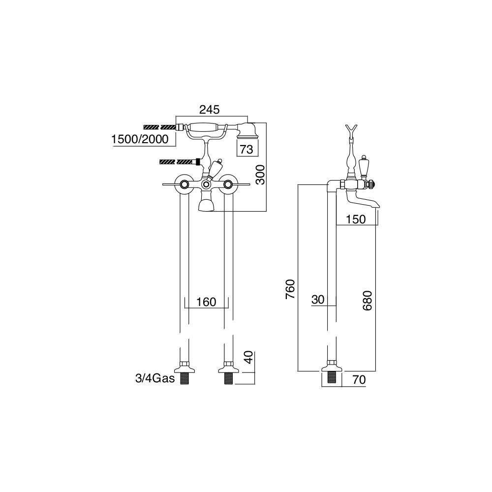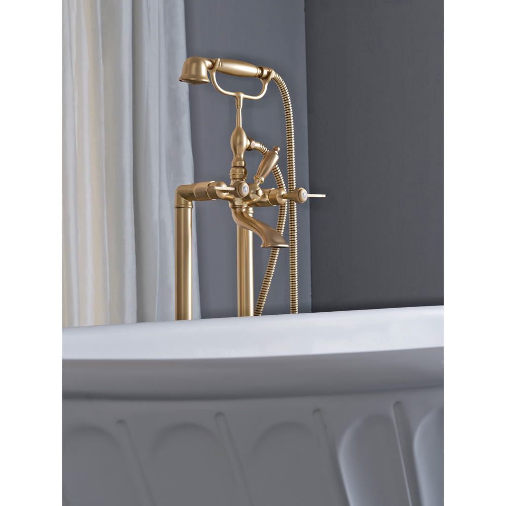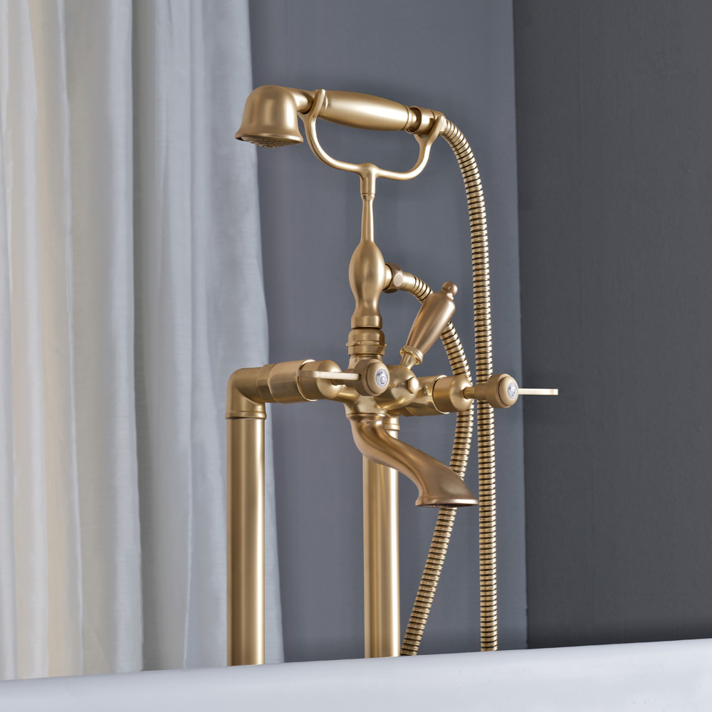 Ansamblu cadă de podea cu duș manual și flexibil, realizat din alamă grea, turnat în matrițe care respectă sistemele meșteșugărești din trecut și protejat cu un strat gros de finisaj alamă mată.
