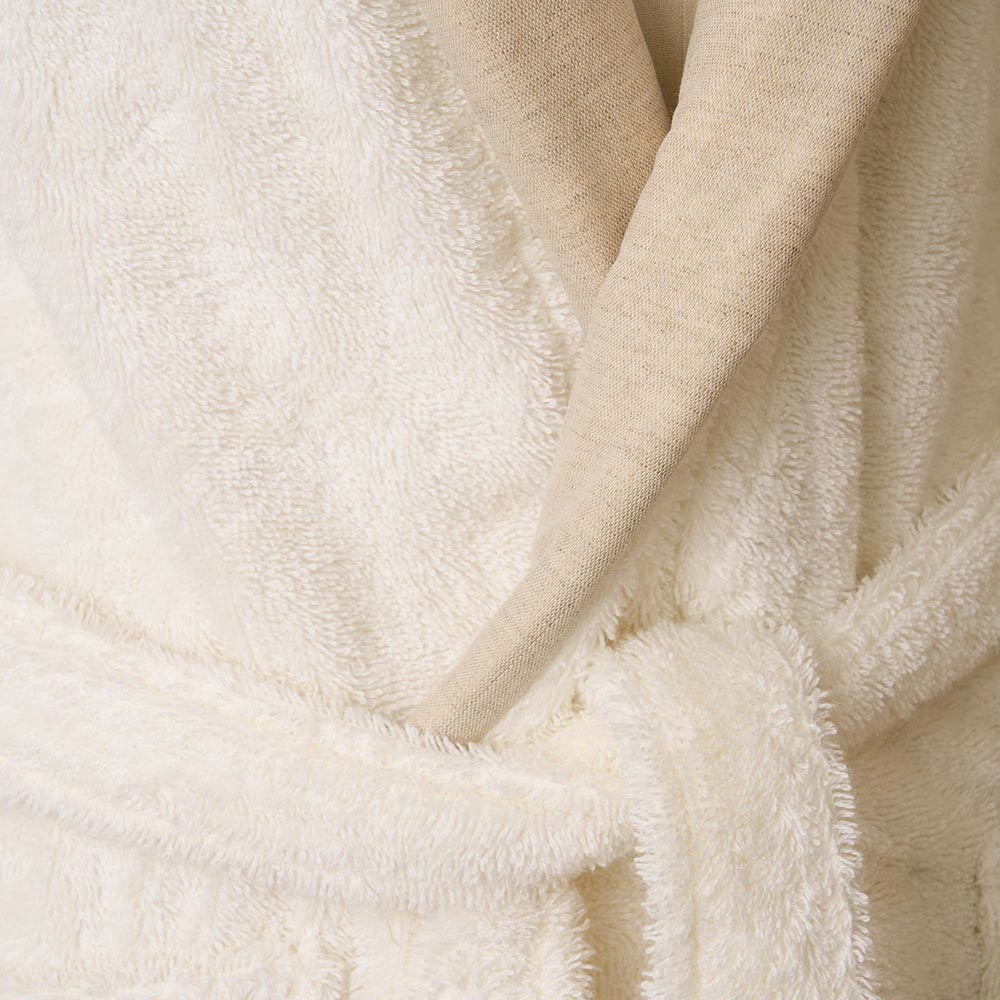 Detaliul care face acest halat de baie cu adevărat special este volanul din in pur , care nu numai că adaugă un element decorativ subtil, ci și un contrast de textură care subliniază măiestria și calitatea înaltă a produsului. Combinația de bumbac și in nu garantează doar durabilitate și rezistență, ci și un confort excepțional, cu o absorbție superioară care te lasă uscat și învelit în dulceață pură.