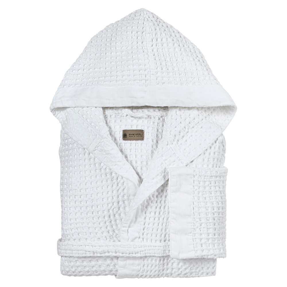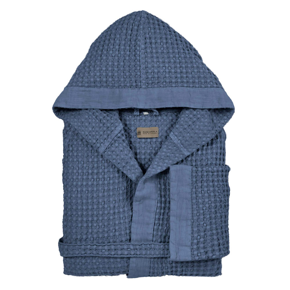 Halat de baie cu glugă din fagure de bumbac cu volan de in, totul vopsit în haine. Senzația șifonată și uzată a țesăturii este esența tehnicii vopsite în haine, iar nuanțele cromatice obținute sunt irepetabile: aceeași baie de vopsea poate crea, de fapt, nuanțe ușor diferite făcându-ți haina unică și exclusivă. Acest articol este fabricat și ambalat în Italia conform tradiției textile artizanale toscane.