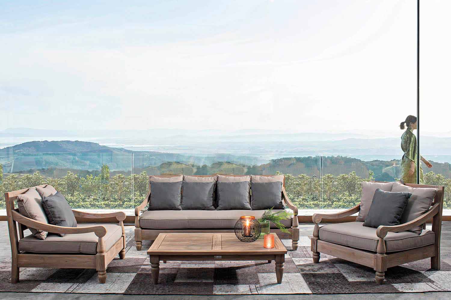 100% FSC lemn de tec, finisat cu nisip și îmbătrânit pe bază de apă. Pernele amovibile cu țesătură olefină izolată la soare (100% polipropilenă).