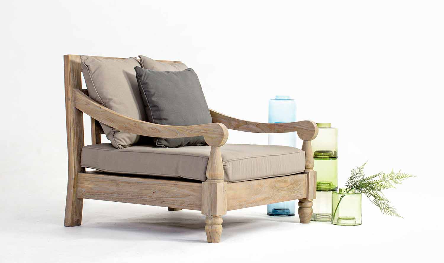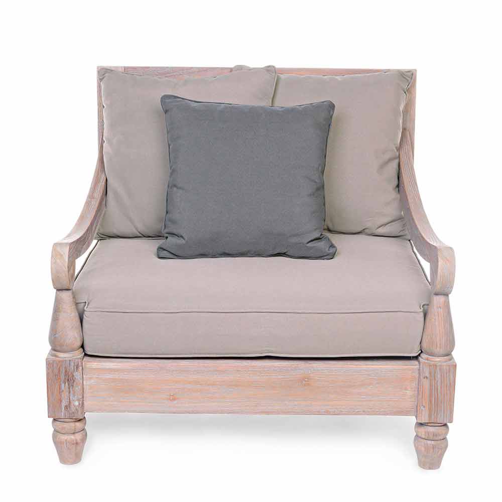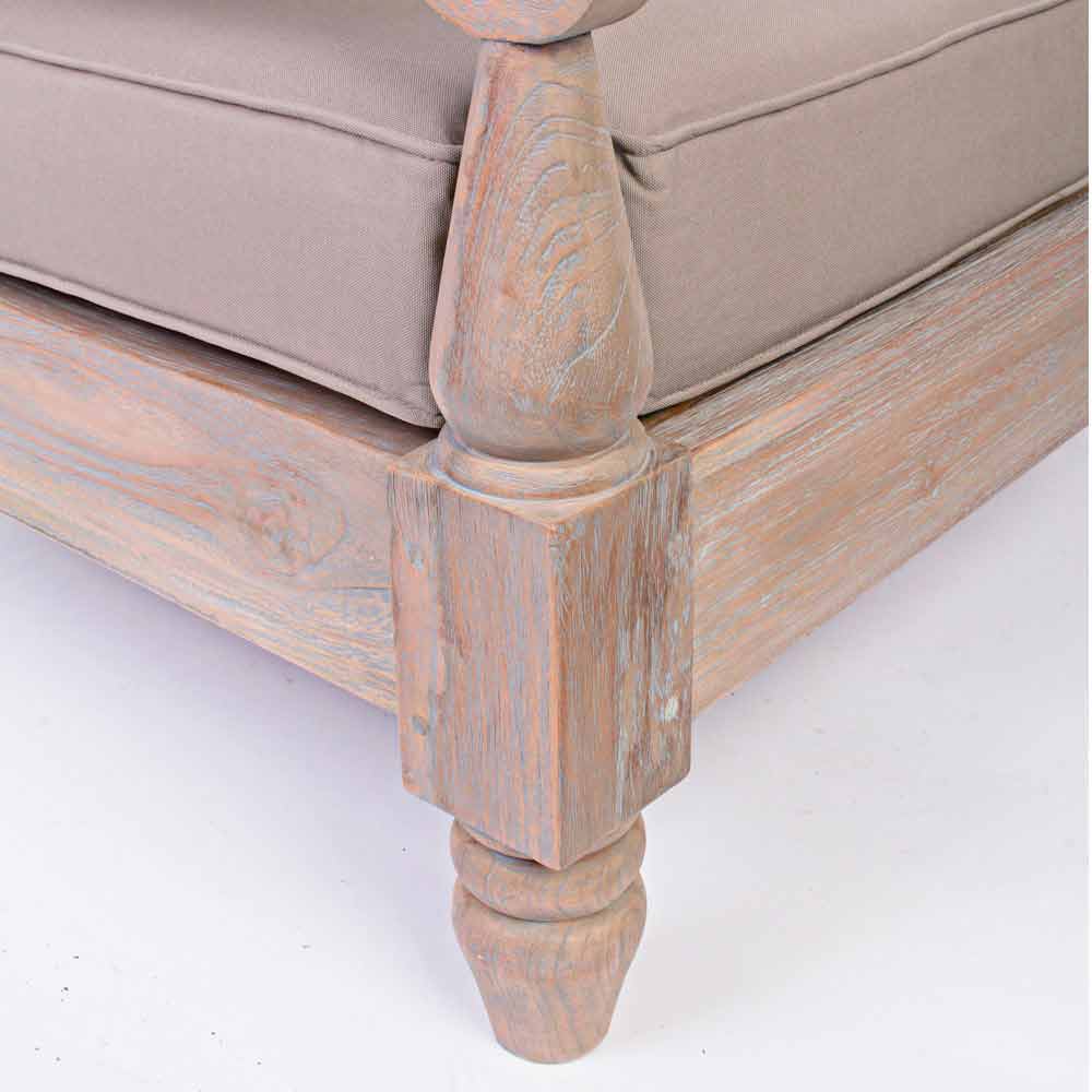 Fotoliu exterior în stil rustic, confecționat din lemn de tec, cu perne de țesătură detașabile.