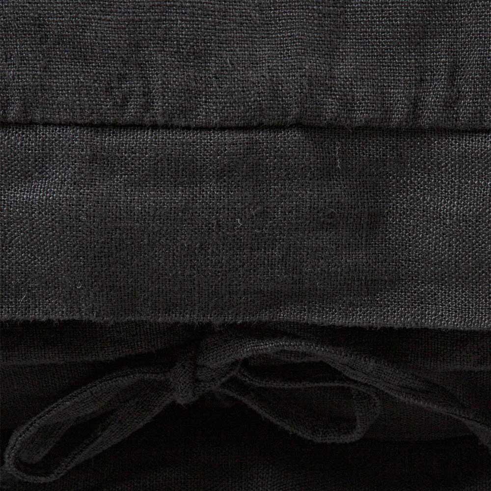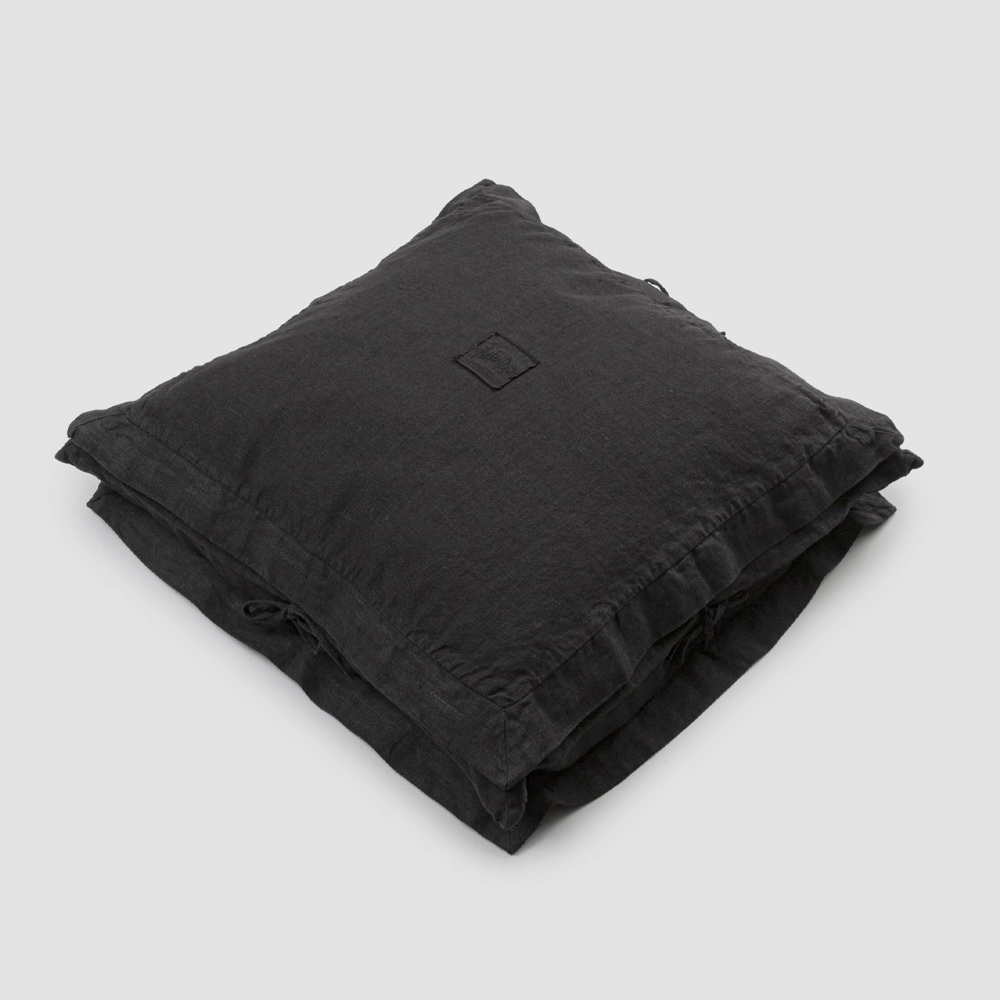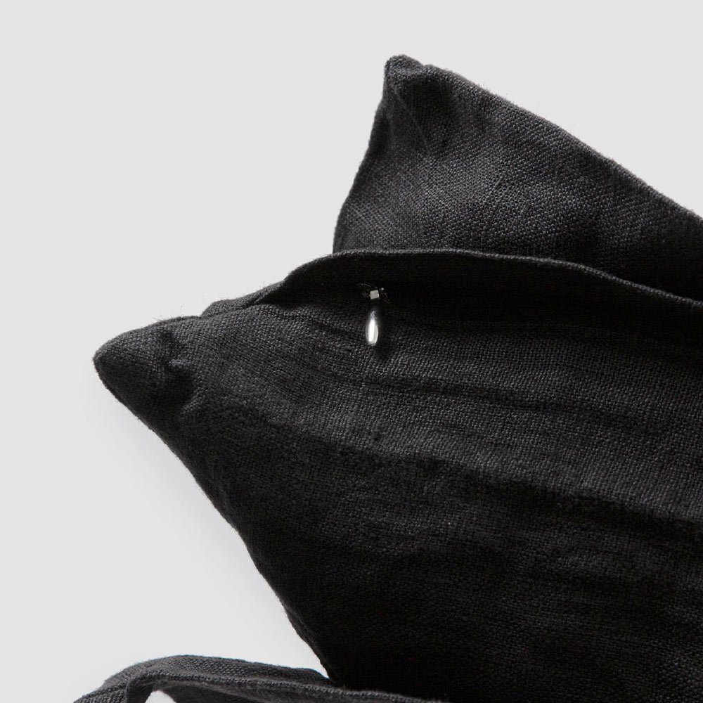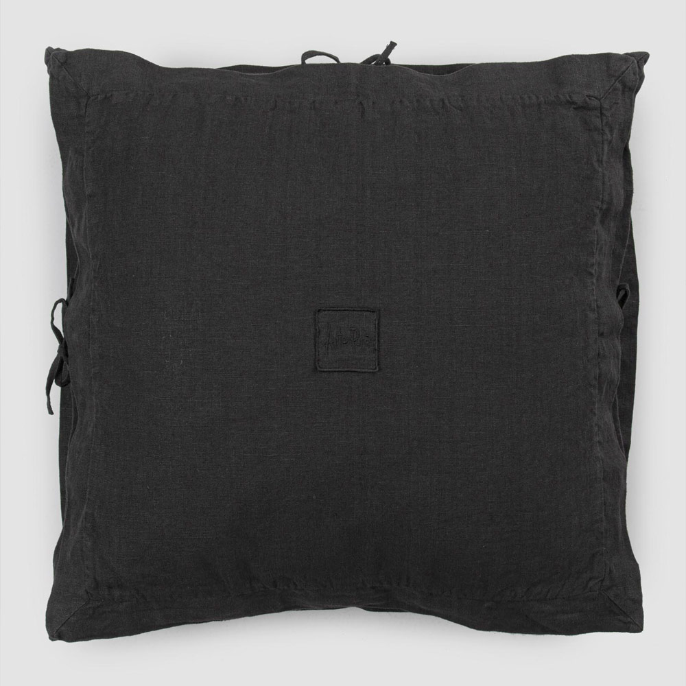 Valoarea tradiției se alătură stilului de viață modern cu această față de pernă din in negru și greu, cu decorațiuni pătrate și cravate pe laturi.